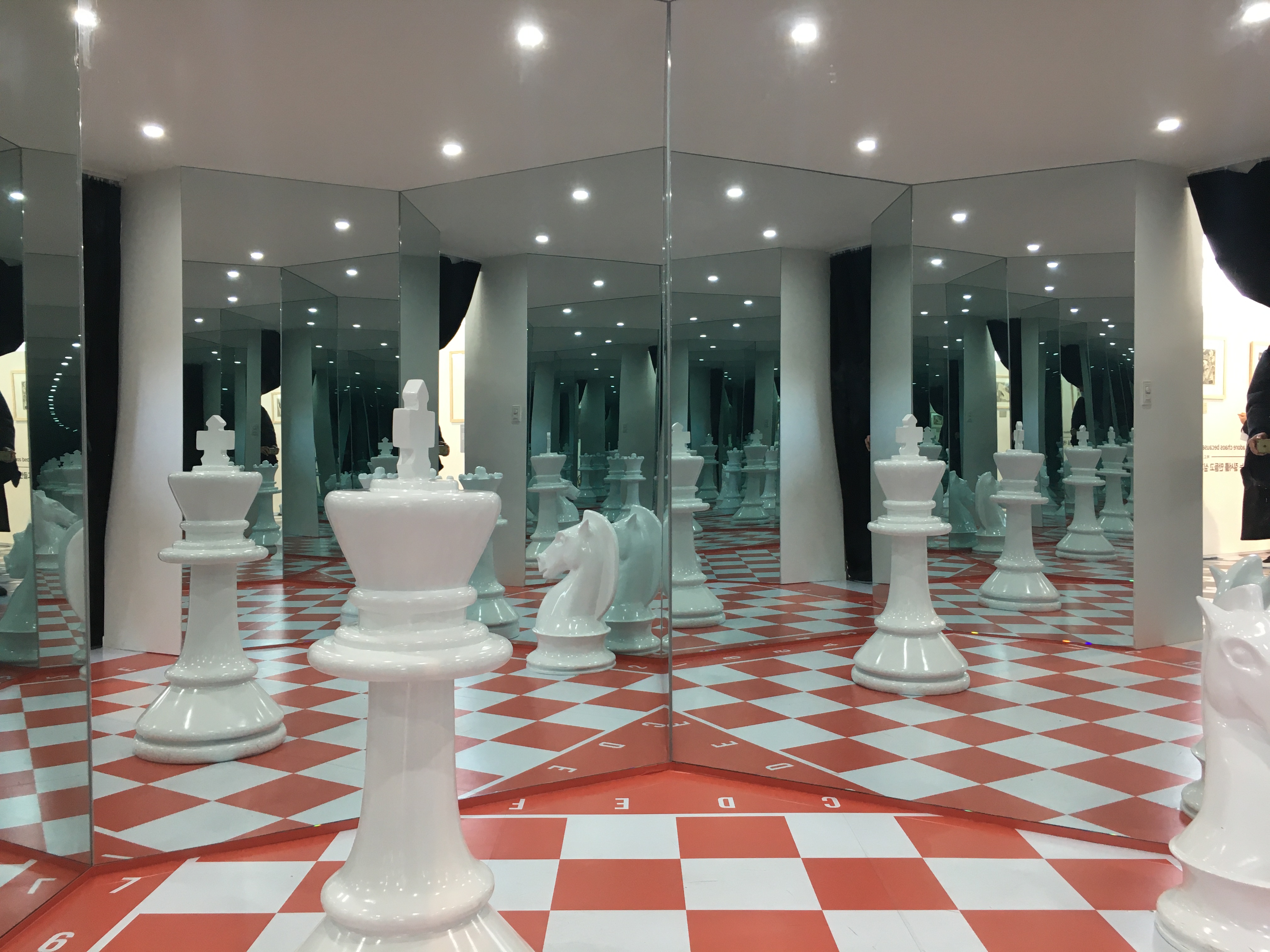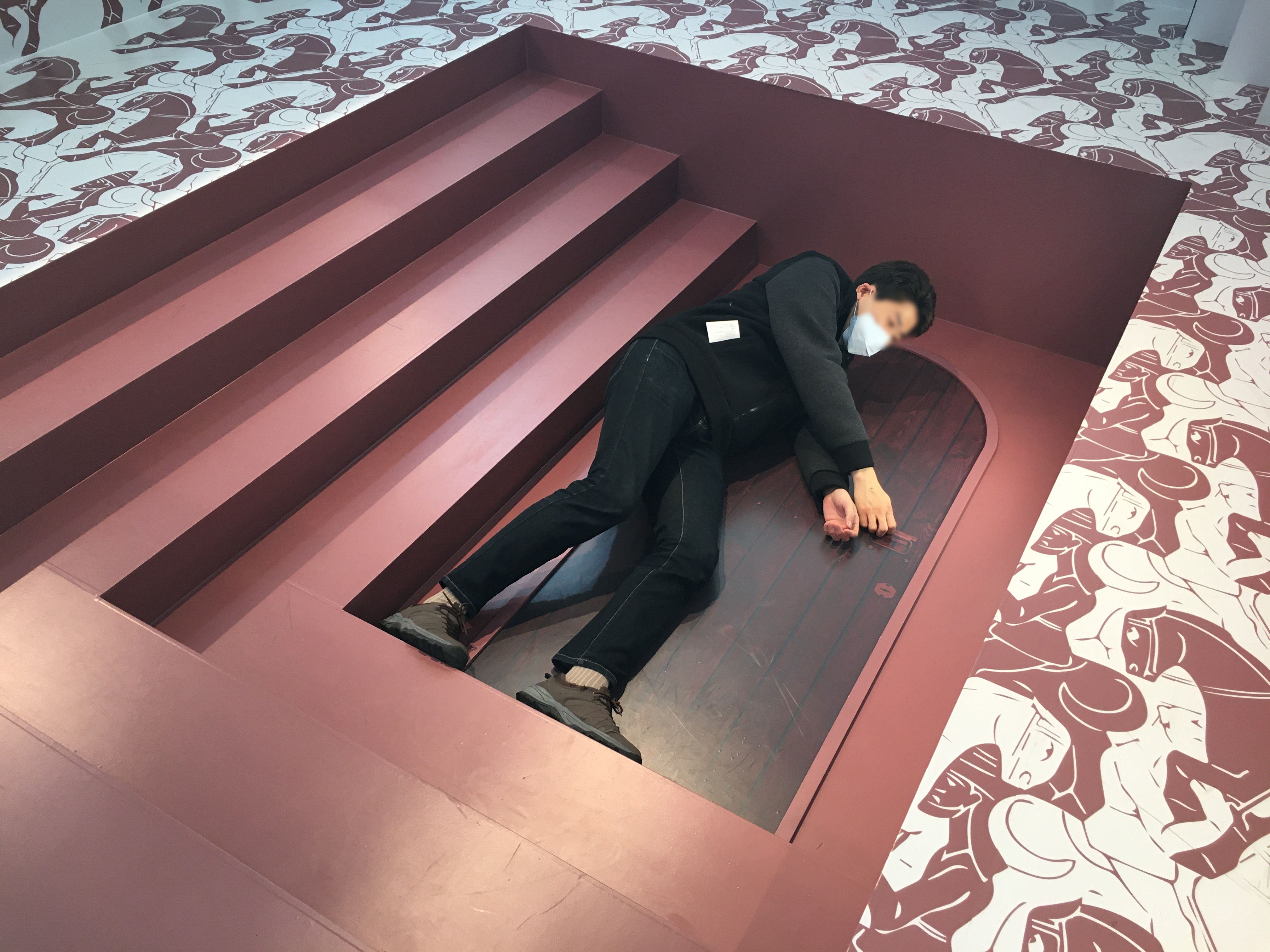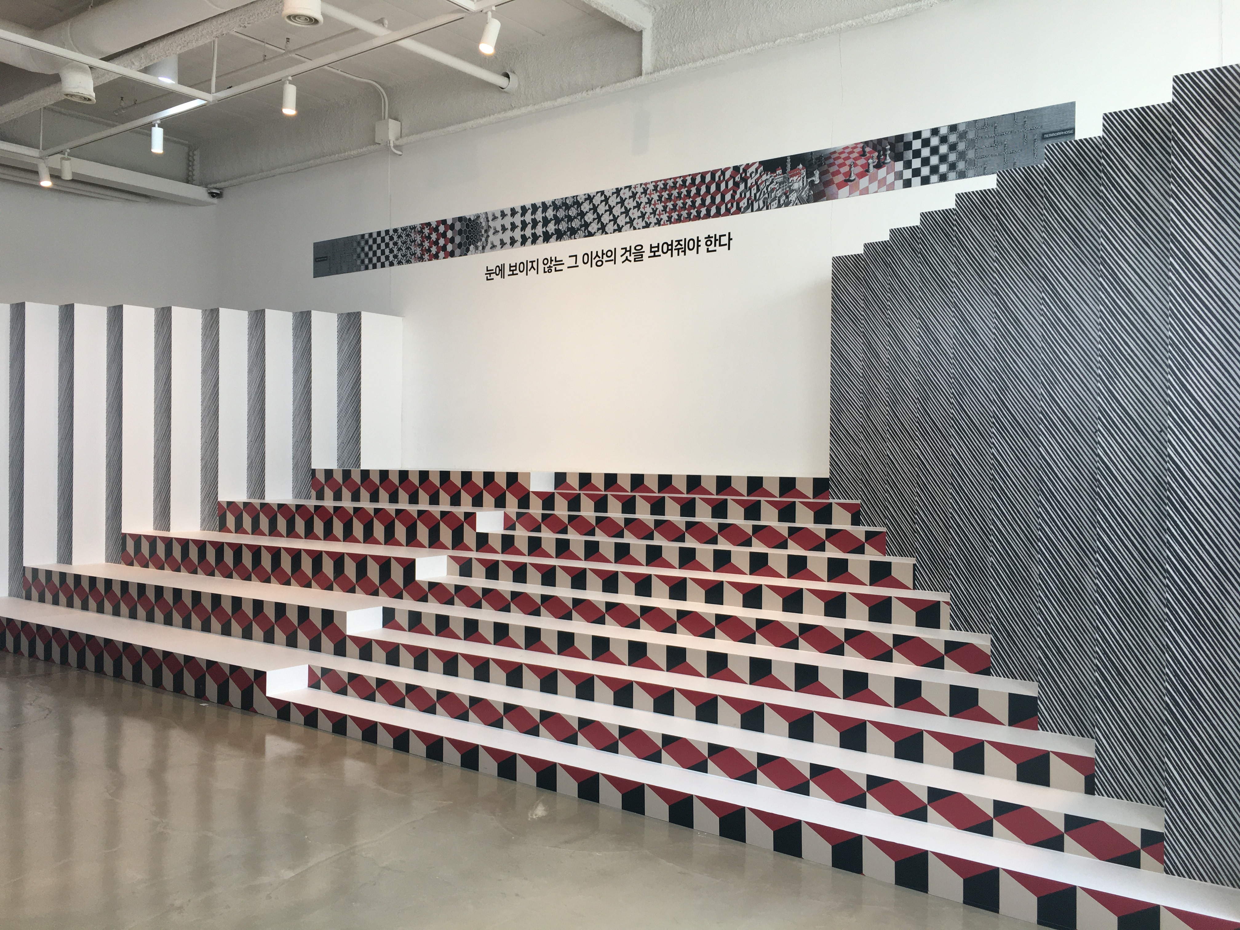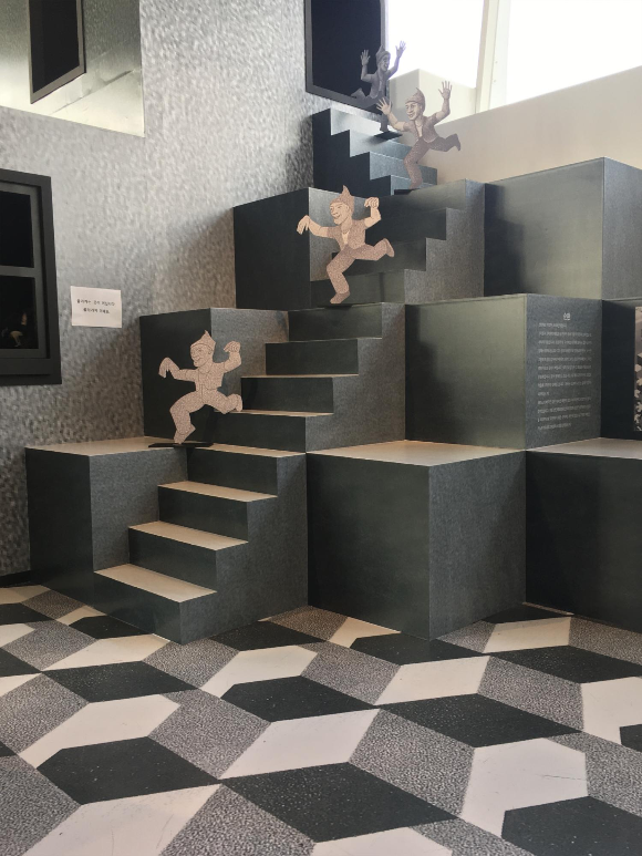 전시장 중앙에는 직접 에셔의 작품 속으로 들어가 또 다른 작품을 체험할 수 있는 구조물이 설치되어 있어요. 위에서 언급한 에셔의 작품 ‘올라가기와 내려가기’를 재현해 놓았는데, 끊임없이 두 공간이 상호작용하는 그림 속으로 들어가면 기존의 상식으로 생각해온 사고의 경계가 깨져나가는 것 같답니다.