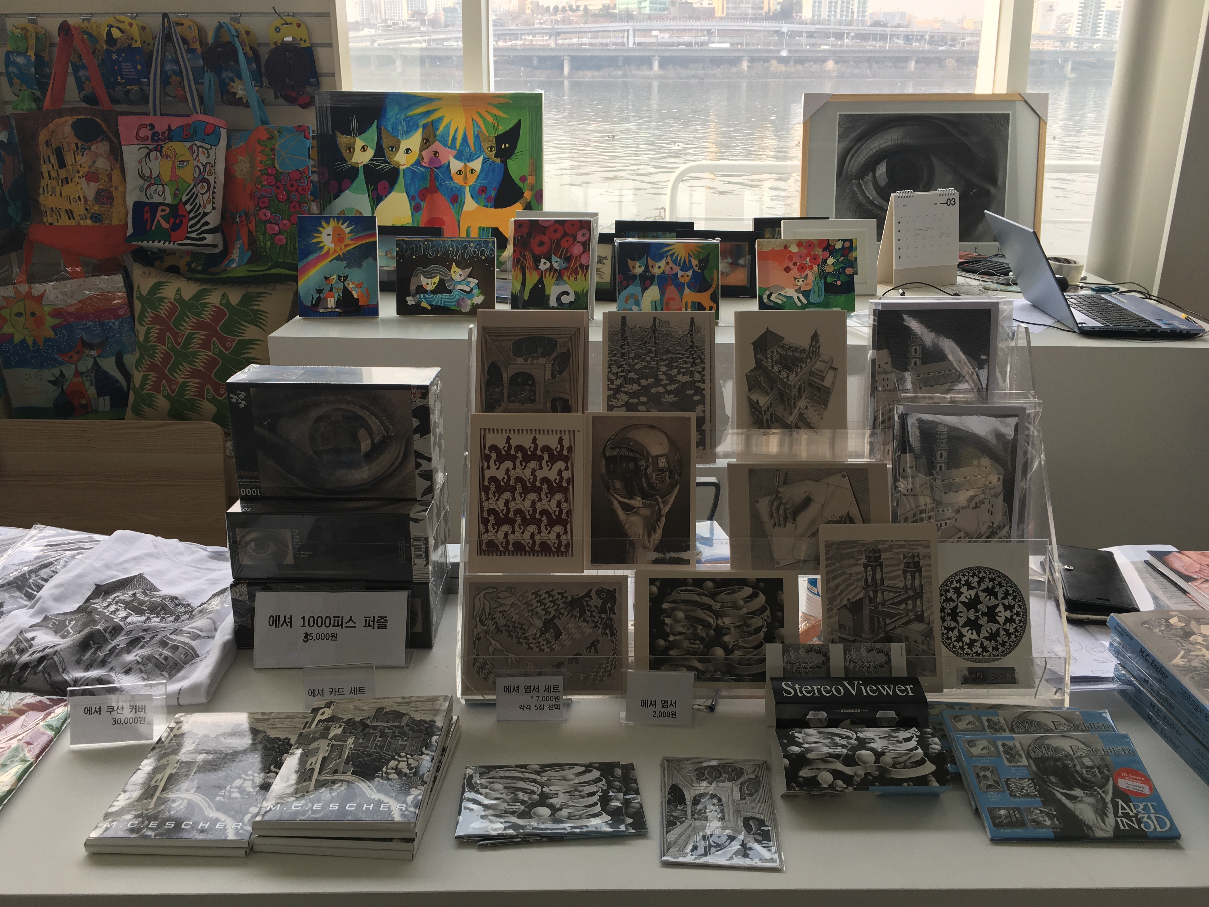 전시를 보고 출구로 나오면 기념품을 살 수 있는 곳도 마련되어 있어요. 동동이도 가장 인상적이었던 작품 ‘세 개의 세계’ 엽서를 한 장 구매했어요.