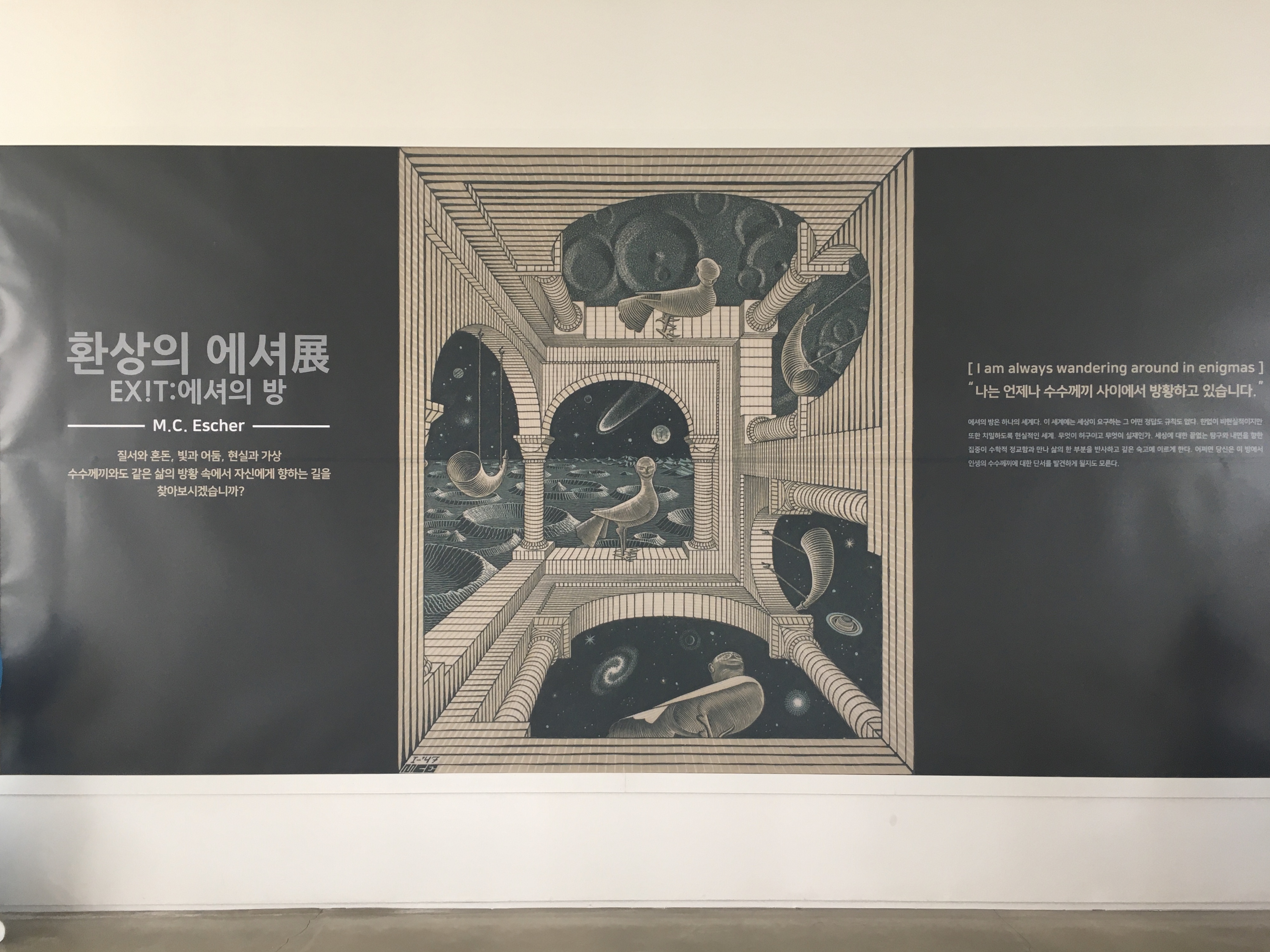 <환상의 에셔전, EXIT : 에셔의 방>은 미술에 수학과 과학을 접목한 에셔의 '기하학적 구조'와 '환영의 공간'을 전시 공간에서 재창조하여 예술가의 이성적인 논리와 날카로운 통찰력을 엿볼 수 있고, 지적인 충만감을 선사하는 체험전이에요. 치밀한 과학적 조작이라는 이성적 구조에 기초하여 초현실을 다루는 에셔의 예술 세계는 미술에 조예가 없거나 관심이 별로 없더라도 흥미롭고 가볍게 관람할 수 있답니다.