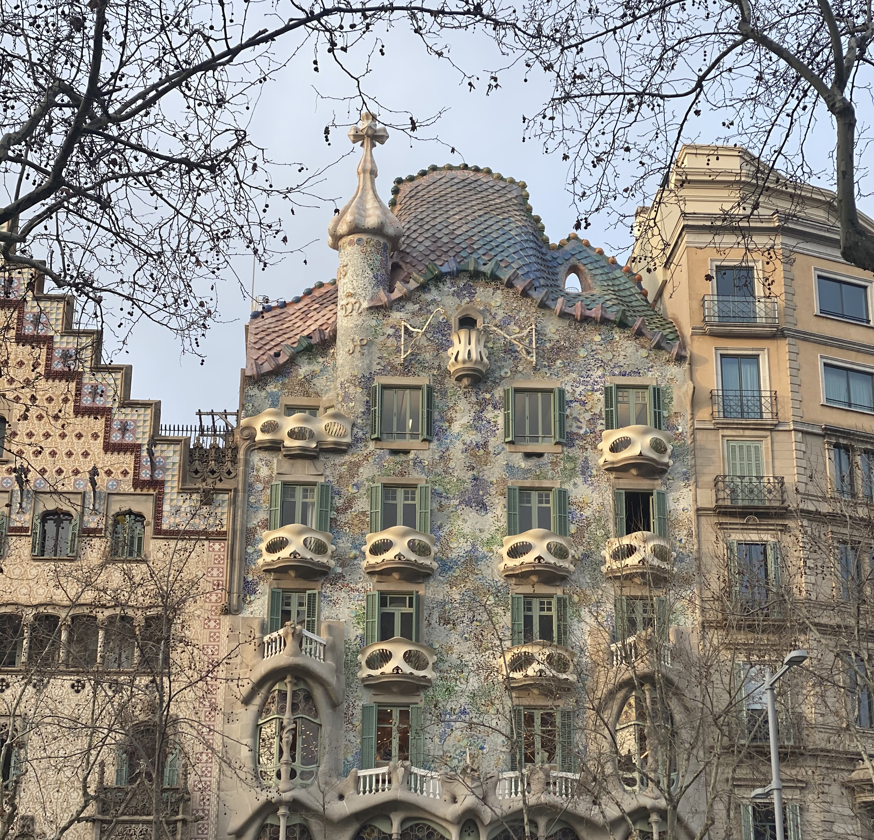 가이드님께서 가우디 건축물에 얽힌 이야기들을 너무 재미있게 해주셔서 여행 내내 한편의 동화를 듣는 듯한 기분이 들었어요. ‘까사바트요’는 ‘뼈의 집’이라고 불렸던 가우디의 작품이에요. 지금은 모든 사람들이 그의 의도를 해석하고 즐거워하는 반면, 당시에는 너무 파격적이다 보니 가우디의 건축물들은 초반에는 사람들이 좋아하지 않았다고 해요. 뼈의 집에는 용에게 잡힌 공주, 그리고 공주를 구하러 간 기사의 이야기가 숨어 있어요. 이야기를 다 듣고 나면 건축물 곳곳에 숨겨진 이야기 속 오브제가 눈에 들어온답니다.