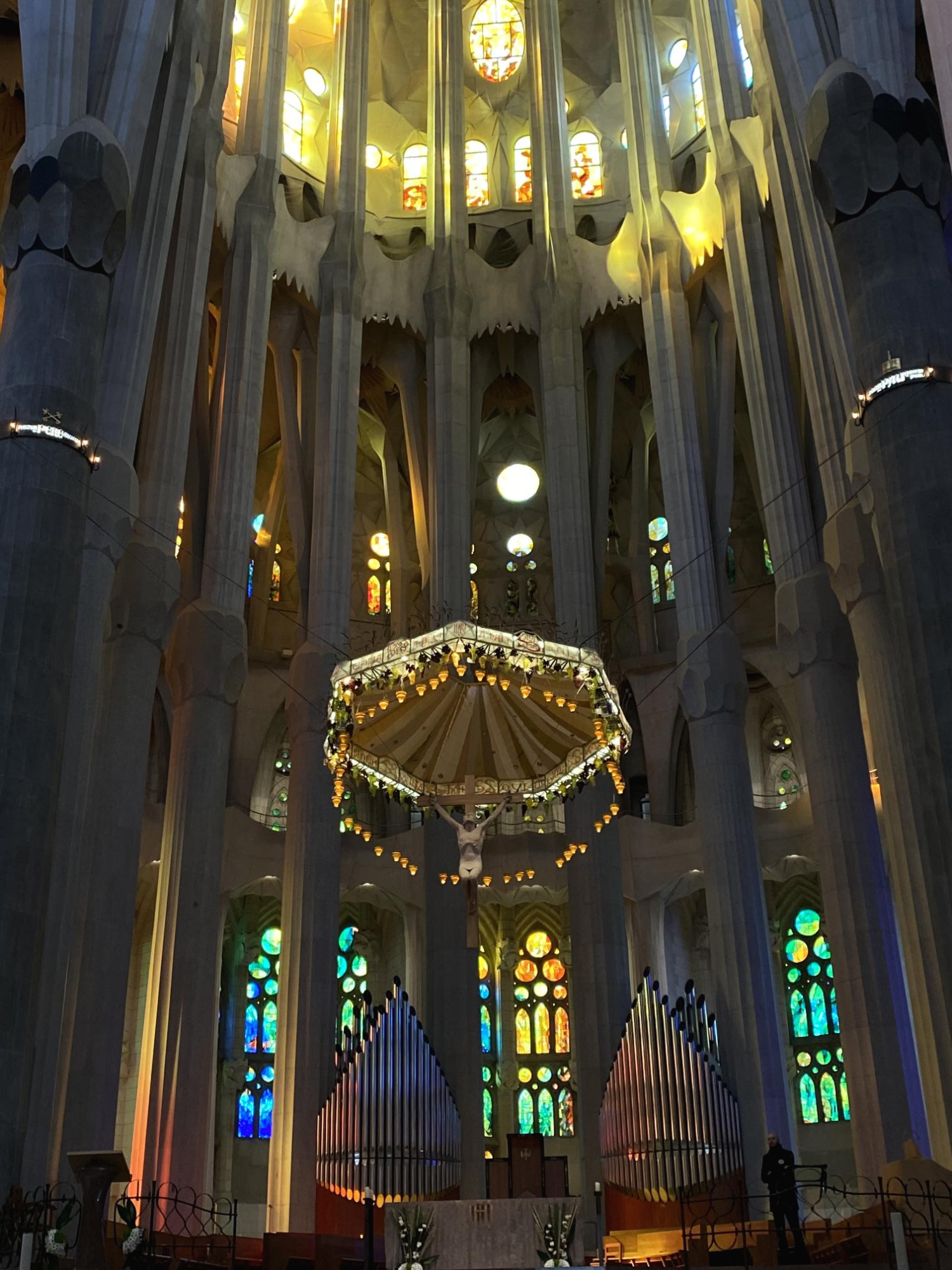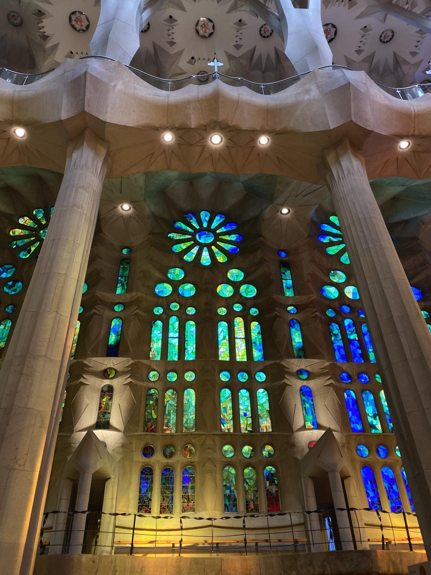 성당 내부 관람 예약 시 한국어 오디오 가이드를 신청할 수 있어요. 입장하기 전에 안내를 따라 오디오 가이드를 빌려주는 곳으로 가면 전화기처럼 생긴 가이드를 받을 수 있답니다. 1번부터 표시되어 있는 장소에서 가이드를 재생하면 성당 내부의 설명을 들을 수 있어요. 가우디의 건축물은 곡선의 연속으로 이루어져 있어서 다른 성당을 관람할 때 보다 개인적으로 편안한 마음이 들었어요. 특히 2~3시경 내부에 입장하면 햇빛이 타일을 통해 들어오는 채광이 정말 아름다워요.
