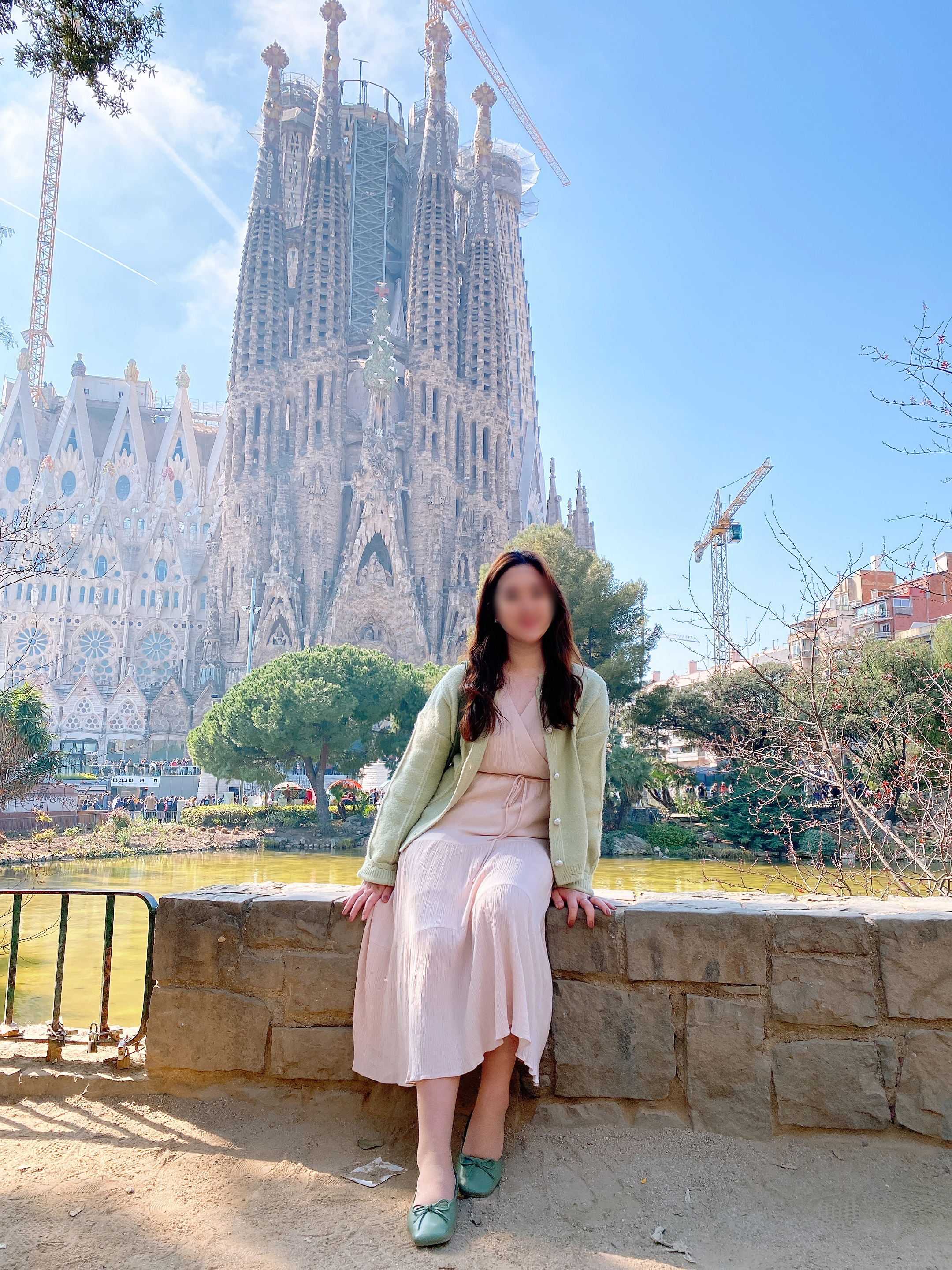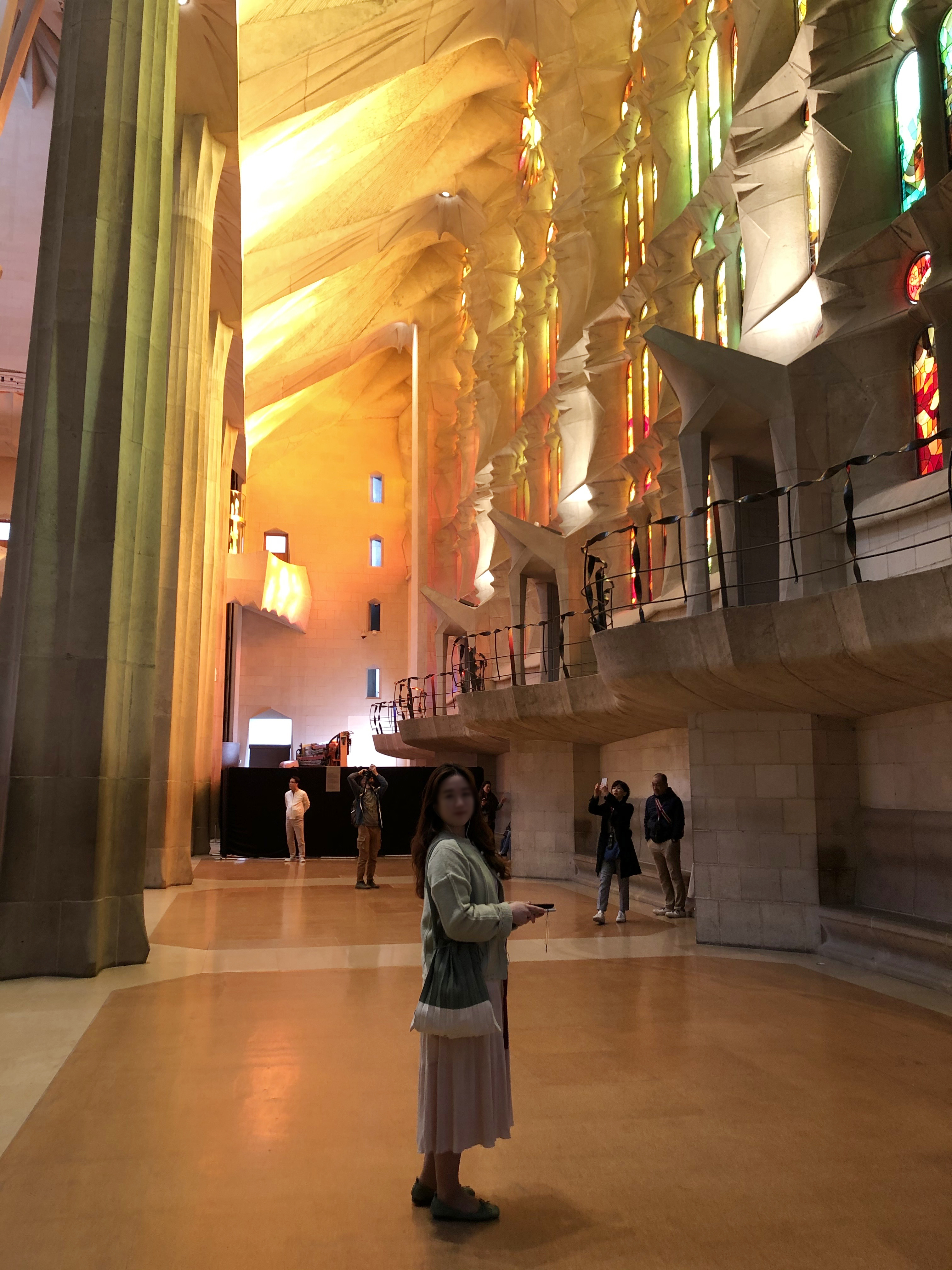 가우디 투어를 하는 날은 화이트 계통의 의상을 입는 것을 추천드릴게요. 성당 내부에는 이렇게 아름다운 채광이 들어오다 보니, 밝은 의상을 입었을 때 사진에 더 예쁘게 나오는 것 같아요. 또 하나의 꿀팁! 사그라다 파밀리아 성당과 함께 사진에 찍히고 싶다면 사람들이 많이 찍는 성당 바로 앞보다는 맞은편 호수를 건너 다리 위에서 찍어보세요. 사그라다 파밀리아 성당, 탄생의 파사드와 함께 사진을 남길 수 있답니다. ^^