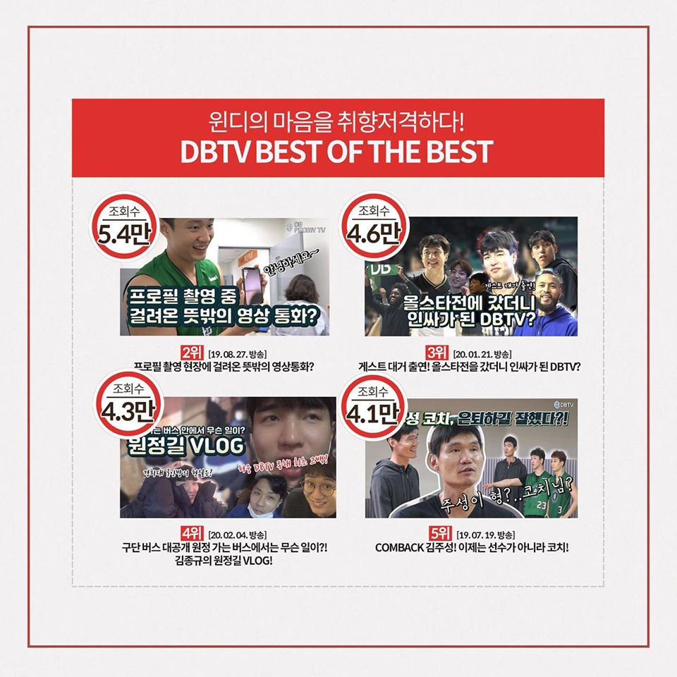 2018년에 개설된 ‘DBPROMY TV’는 현재 KBL 10개 구단 가운데 가장 많은 구독자 수(1만여 명)를 보유하고 있다. 마치 예능 프로그램의 클립 영상을 보는 듯한 재미있는 콘텐츠들이 팬들에게 뜨거운 반응을 얻고 있다. 특히 구단 식당 스케치, 프로필 촬영 현장, 원정길 브이로그 등 선수들의 일상을 담은 비하인드 콘텐츠가 인기다. 팬들은 댓글을 통해 구단의 ‘열일’을 칭찬하며 만족감을 나타내고 있다.