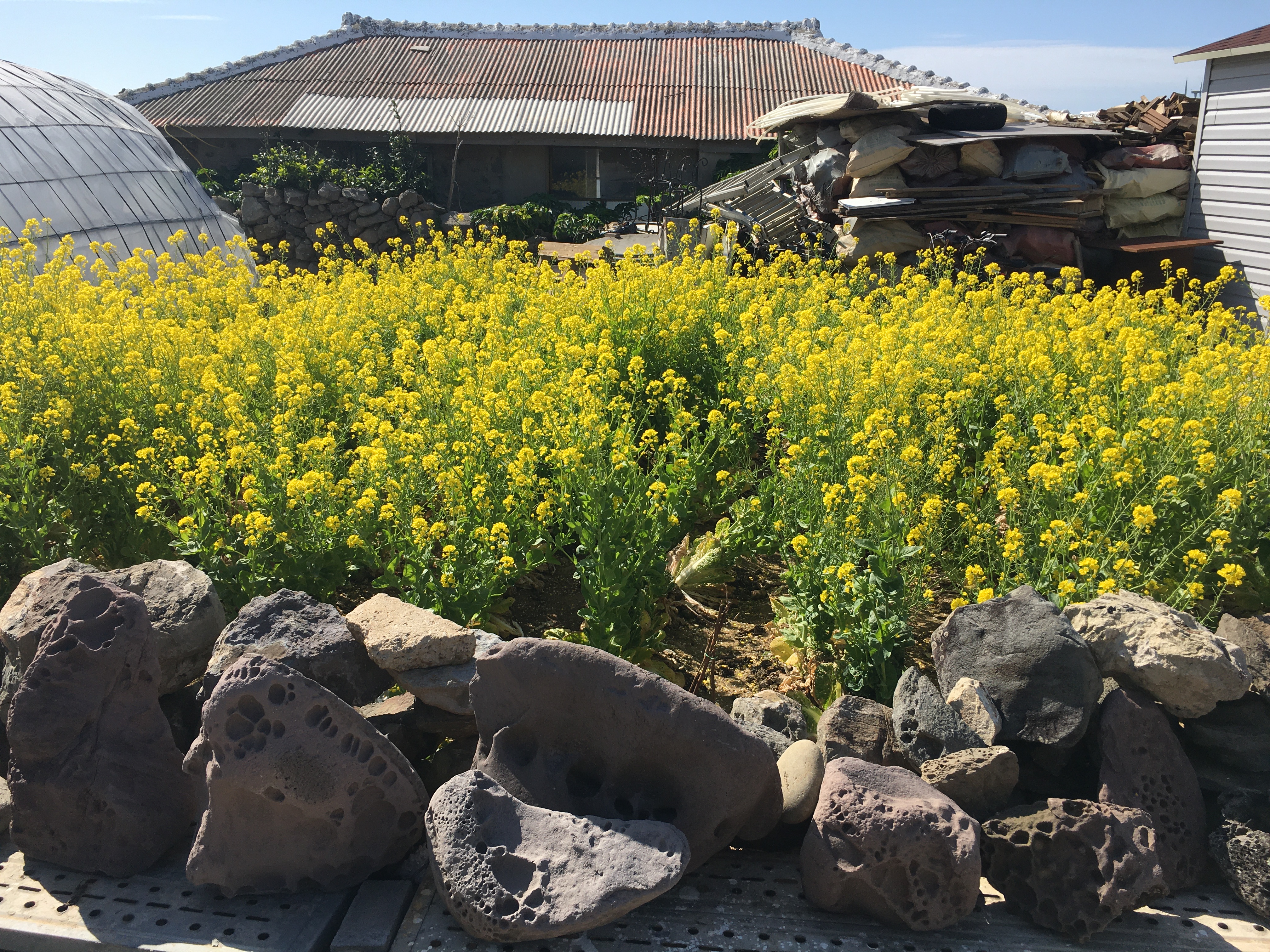 해안도로를 되돌아 숙소로 돌아오는 동안 청보리밭은 황금빛으로 일렁이다 다시 푸르게 변했어요. 해가 높아지면서 숙소 앞 유채꽃은 봄 햇살에 더욱 눈부셨어요.