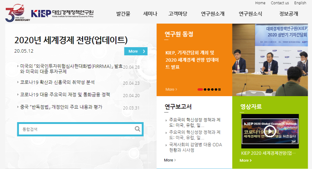 KIEP 대외경제정책연구원은 세계경제와 관련된 문서들을 조사, 연구, 분석해 국가의 대외경제정책 수립에 이바지하기 위해 설립된 국책연구기관이에요. 세계지역과 무역투자, 국제거시금융에 관한 정책연구를 선도하고 있는 연구기관의 다양한 자료들을 살펴볼 수 있어요. 발간물 카테고리에서는 산업, 경제, 기업과 관련된 연구보고서나 정책연구 브리핑, 세계경제 등 다양하고 전문적인 자료들을 열람할 수 있어요.