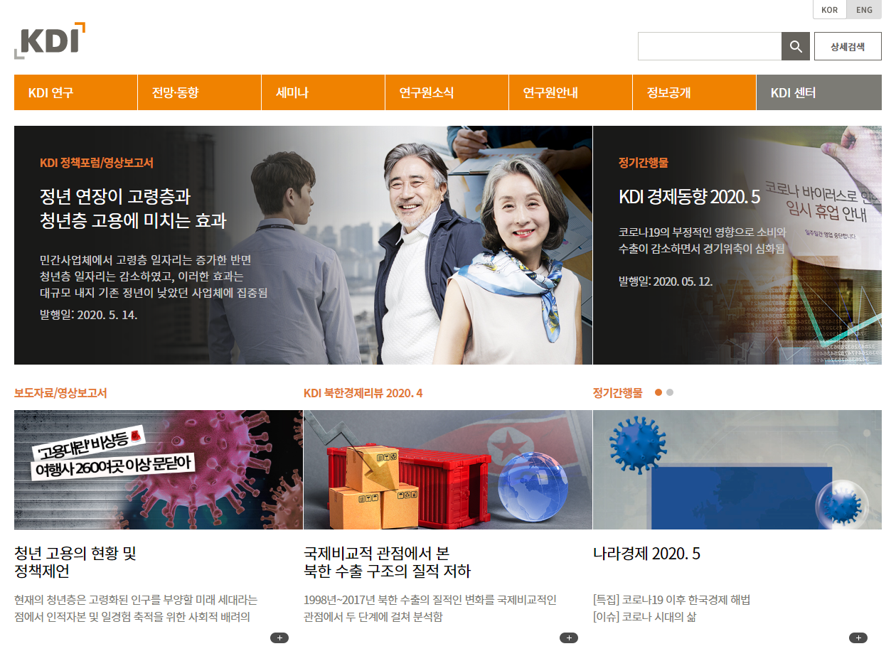 한국개발연구원은 국가 경제발전 및 사회 발전 관련 사항을 조사, 연구하기 위해 1971년 3월에 설립된 정부 출연 연구기관이에요. 한국개발연구원 사이트 KDI 연구 카테고리에서는 종류별 보고서로 정책연구시리즈, 경제정보센터, 연구자료 등 다양한 보고서를 공개하고 있어요. 전망·동향 카테고리에서는 경제전망, 경제동향, 나라경제, 북한경제까지 전문적인 연구보고서를 제공하고 있죠. 또한 ‘뉴스레터’를 신청하면 매일 아침 KDI보고서, KDI소식, 경제정책정보, 국내외 기관 자료, 경제교육 활동에 대한 내용을 확인하실 수 있어요.