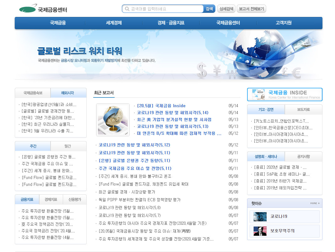 국제금융센터는 국제금융에 대한 정보를 전문적으로 수집해 분석하는 기관이에요. 국제 금융속보, 해외시각, 금융지표, 경제지표, 신용에 대한 내용을 확인할 수 있는데요. 미국, 중국, 유럽, 일본, 신흥국까지 다양한 분석과 정보, 경제의 지표 등을 상세하게 살펴볼 수 있답니다. 또한 경제 금융지표에서는 금리, 외화보유액, 주요 금융지표 등을 살펴볼 수 있어 세계경제에 대해 관심 있는 분들에게는 꼭 추천하고 싶은 사이트에요.