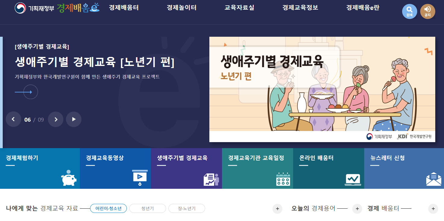 기획재정부는 경제와 관련된 다양한 정보와 지식을 제공하는 경제교육포털 ‘경제배움e’를 운영하고 있어요. 경제배움e는 경제교육 자료를 누구나 쉽고 편리하게 이용할 수 있도록 해 국민의 경제에 대한 관심과 이해력을 높이기 위한 사이트에요. 사이트의 메뉴는 경제배움터, 경제놀이터, 교육자료실, 경제교육정보, 경제배움e로 구성돼 있으며 실생활에서 밀접한 내용이지만 잘 알지 못했거나 어렵다고만 생각했던 내용을 쉽고 재미있게 설명해 주고 있어요.