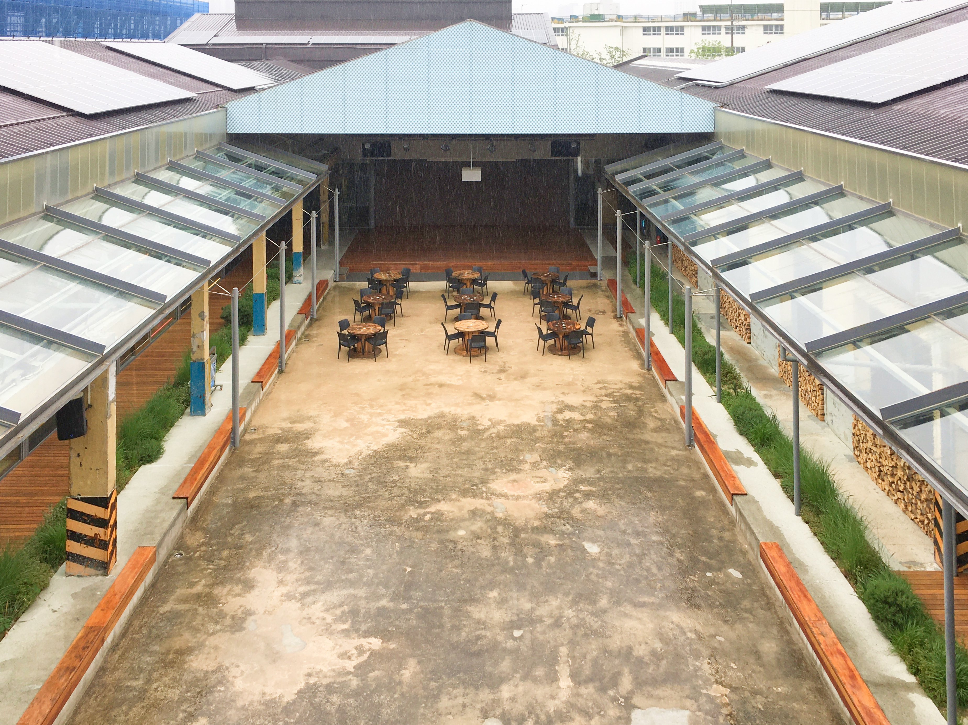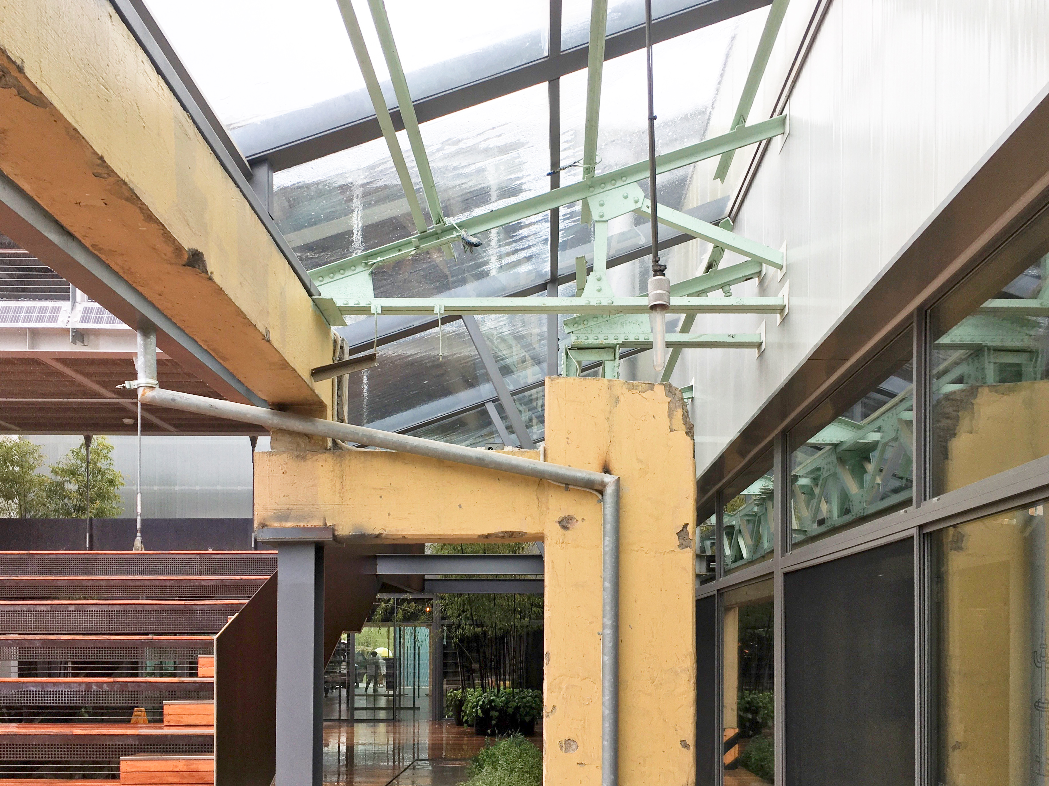옛 공장의 흔적을 고스란히 간직한 바닥은 그린과 어우러져 조경석과 디딤돌로 재탄생 했고, 공장 지붕을 받치던 나무 트러스는 방문객들이 편안히 쉴 수 있는 벤치로 새롭게 태어났어요.