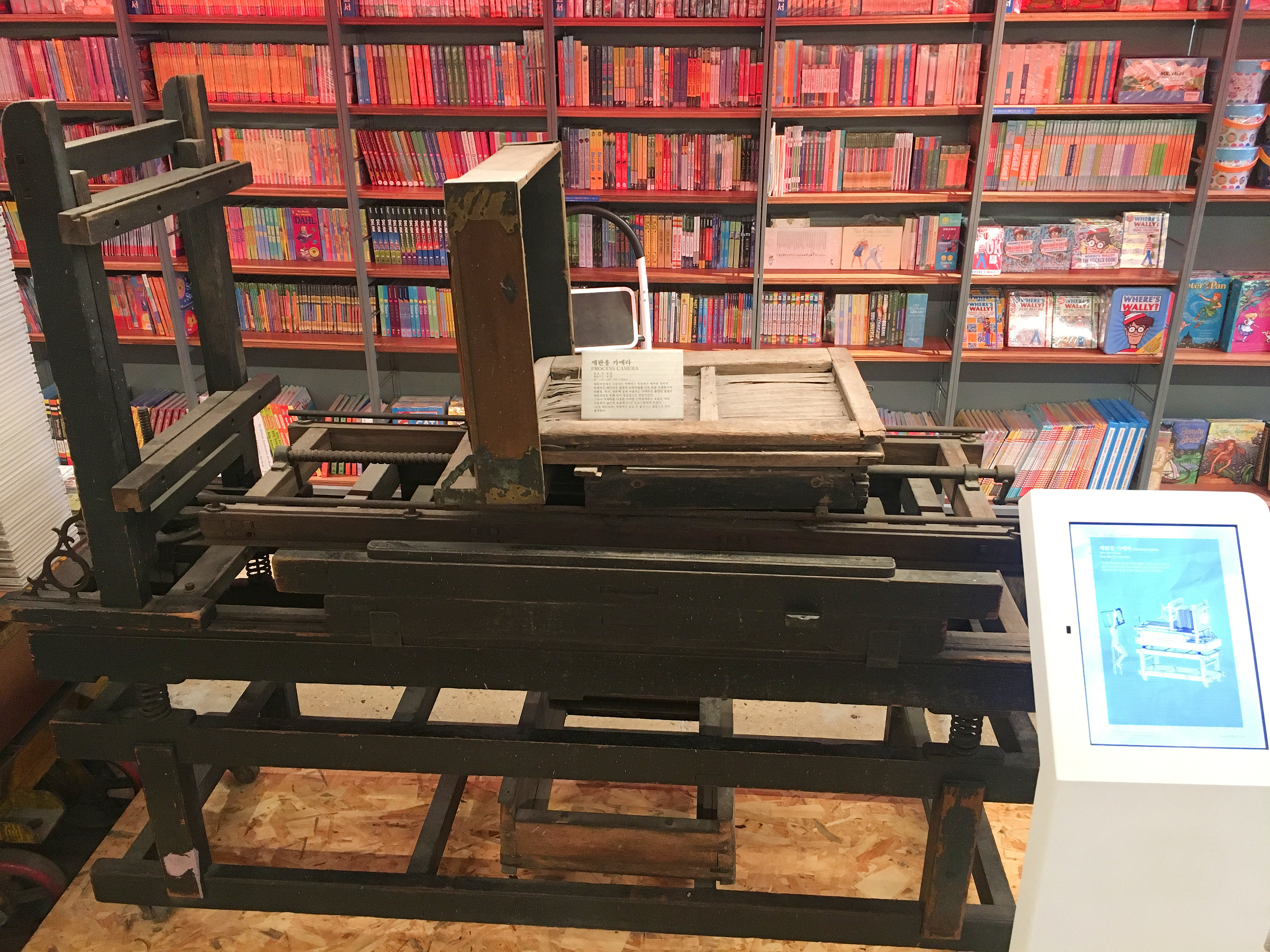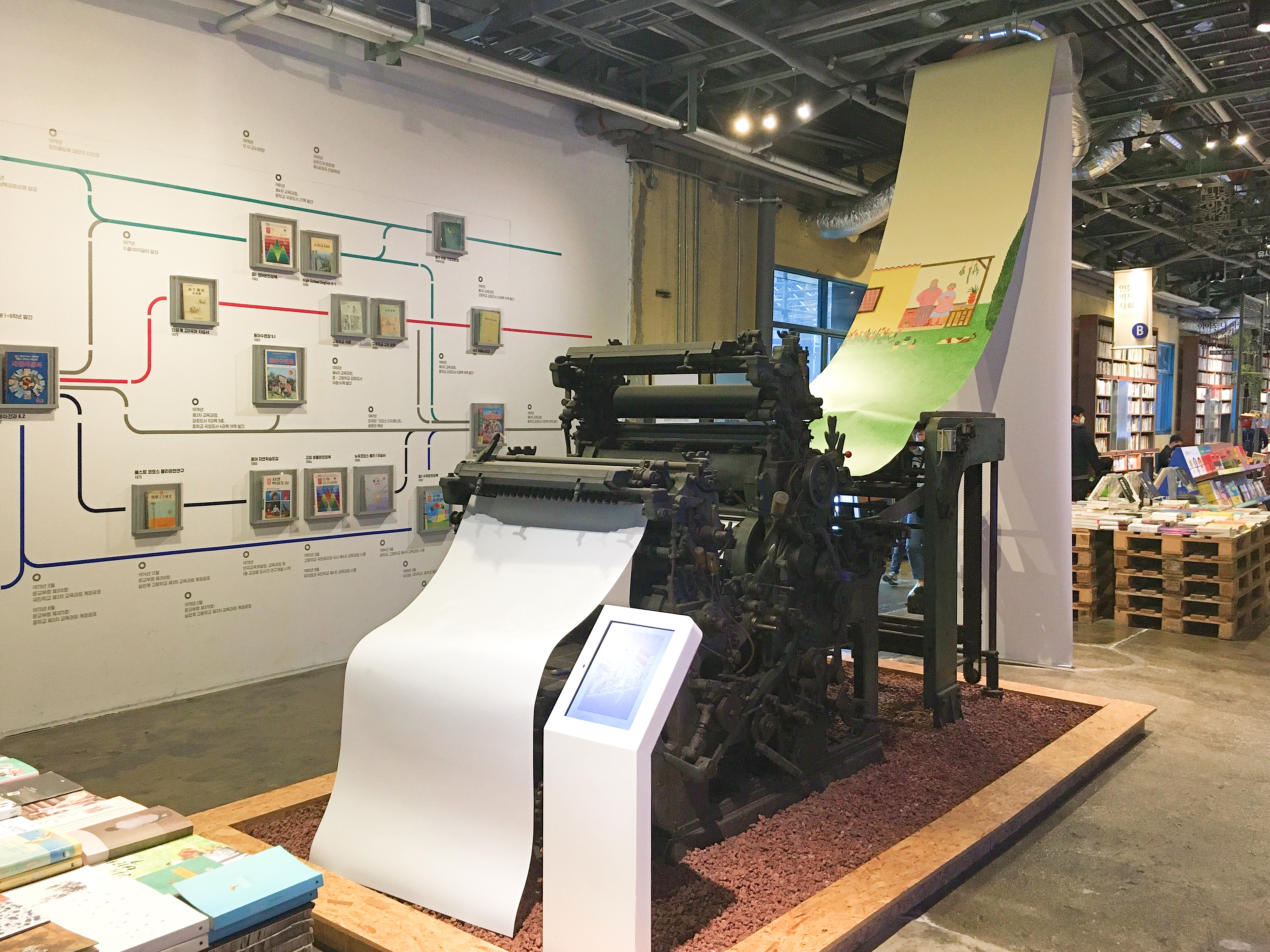 또 서점 내에 옛 분위기를 살리기 위해 실링인쇄기, 오프셋인쇄기 같은 옛날 인쇄기도 전시해 놓았어요. 서점을 둘러보는 동안 활자 인쇄 프로세스부터 최신 기술의 전자책에 이르기까지 책과 출판에 관련된 정보를 과거부터 현재, 미래에 걸쳐 모두 살펴볼 수 있답니다.