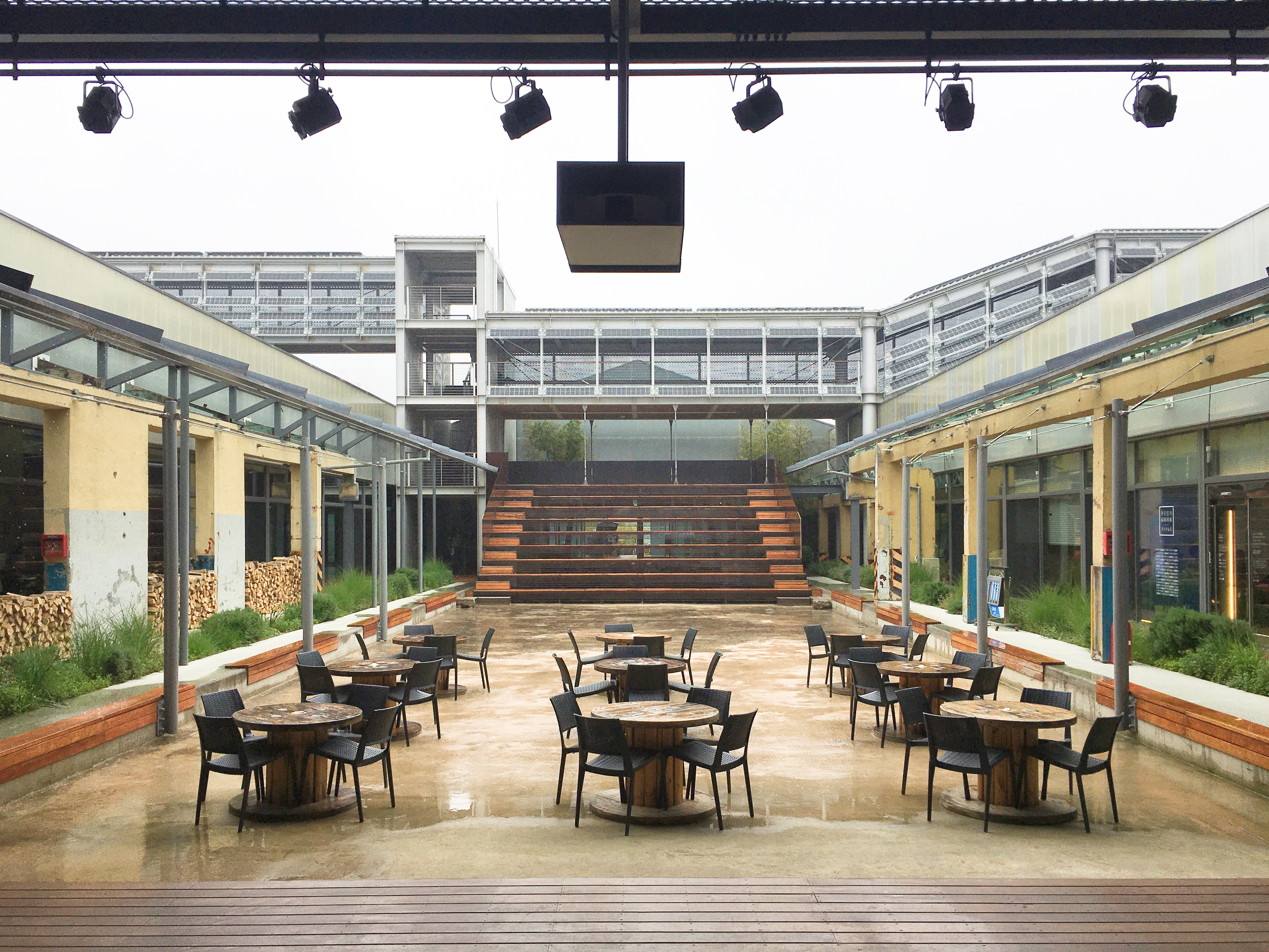 카페 여기저기에는 와이어를 감아놓는 보빈이 흩어져 있는데, 지름이 1.5m가 넘는 것부터 자그마한 것까지 다양해요. 이 보빈을 테이블 또는 장식으로 활용하고 있어요. 사람들에겐 색다른 경험이 아닐 수 없겠죠. 중간중간 벽체의 기둥도 철거하다 만 채로 살려뒀습니다.