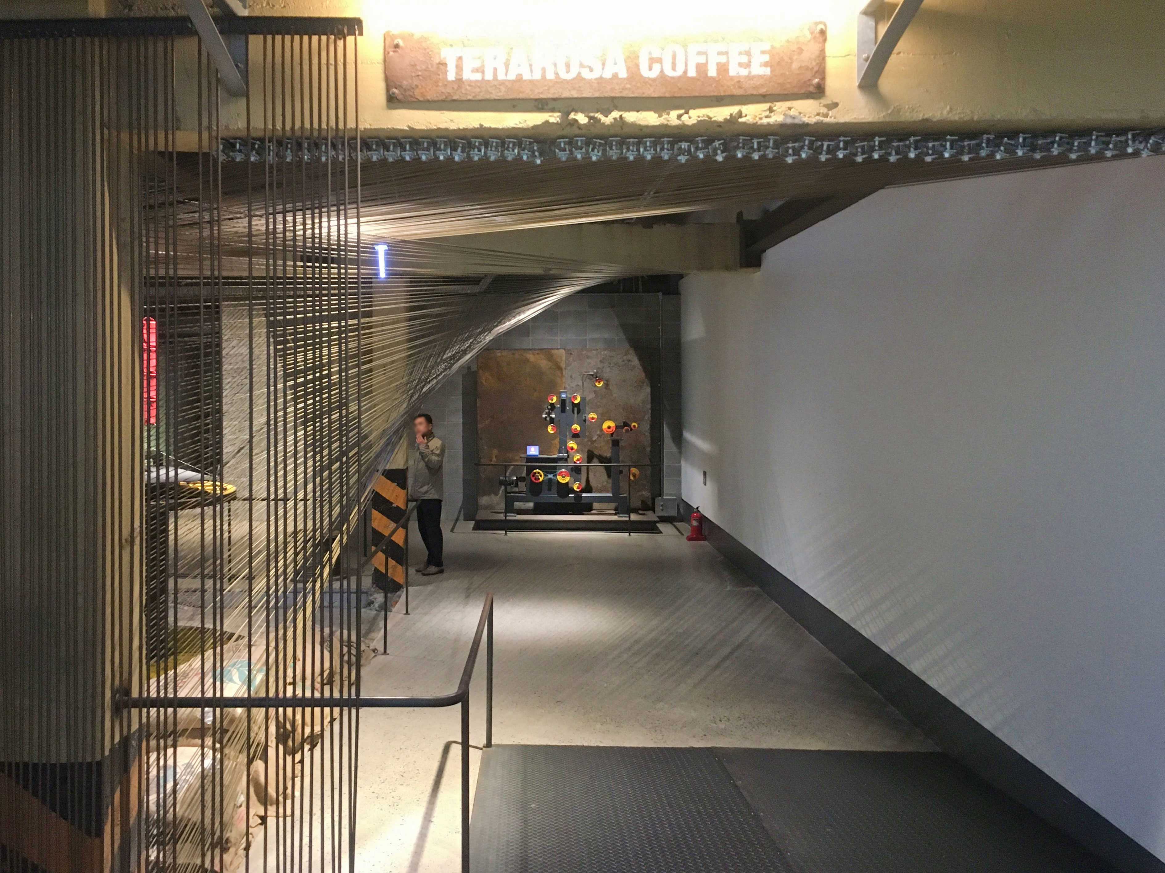 테라로사로 들어서면 공장 기계 등으로 만든 설치 작품이 눈길을 끌어요. 카페 내부 바닥과 테이블, 조리대는 공장에서 나온 녹슨 철판과 콘크리트를 재활용했어요. 높고 웅장한 천장 아래 지붕 골조는 옛 모습 그대로인데 공장 건물의 원형을 보전하면서 공장 기물을 작품처럼 곳곳에 꾸며 놓았어요.