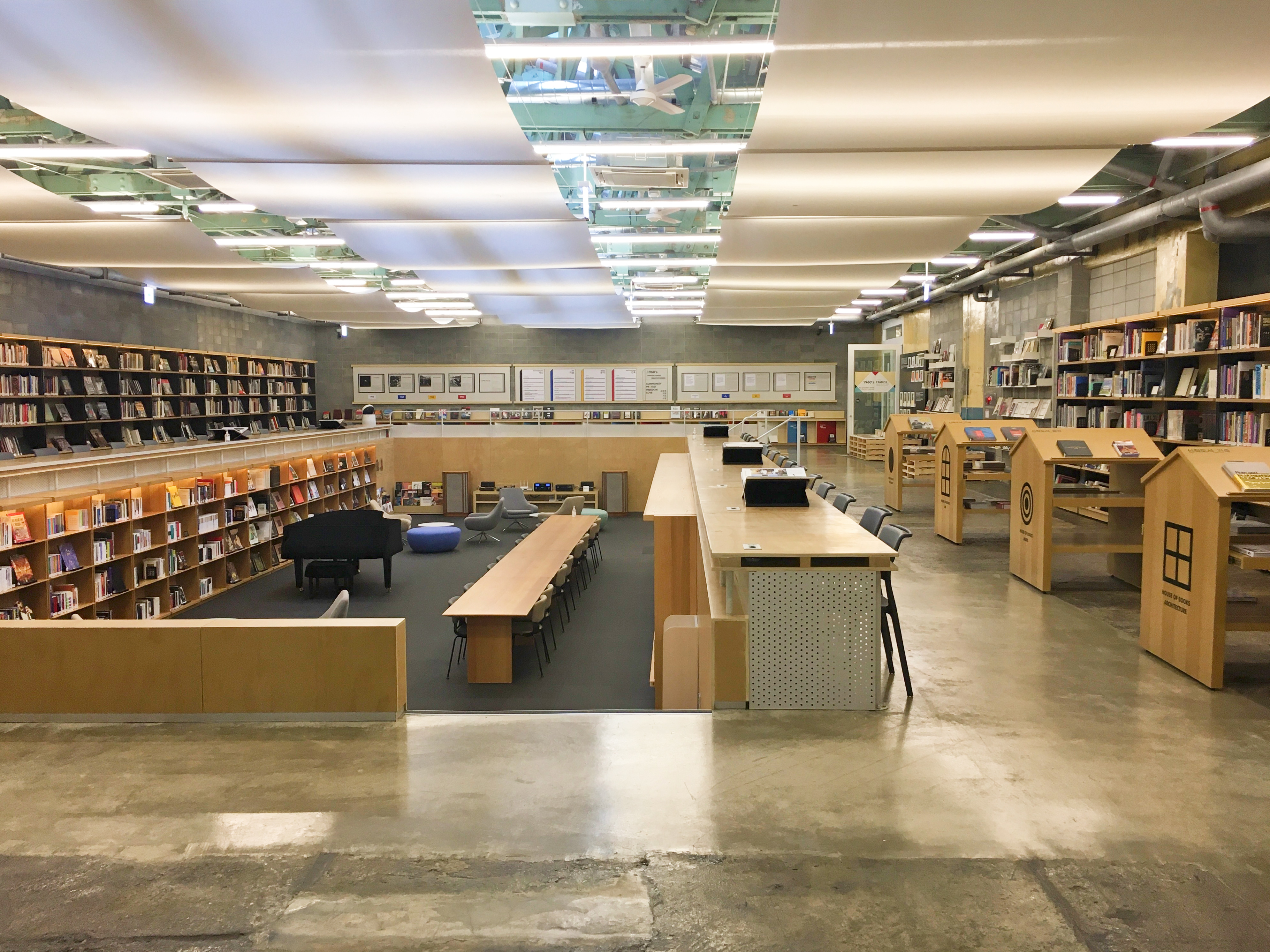 F1963 공간 본연의 매력을 최대한 살리면서 미술관에 온 것처럼 책을 여유롭게 감상하고 즐길 수 있는 공간 디자인이 특징이에요. 서점 가운데에는 원고지 형상의 디지털 작품이 있고, 벽면에는 1945년 이후 한국 출판 역사를 인쇄 기기와 활자, 베스트셀러 등으로 표현한 작품이 있어요.