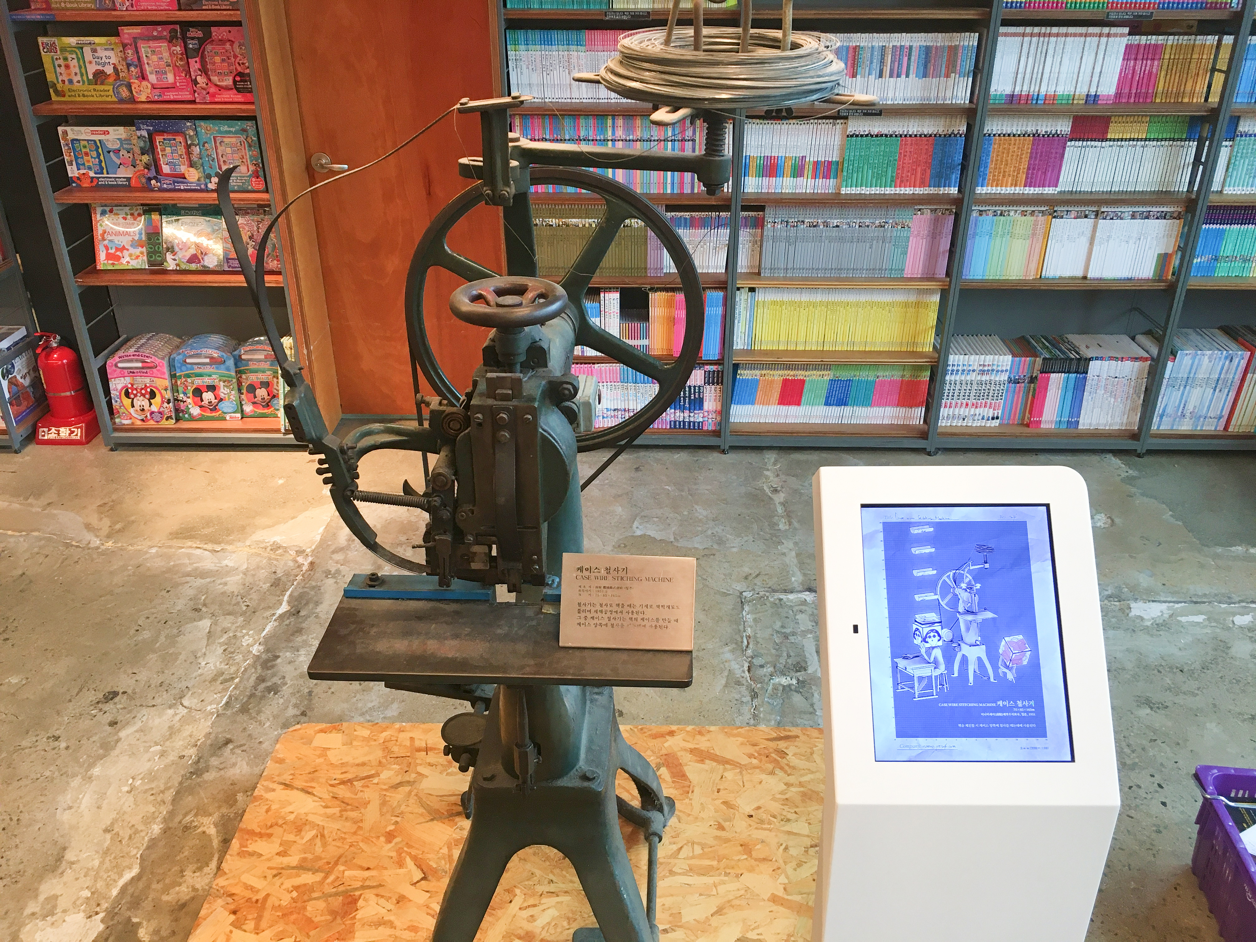 또 서점 내에 옛 분위기를 살리기 위해 실링인쇄기, 오프셋인쇄기 같은 옛날 인쇄기도 전시해 놓았어요. 서점을 둘러보는 동안 활자 인쇄 프로세스부터 최신 기술의 전자책에 이르기까지 책과 출판에 관련된 정보를 과거부터 현재, 미래에 걸쳐 모두 살펴볼 수 있답니다.