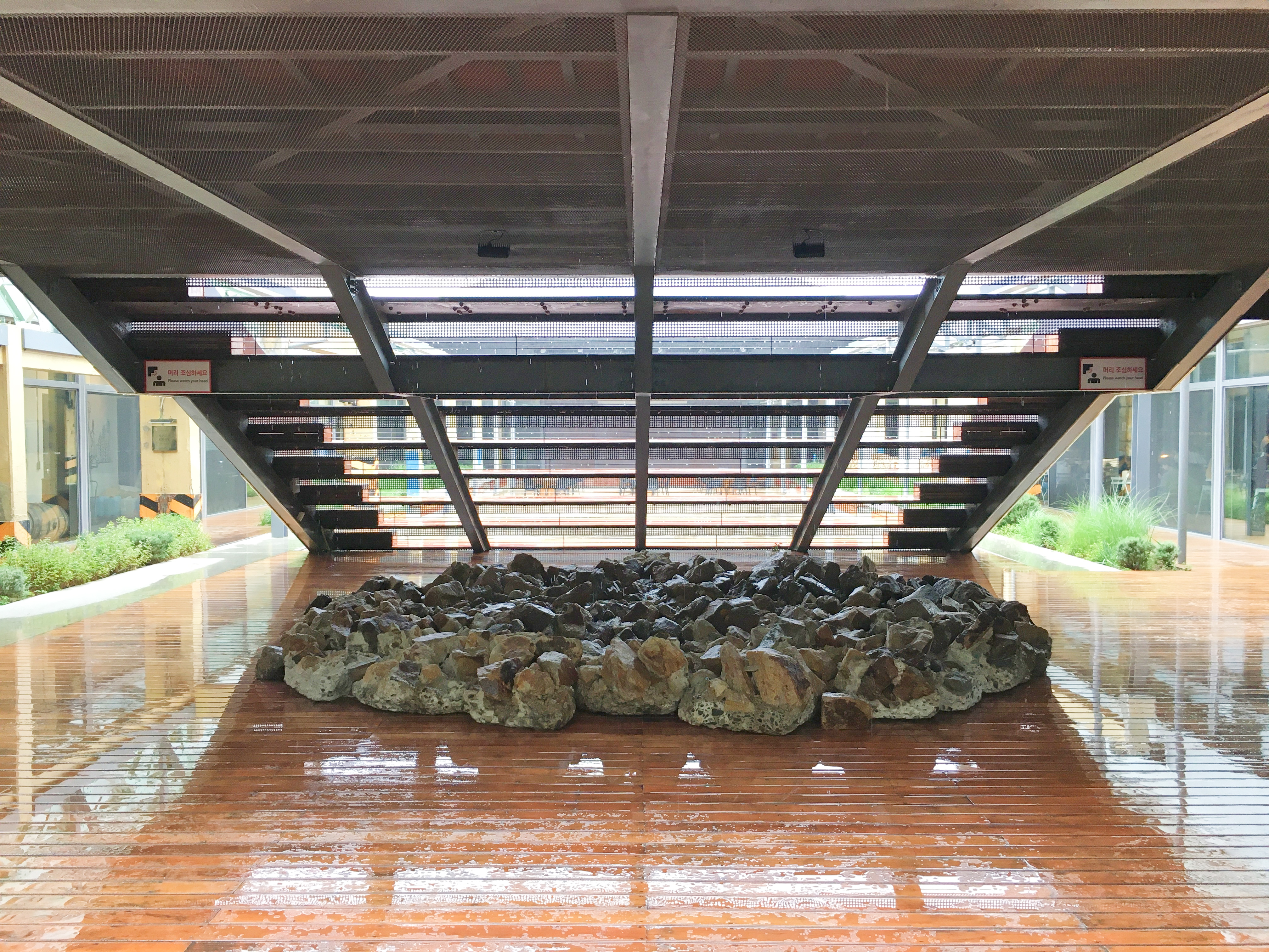 중정 계단 아래에는 리노베이션 과정에서 나온 콘크리트가 덕지덕지 붙은 돌 더미가 작품처럼 전시돼 있어요. 노동자들이 힘들여 공장을 지으면서 기초공사에 사용한 돌 더미랍니다.