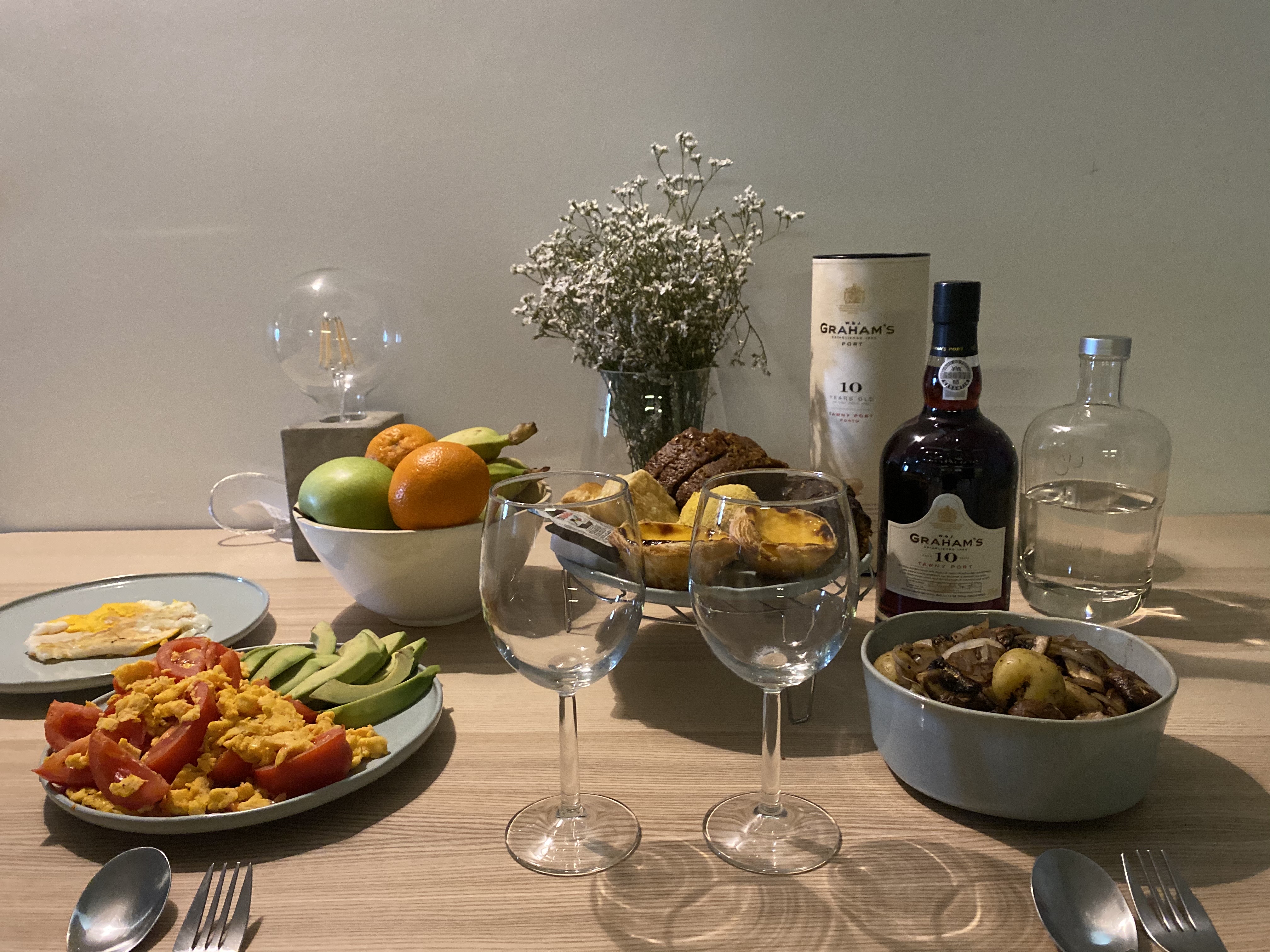 다른 여행지와 달리 포르투는 힐링 여행이 컨셉인만큼, 하루아침은 근처 식료품점에서 직접 식재료를 구매해 간단하게 토마토 달걀 볶음과 아보카도, 버섯볶음 등을 요리해서 아침을 즐겼어요. 미리 사둔 포트와인과 에그타르트까지 함께 하니 정말 완벽한 아침식사가 준비되었답니다. 포르투는 이렇게 여행과 여행 사이에 쉬어 가는 장소로도 좋고, 도시가 자그마해서 여유롭게 여행할 수 있기 때문에 나중에 시간이 된다면 포르투 한 달 살기 등으로 오고 싶었어요.
