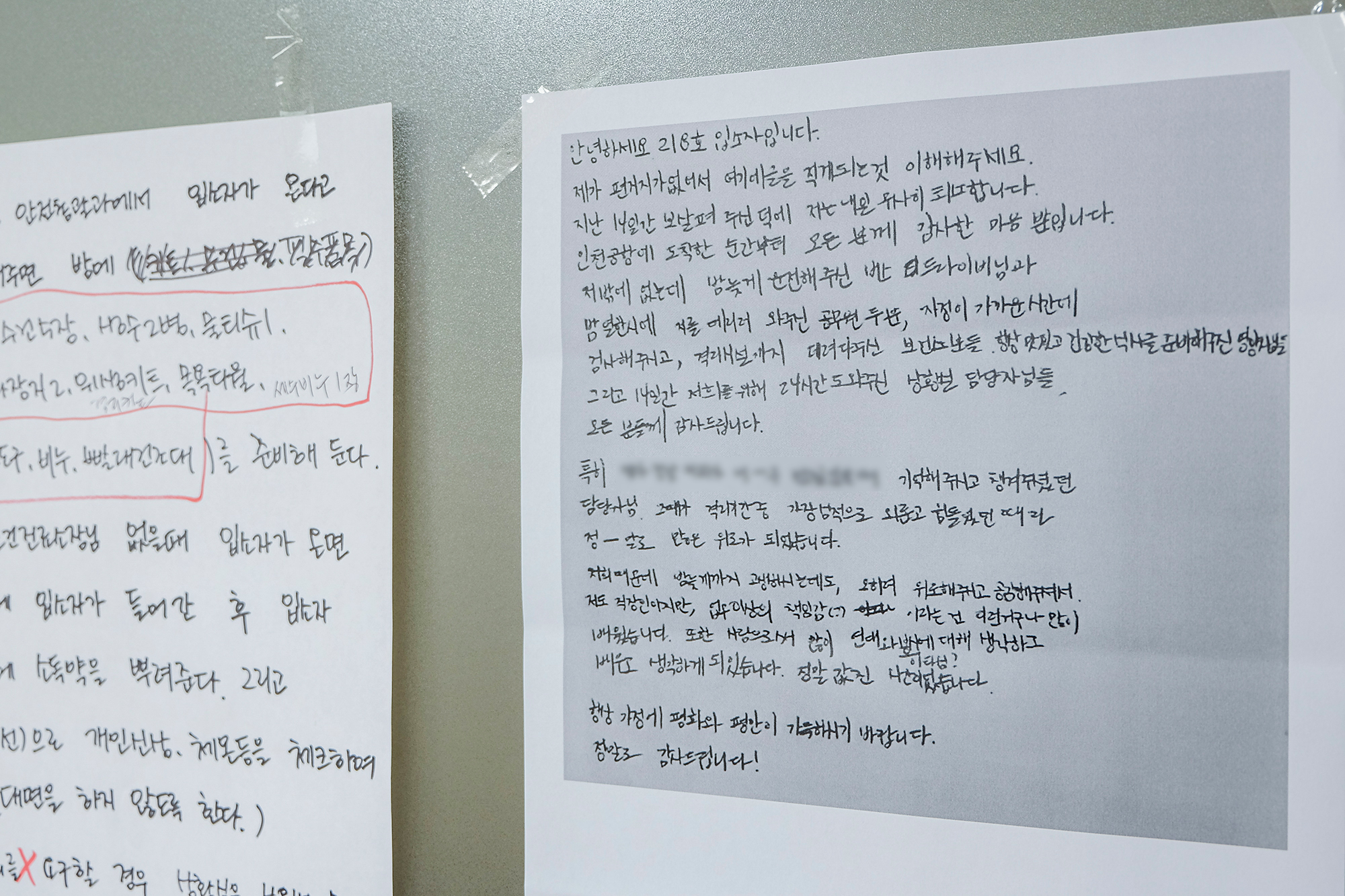 주민성 차장의 안내를 받아 인재개발원 2층에 마련된 상황실로 이동했다. 현장 관리자들은 주야간 교대 근무로 입소자들의 상태를 빠짐없이 체크하고 있었다. 상황실 한 편에는 입소자들을 위한 보급 물품이 쌓여 있었고, 다른 한 편에는 관리자들의 근무 공간과 쪽잠을 해결해 줄 간이침대가 놓여 있었다. 벽면에는 격리시설 관리지침과 의료인 및 근로자 근무수칙, 체온계 사용 설명서, 쓰레기 처리방법 등 중요한 내용들로 가득 채워져 있었다.