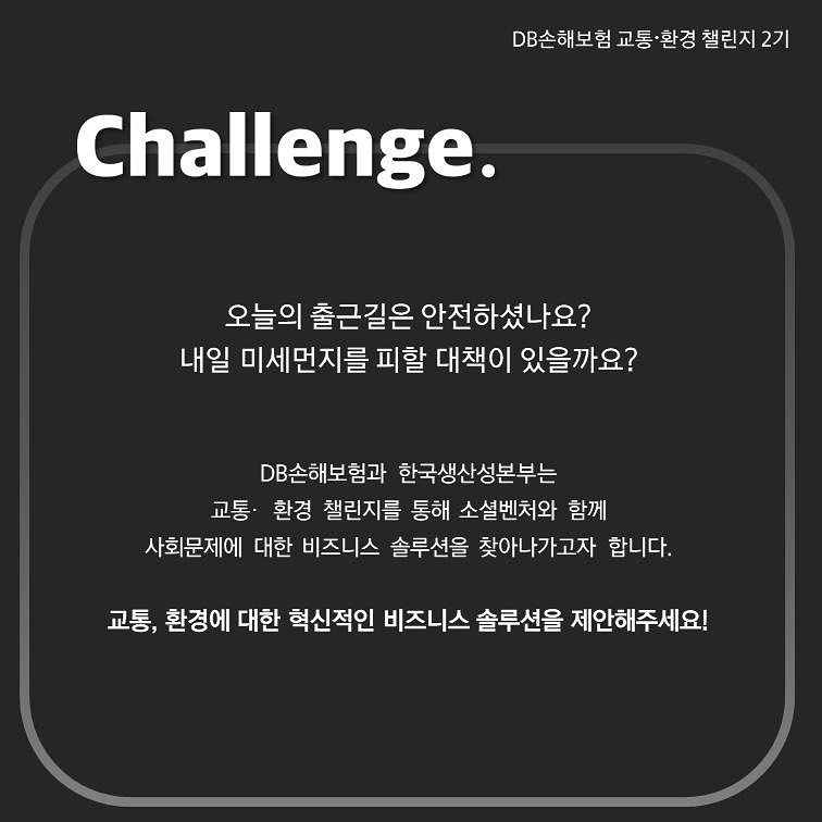 ‘교통·환경 챌린지’란 DB손해보험과 한국생산성본부, 환경부가 함께 교통·환경 분야의 사회문제를 해소하기 위해 마련한 사회공헌 플랫폼이다. 챌린지는 DB손해보험이 손해보험사로서 오랫동안 고민해온 교통안전 문제와 글로벌 지속 가능성의 가장 큰 이슈인 환경 문제를 주제로 한다. 선정된 기업에게는 사업 활성화를 위한 사업비와 경영관련 자문 등 중장기적 관점의 육성 프로그램을 지원한다.