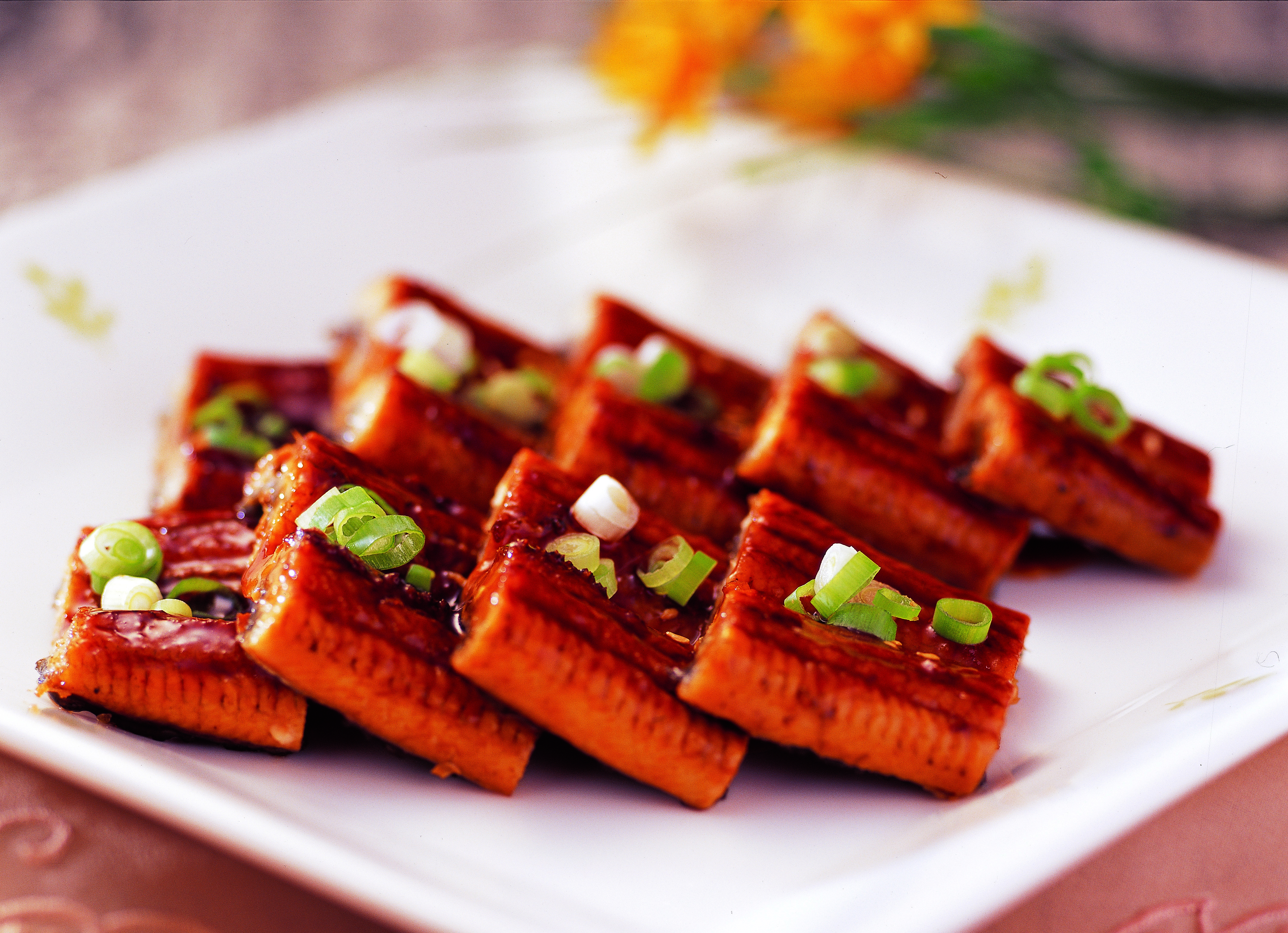 장어의 기름은 대체로 불포화지방이며 비타민A와 E가 풍부하고, 단백질도 풍성하게 함유하고 있어요. 특유의 기름진 맛이 많이 나므로 향이 진한 채소와 곁들이면 잘 어울립니다. 생강채가 대표적이고, 미나리 줄기, 셀러리 잎, 깻잎, 당귀 같은 채소와 먹으면 맛있어요. 장어탕에 방아 잎이나 산초 등을 넣고 푹 끓이는 것과 비슷한 이치이죠. 큼직한 장어구이 한 조각 위에 생강채 몇 개를 올려 오물오물 맛을 봅니다.