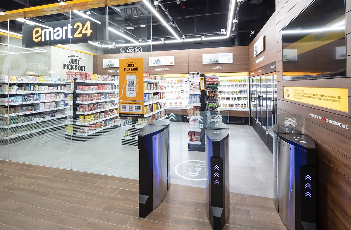 신세계아이앤씨는 국내 최초로 자동 결제 시스템을 도입한 ‘이마트 24 셀프 스토어 김포 DC점’을 열었어요. 이곳에는 상품 결제를 해주는 직원이 없어요. 입장권으로 쓰이는 QR코드만 있으면 물건을 담아 매장 밖으로 그냥 가지고 나오면 됩니다. 진정한 비대면 마켓인 것이죠. 이곳에 상주하는 직원은 매장 바깥 테이블을 청소하거나 담배를 사는 고객의 신분증을 확인하는 업무만 담당해요.