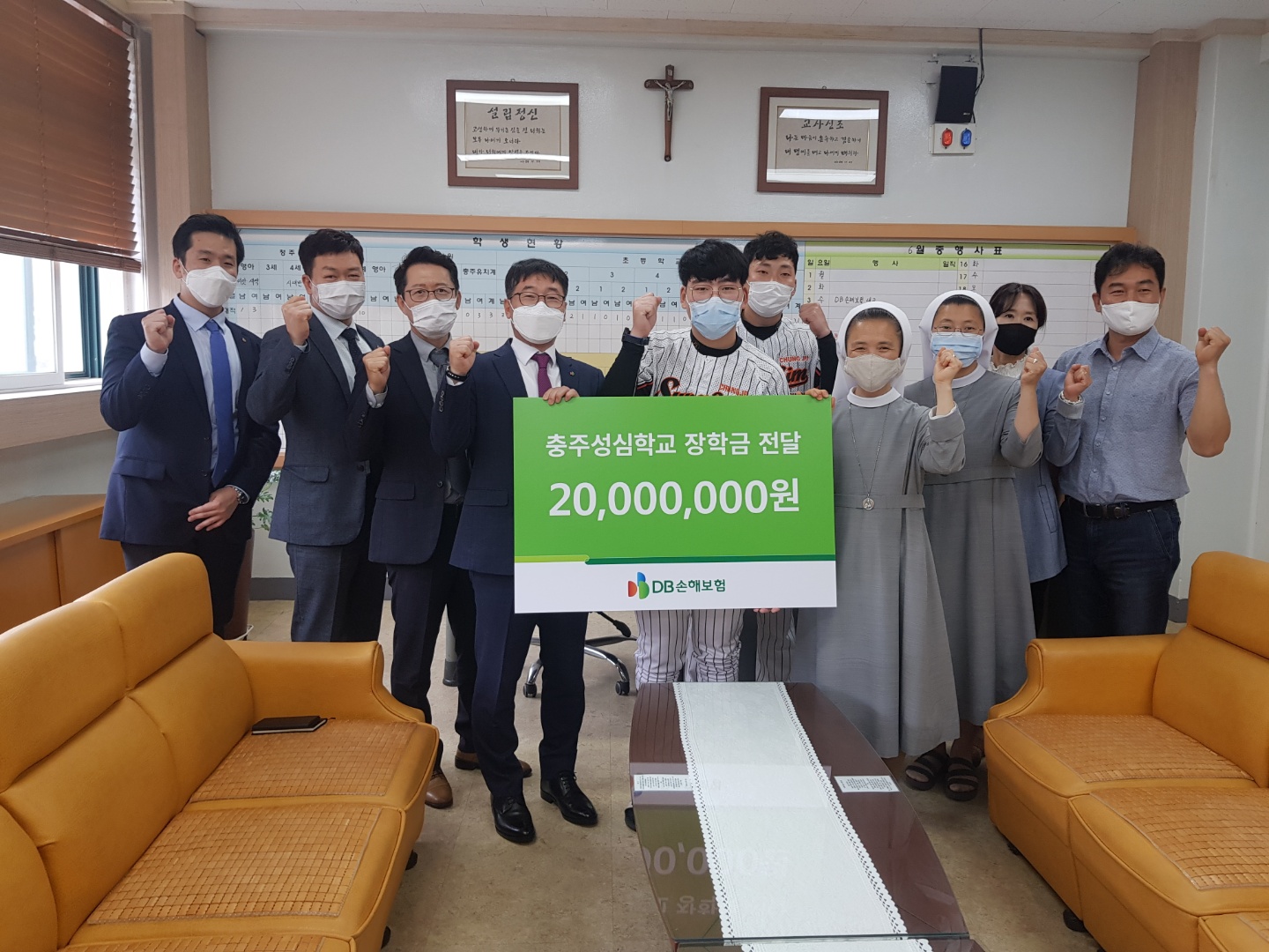 DB손해보험(대표이사 사장 김정남)은 지난 6월 3일 충주성심학교 교무실에서 DB손해보험 임직원, 충주성심학교 교직원 및 야구부가 참석한 가운데 가정형편이 어려운 학생들을 위한 장학금 전달식을 가졌다.