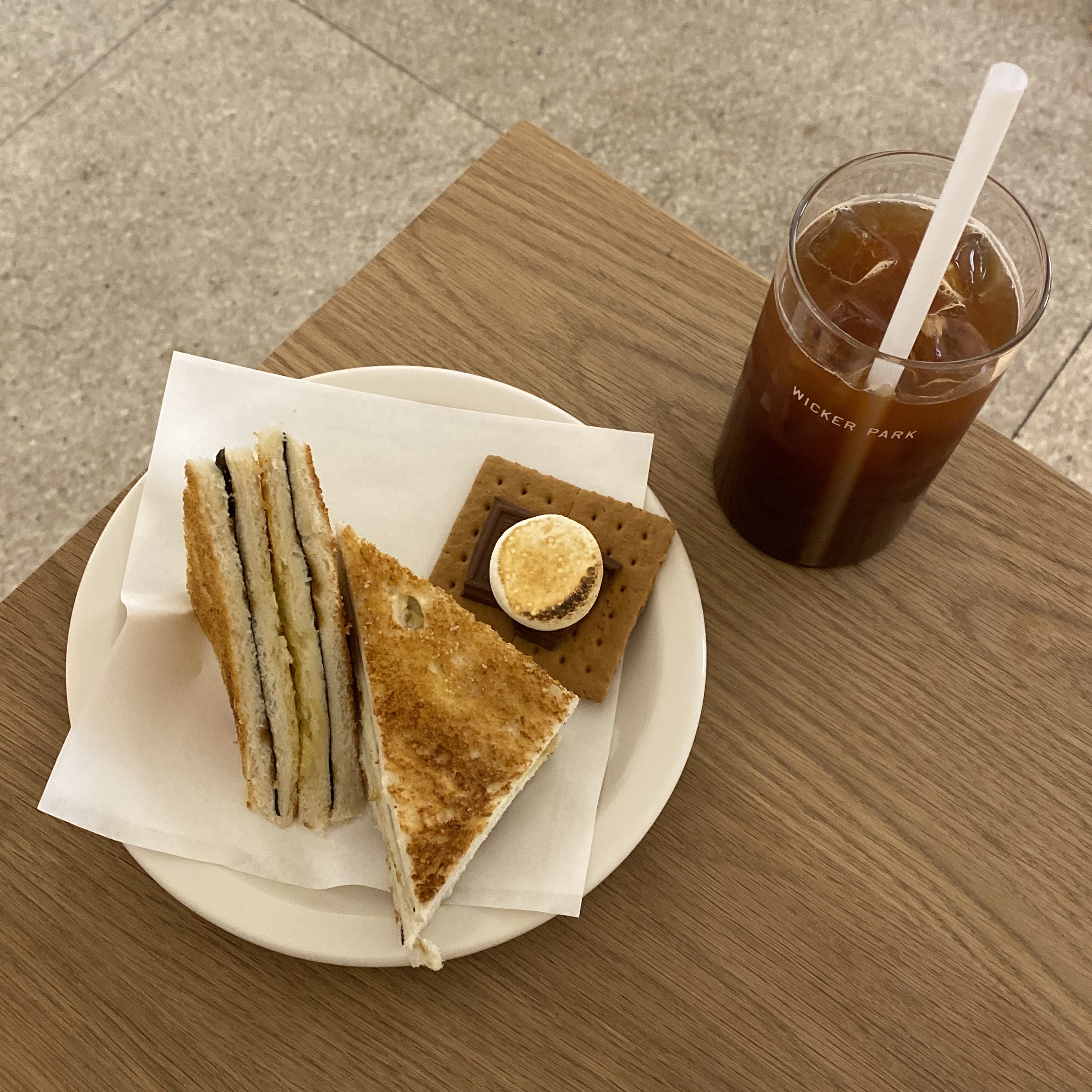 위커파크의 아메리카노는 약간 산미가 있는 편이었고, 디저트류가 특이했어요. 맛있는 크래커에 초콜릿과 토치로 구운 마시멜로가 올라간 ‘스모어’, 김이 들어간 ‘김토스트’와 같이 다른 카페에선 흔히 찾아보기 어려운 독특한 디저트들이 있어요. 특히 김토스트는 “토스트에 김을 넣는다고? 어울릴까?” 싶어 섣불리 도전하기 힘들 수 있지만 마치 간장버터밥을 먹는듯한 느낌으로 자꾸만 손이 가는 맛이랍니다.