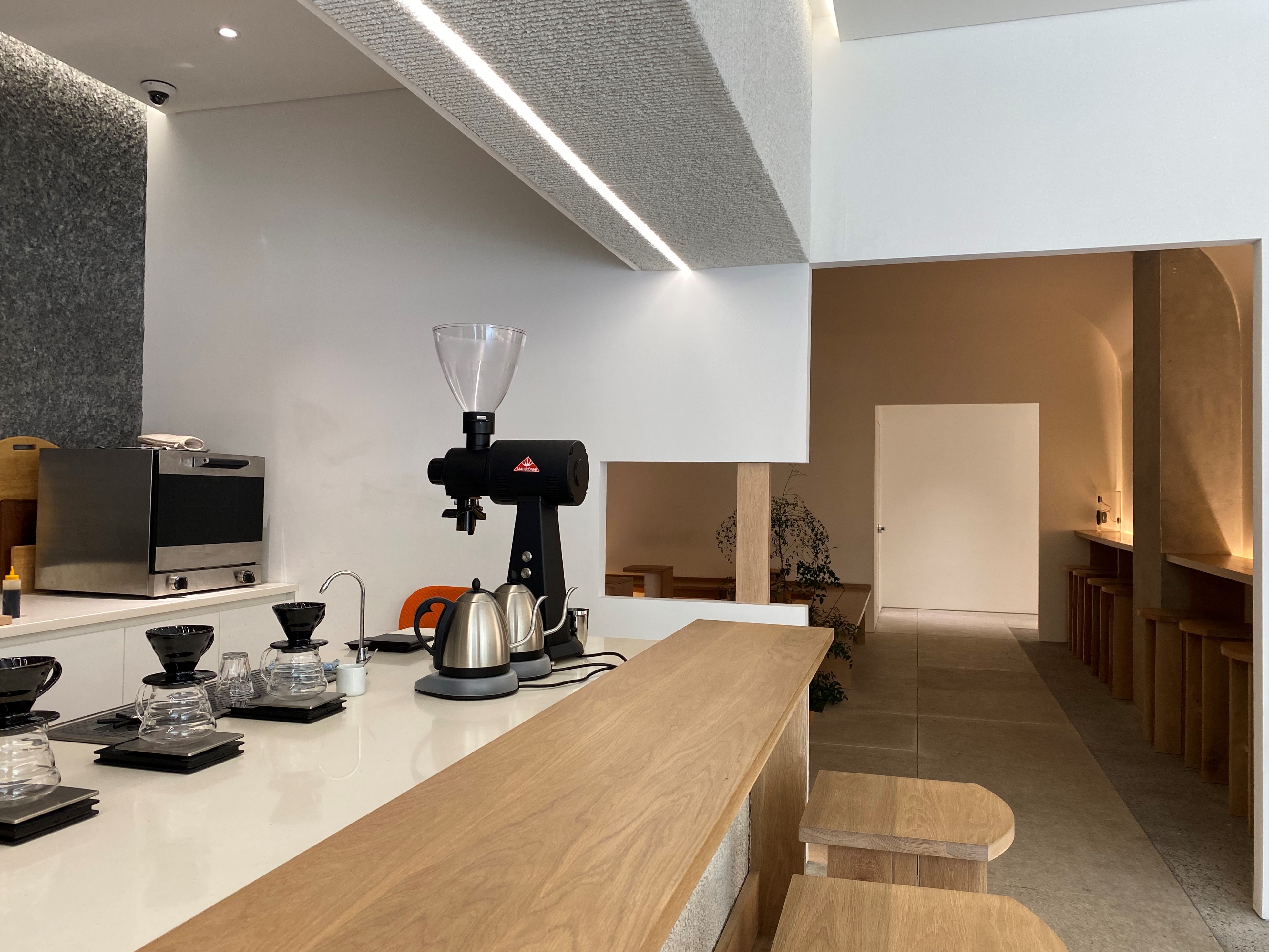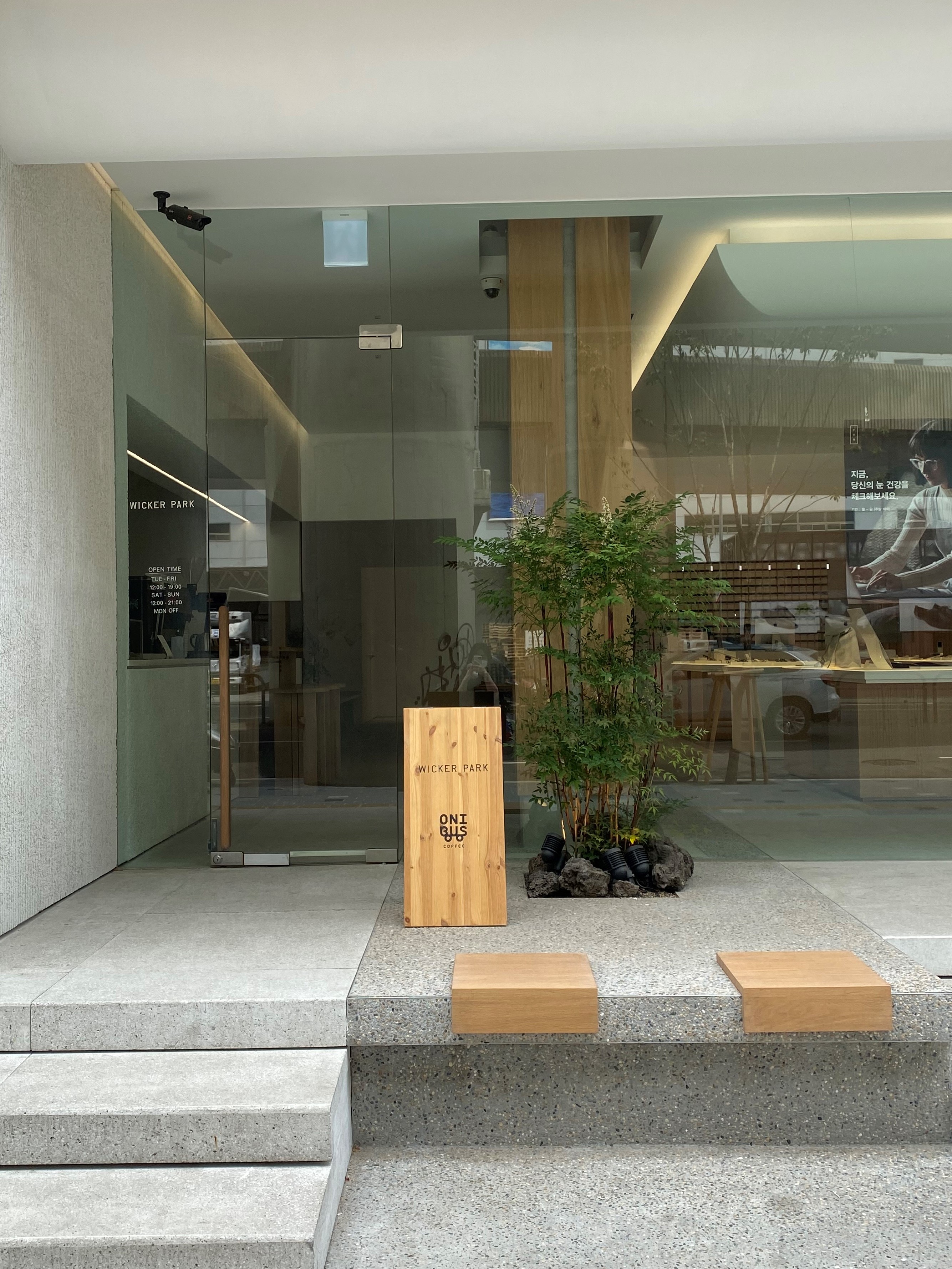 위커파크는 성수동의 안경원인 성수윤과 같은 공간을 쓰는 샵인샵 형태의 카페에요. 안경원을 찾는 손님도, 커피를 찾는 손님도 함께 즐길 수 있도록 공간이 명확하게 나뉘어 있지 않은 점이 특징인데요. 나무와 돌로 되어 있는 심플한 자연 친화적인 인테리어는 미니멀한 느낌을 주기에 충분해요.