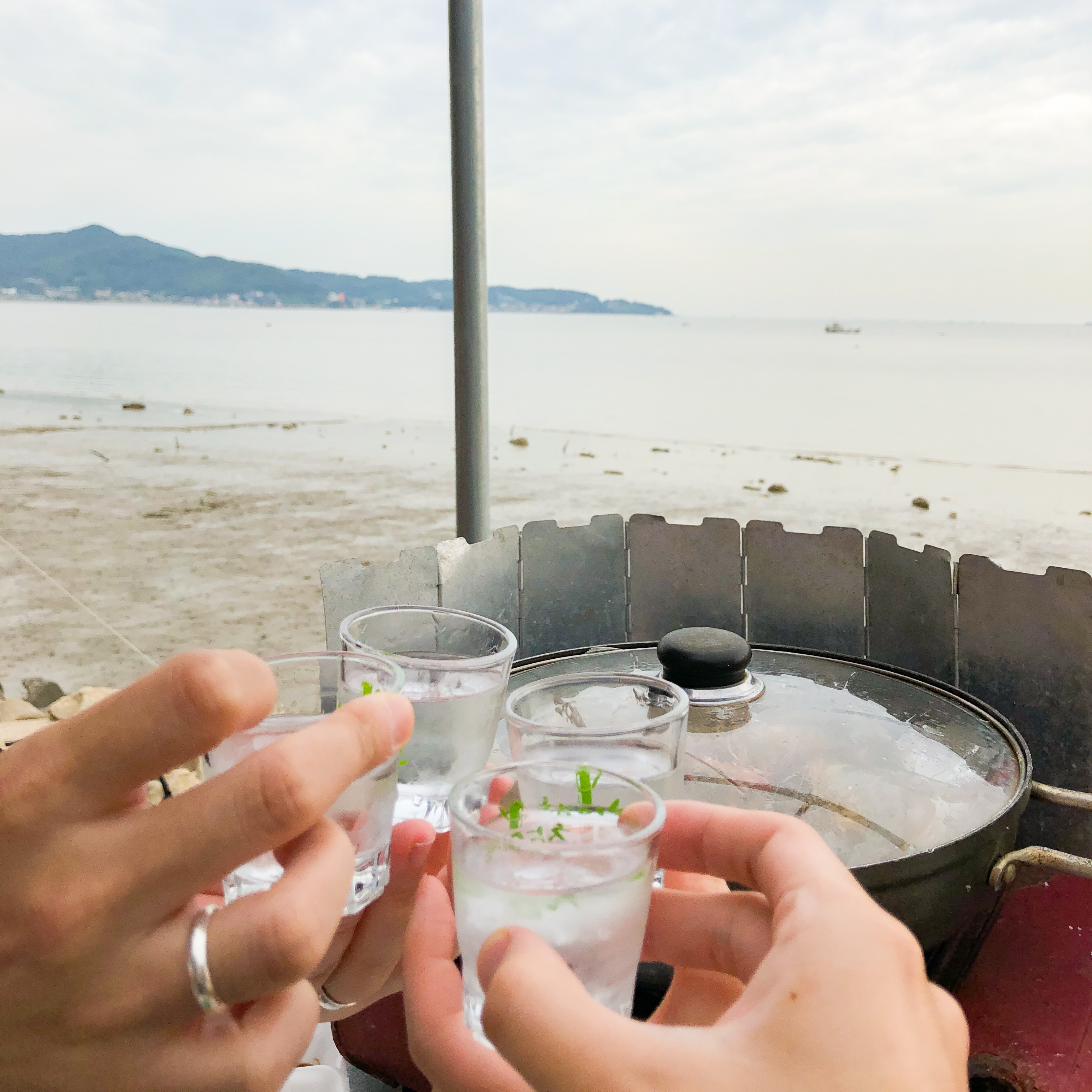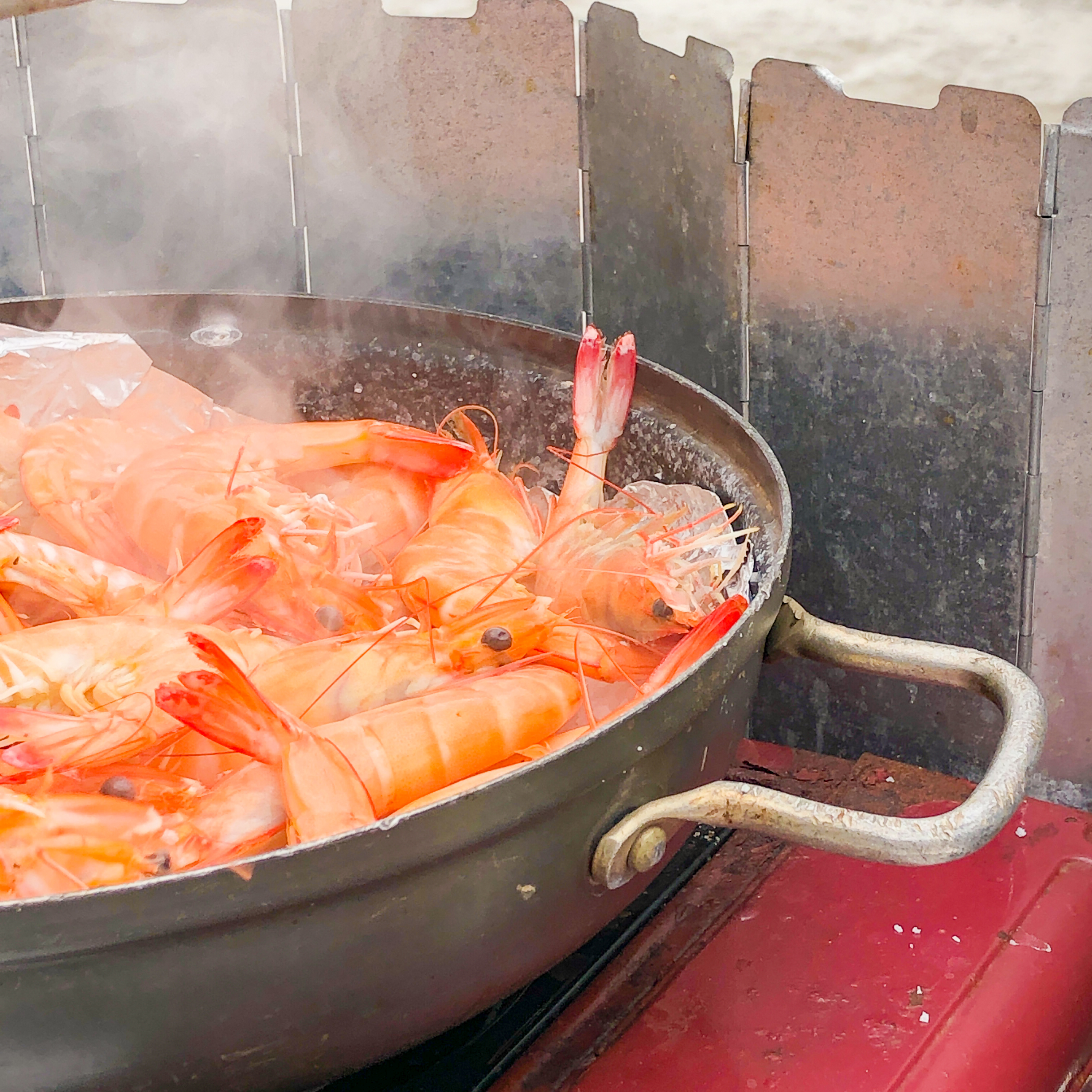 저물어가는 해를 배경으로, 새우도 점점 끝을 보여가고 있어요. 눈 앞에 펼쳐진 드넓은 바다와 맛있는 새우구이를 두고 술이 빠지면 서운하죠? 꿀팁이 있다면, 집에서 새우구이용 버터와 비닐장갑을 따로 챙겨가세요! 비닐장갑이 있다면 조금 더 수월하게 새우를 즐길 수 있을 것 같아요.