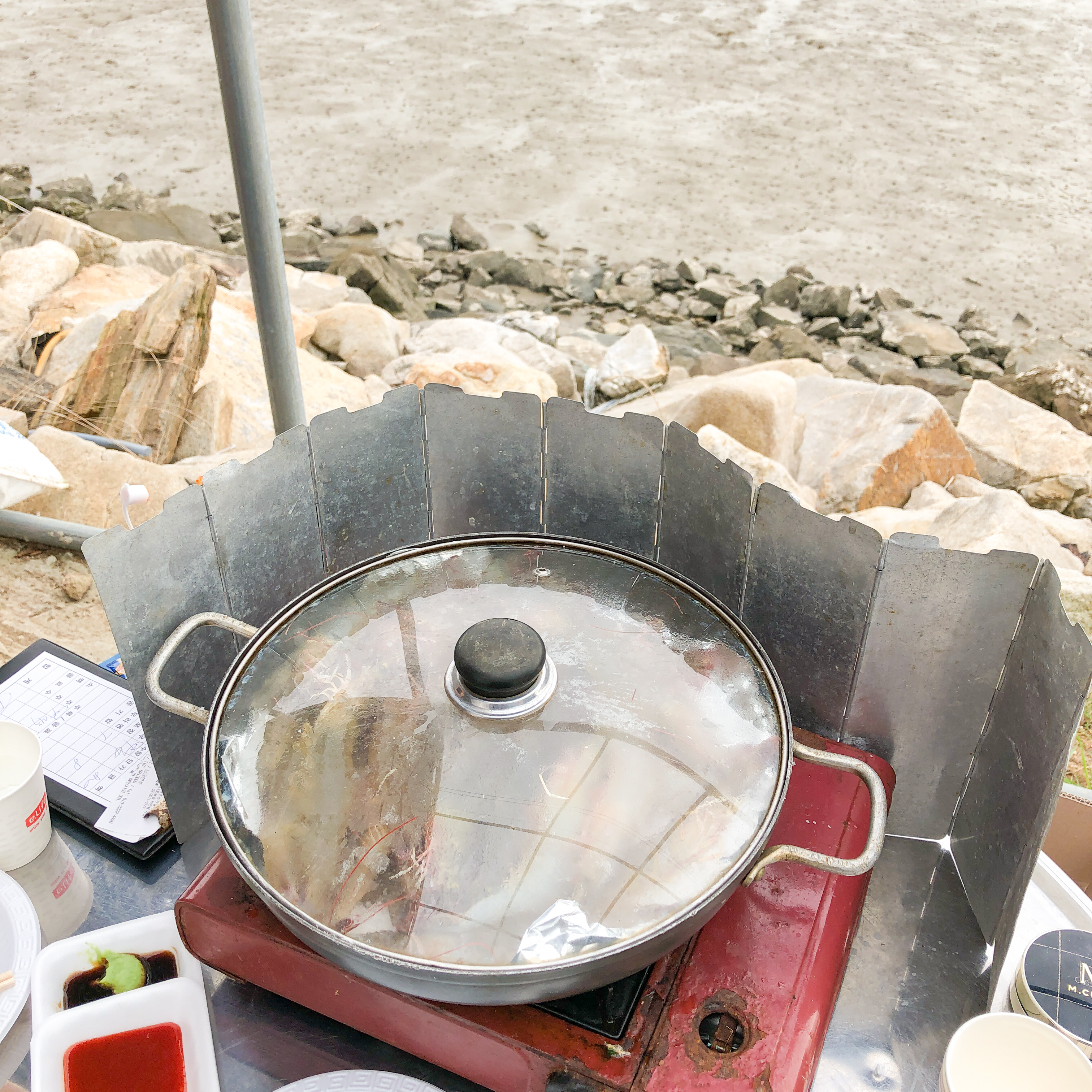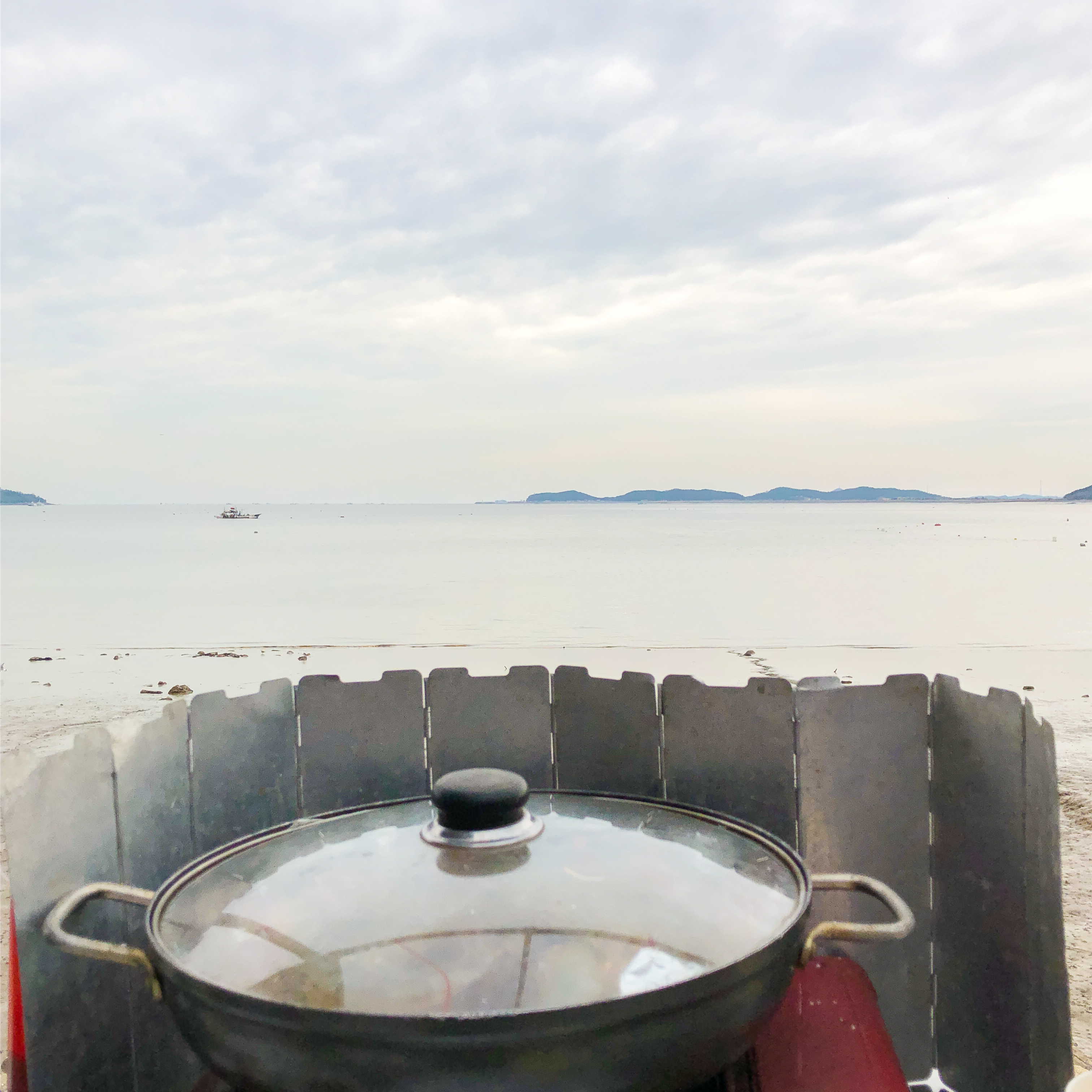 서해 뷰가 펼쳐진 명당자리는 눈치싸움 필수! 자리에 앉으면 소금이 깔린 냄비가 놓여 있고, 바람에 불이 꺼지지 않도록 철판도 준비되어 있었어요.