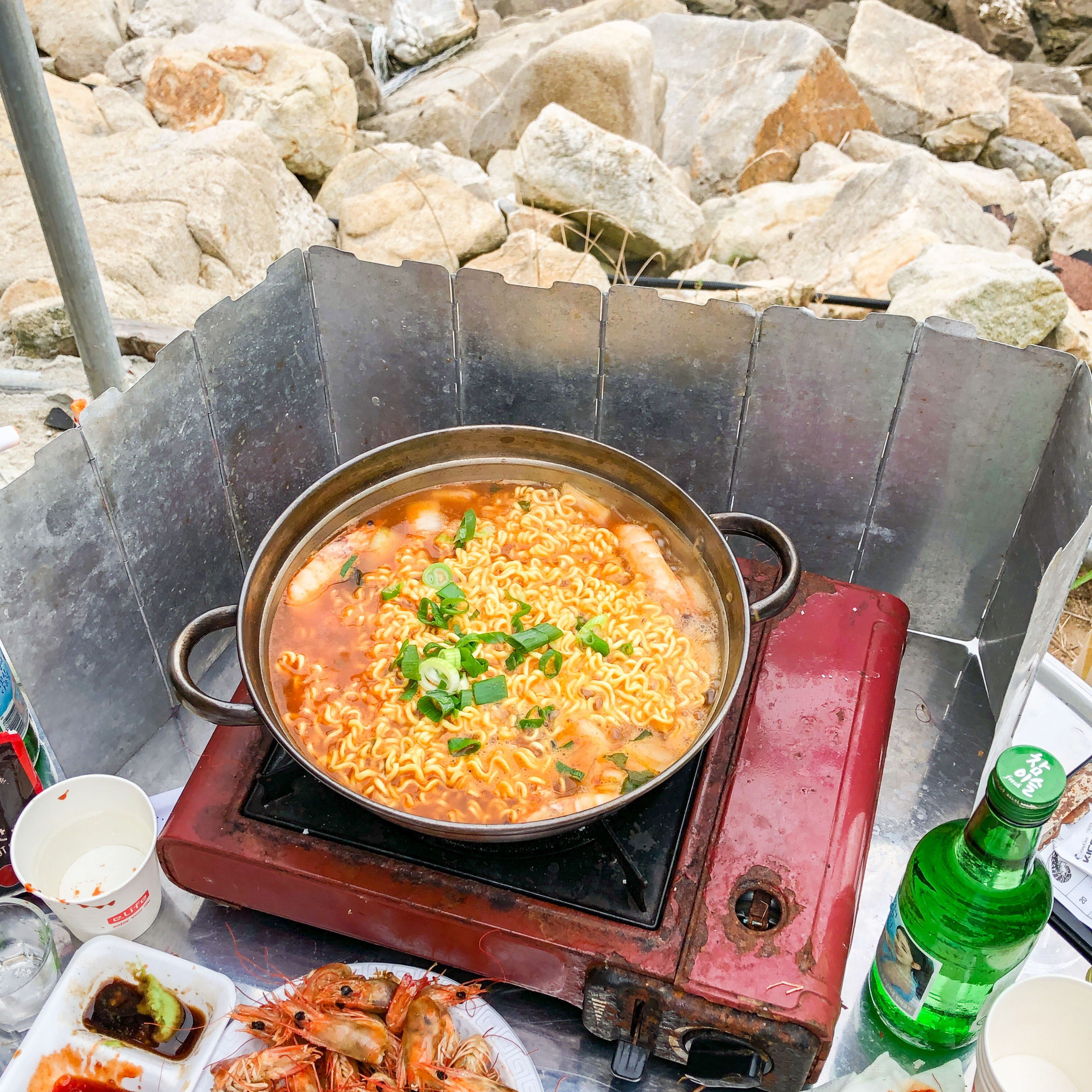 아무리 배가 불러도 꼭 시켜야 하는 새우라면! 버너에 끓여야 하기 때문에 구이가 끝나고 시켜주세요. 새우가 동동 떠 있는 새우라면은 집에서 끓여 먹는 라면보다 감칠맛 나게 먹을 수 있어요. 이때 새우 머리를 함께 넣고 끓이면 더 맛있게 먹을 수 있어요.