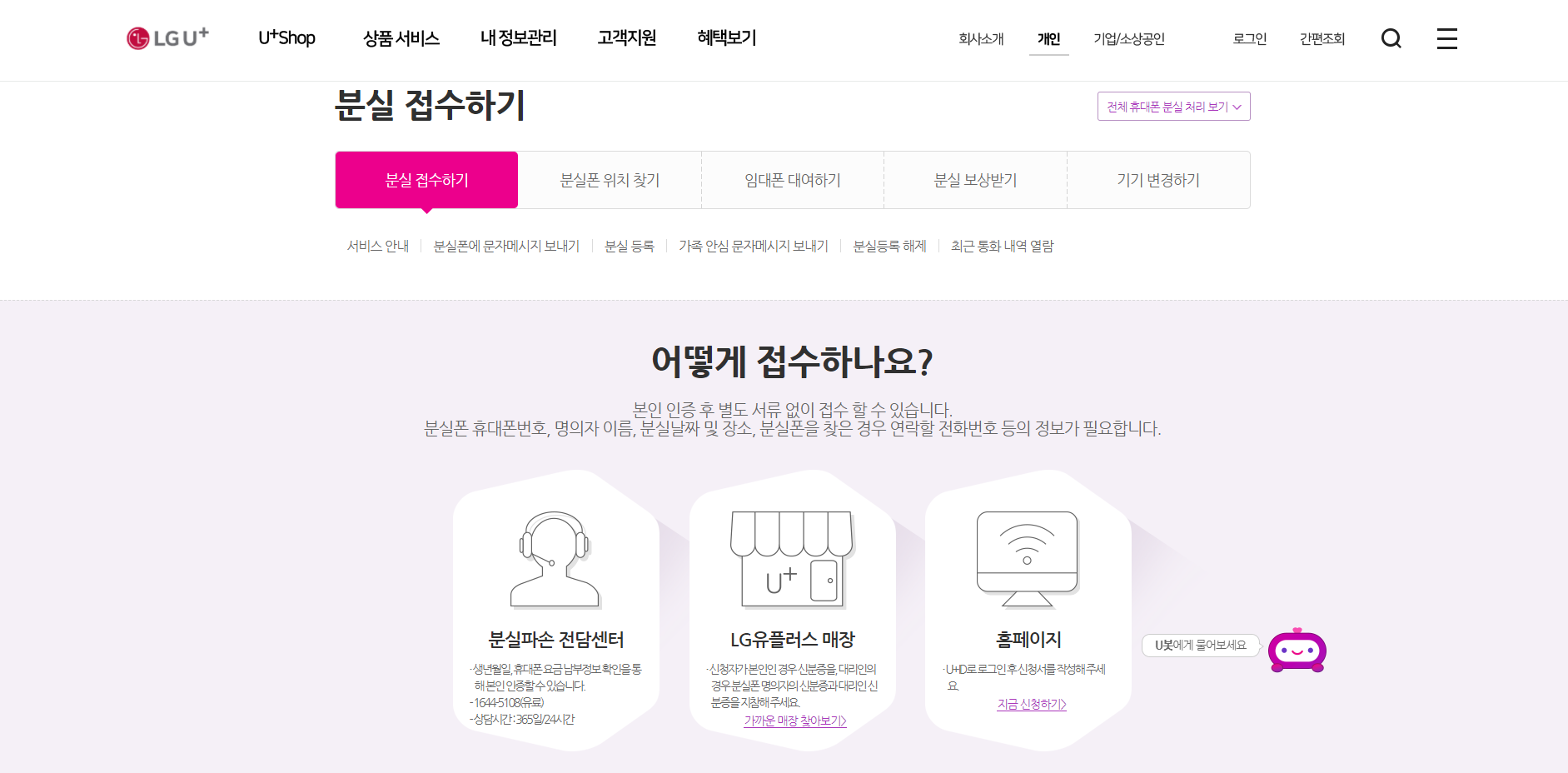 LG U+도 홈페이지 고객지원 메뉴에서 휴대폰 분실 처리 서비스를 안내하고 있어요. 분실 접수 후 휴대폰 위치 찾기, 최근 통화 내역 알람, 분실폰에 문자메시지 보내기, 가족 안심 문자 메시지 보내기, 임대폰 대여하기, 분실 보상받기 등의 기능을 제공합니다. 분실폰의 위치는 휴대폰 전원이 꺼져 있거나, 전파가 닿지 않는 곳은 직전에 확인된 위치가 현재 위치로 표시돼요. 홈페이지에서 직접 확인하거나 지정된 번호로 위치정보 문자 메시지를 받을 수 있습니다.