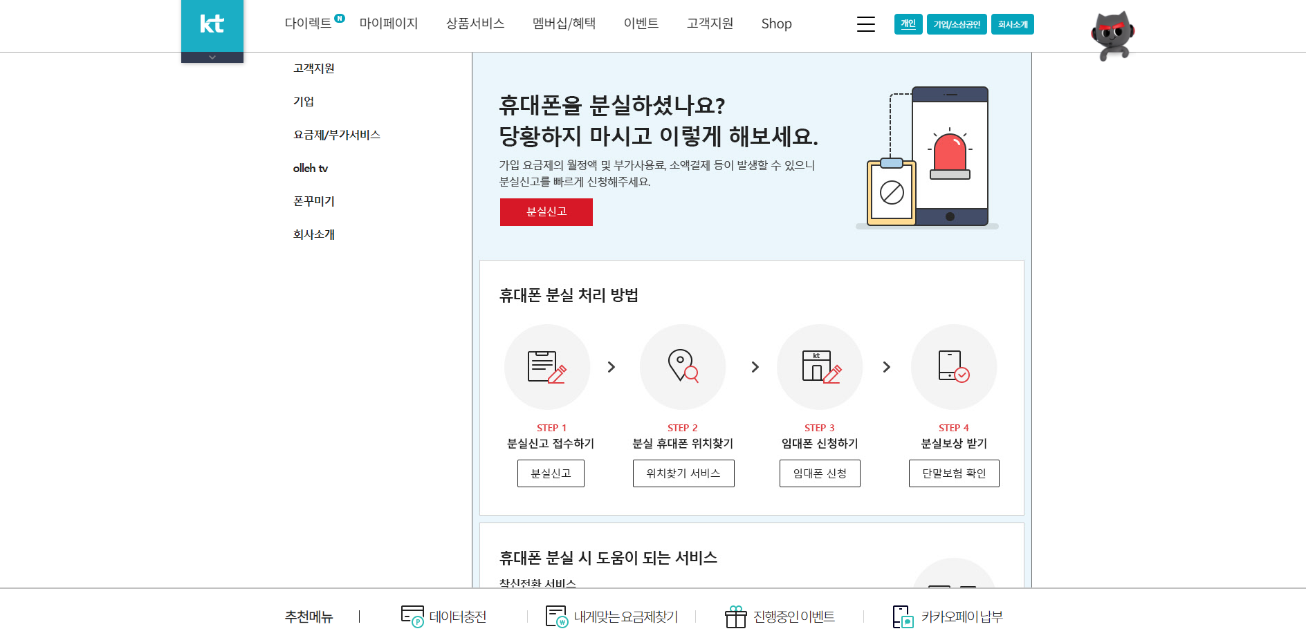 KT에서도 휴대폰 분실 및 위치찾기 서비스를 홈페이지에서 제공하고 있어요. KT 홈페이지에서 로그인 한 뒤, ‘휴대폰 분실신고 서비스’에서 신청하시면 됩니다. 분실신고를 통해 착발신 정지와 함께 분실휴대폰 위치찾기 서비스에 가입하면 분실폰의 위치를 조회할 수 있어요. 당장 이용할 휴대폰이 없으면 전국 올레 플라자 및 직영 매장에 방문해 최대 30일간 무료로 이용이 가능한 임대폰을 빌릴 수도 있습니다.