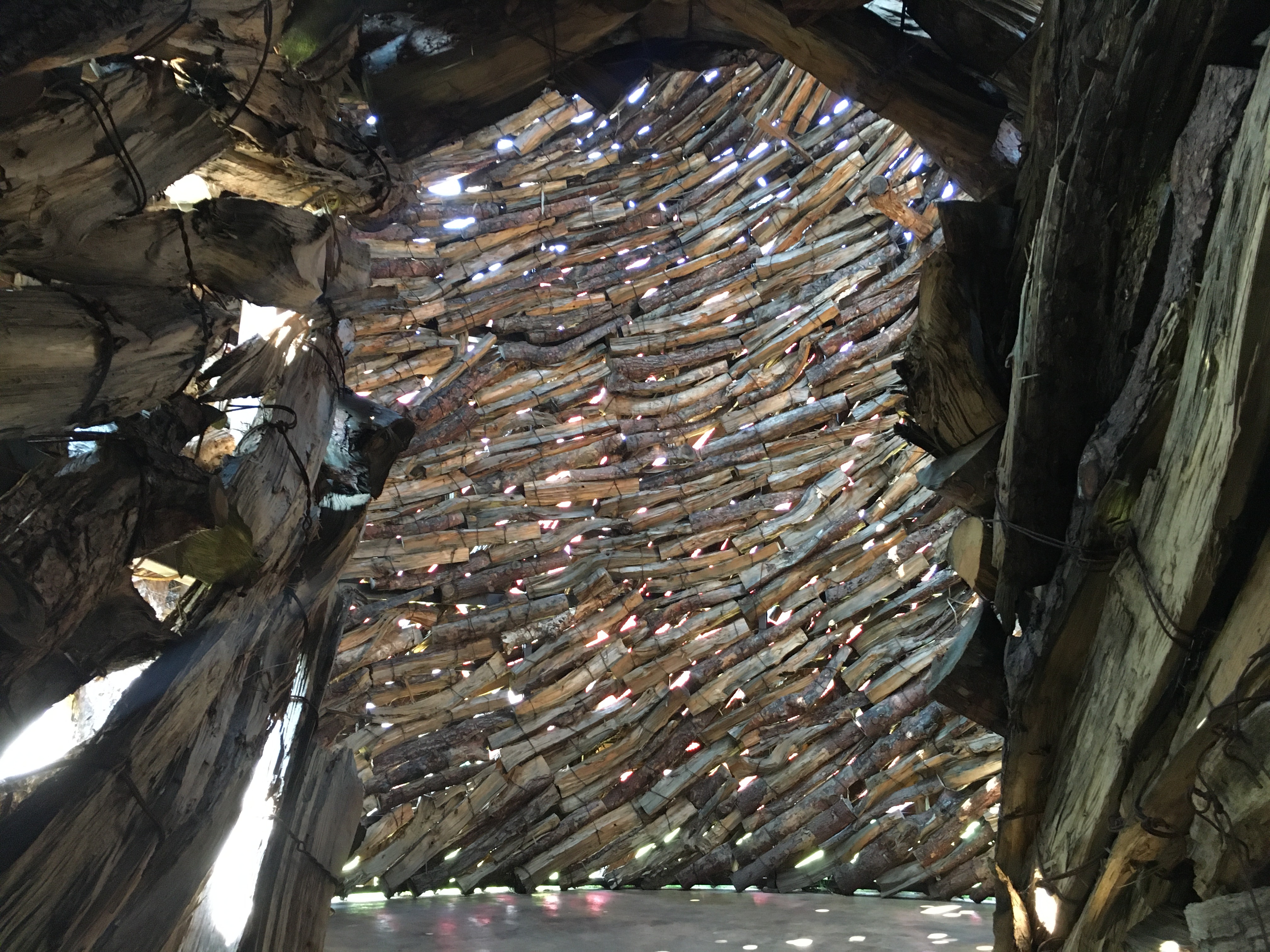 강원도 소나무와 박달나무, 참나무로 만든 장작을 사용했는데 어느 하나 같은 것이 없습니다. 철골 빔으로 돔의 뼈대를 만든 뒤, 장작을 철사로 일일이 엮어서 쌓아 올렸어요. 작품에 들어간 장작은 무려 200톤에 이른답니다.