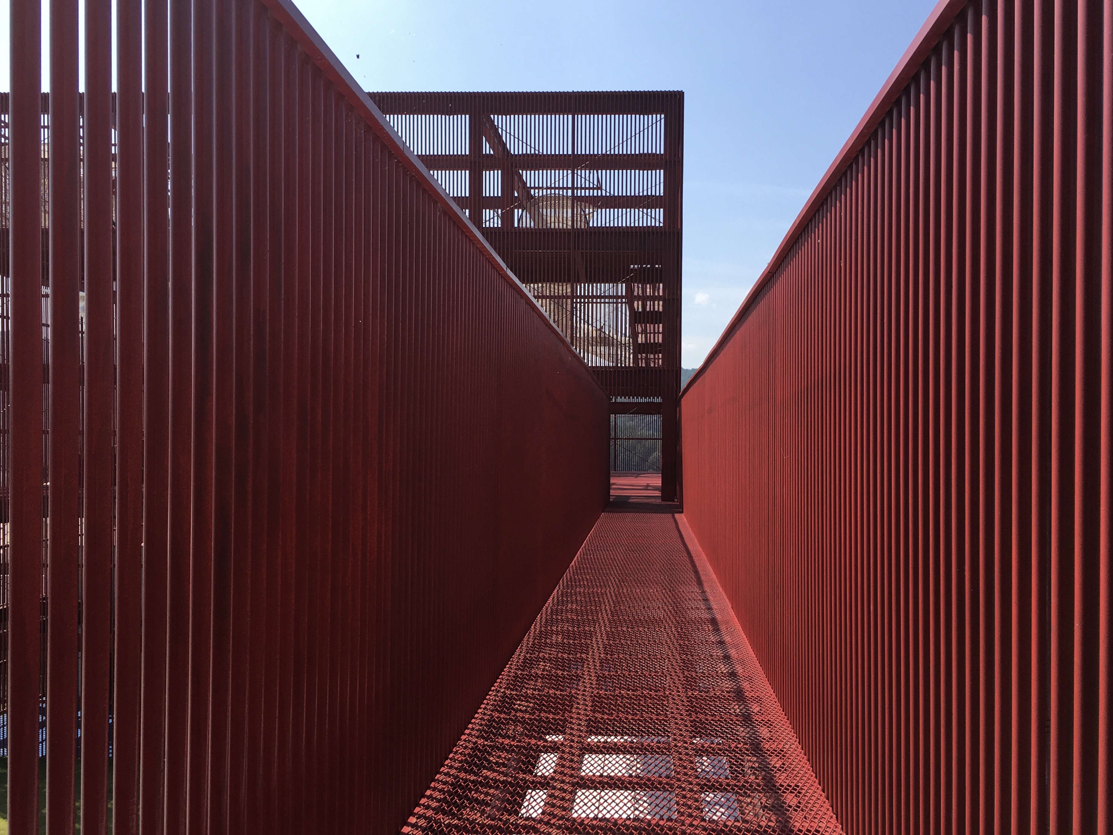 하얀 구름이 떠다니는 푸른 하늘, 저 멀리 보이는 초록색 산들과 대비되어 쭉쭉 뻗어 올라간 강렬한 붉은 대나무 숲. 어우러진 모든 것을 작품으로 만들어 버린 비현실적인 장면입니다. 건축용 금속 파이프 여러 개를 이은 연결 마디가 멀리서 보면 대나무처럼 생겼어요.