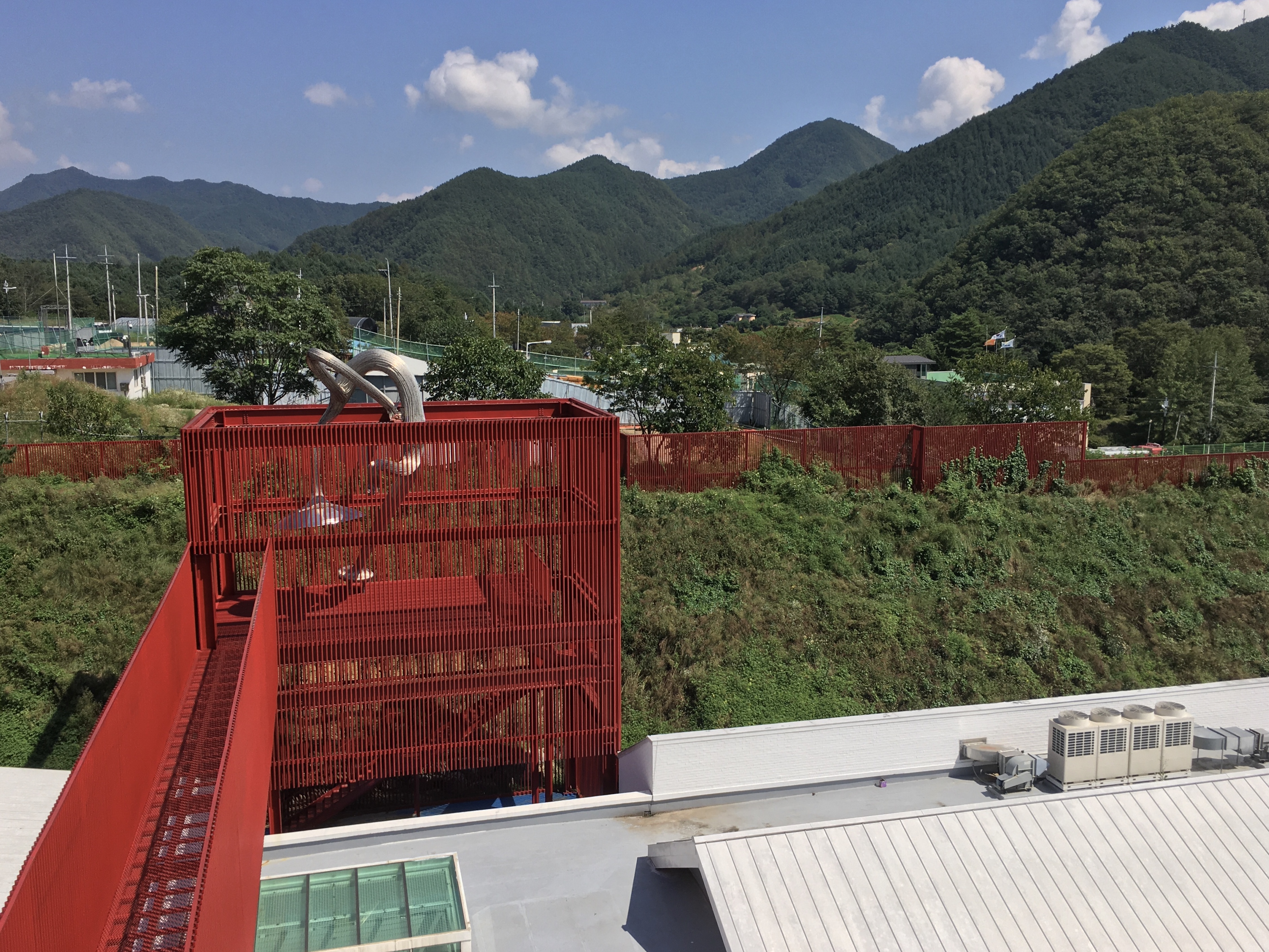 ‘젊은달와이파크’의 실내 전시와 야외 설치 작품은 하나의 동선으로 리드미컬하게 이어집니다. 야외 설치 작품인 ‘목성’에서 시작해 실내에서 작품을 구경하고, 다시 야외 구조물인 ‘붉은 파빌리온’으로 올라가는 식이죠.