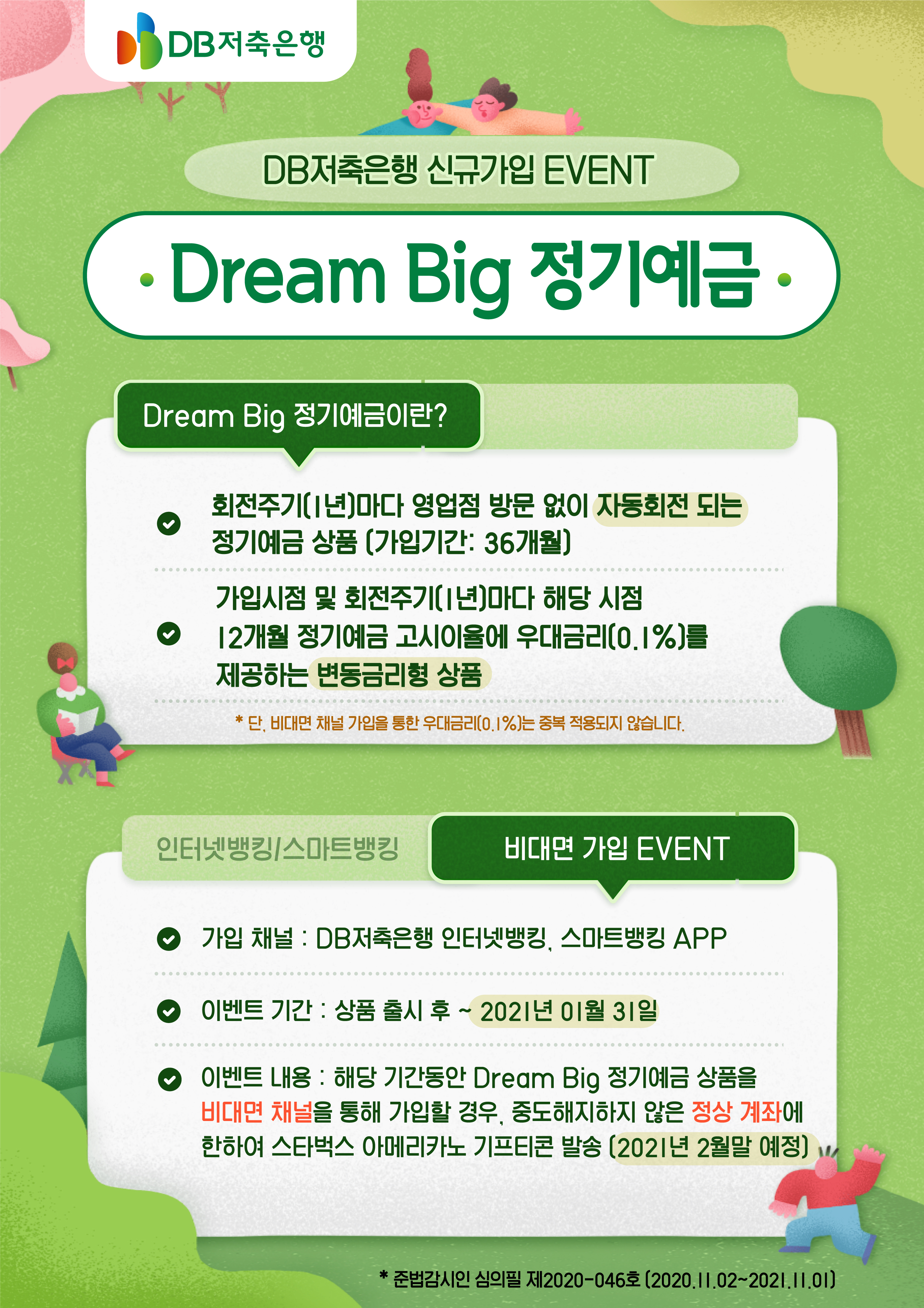 1972년 업계 1세대로 설립된 DB저축은행은 신상품 출시와 더불어 창립 48주년을 맞은 기념으로 고객 감사 이벤트를 진행한다. 2021년 1월까지 인터넷뱅킹 혹은 스마트뱅킹 채널을 통해 신규 출시하는 Dream Big 정기예금 상품에 가입할 경우, 모바일 기프티콘을 발송할 예정이다. 또한, 기존 Dream Big 정기적금 이용고객이 Dream Big 정기예금을 이용할 경우나 기존 거래고객이 새로운 고객을 추천할 경우에도 별도의 기념품을 제공할 예정이다.