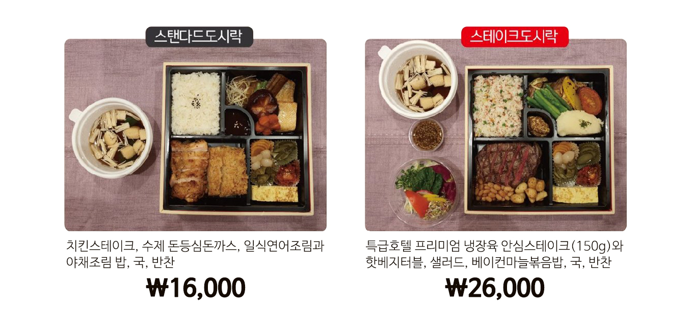 대표메뉴인 안심스테이크를 비롯해, 인기메뉴를 도시락에 정성껏 담았습니다.