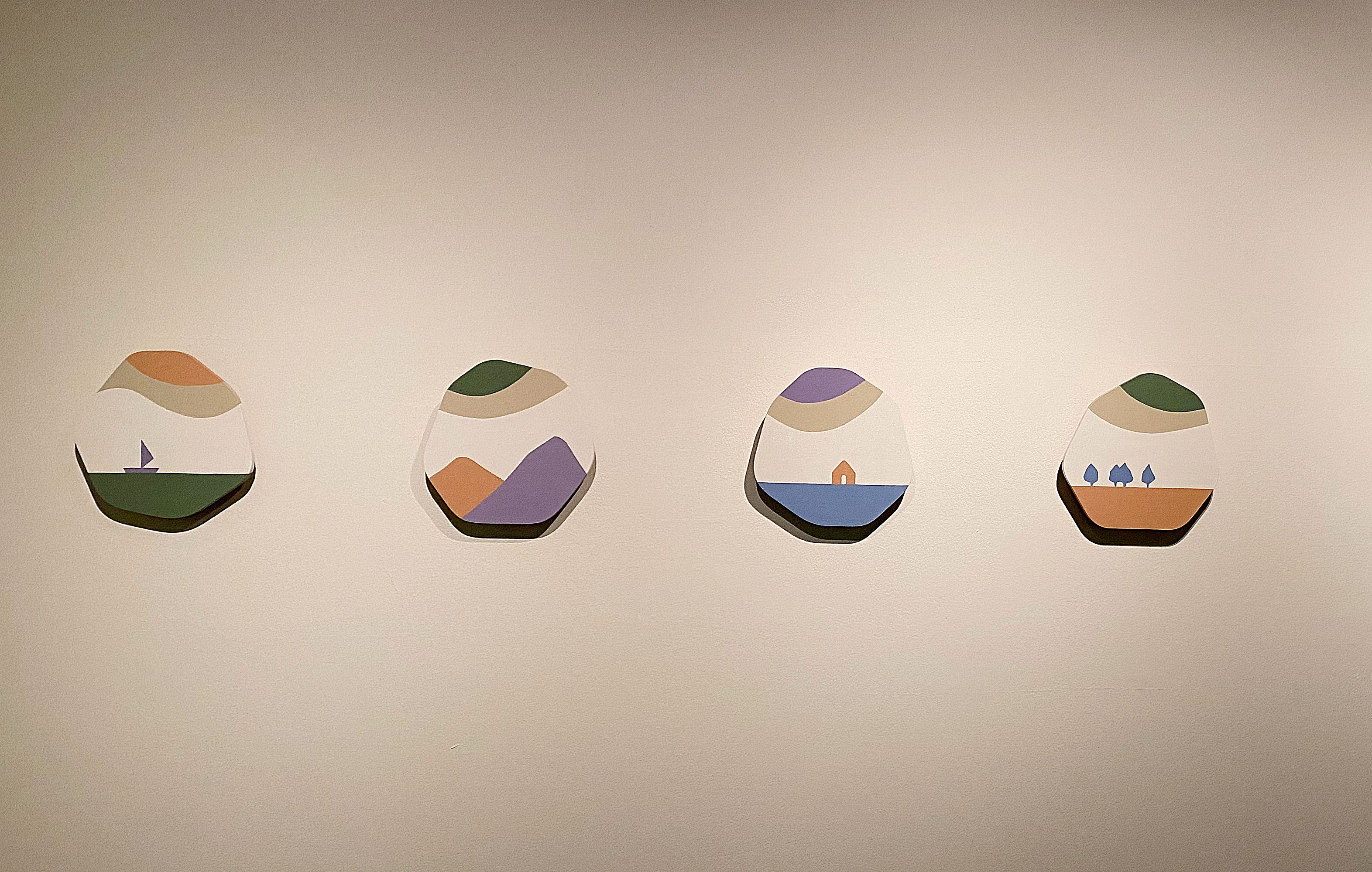 전시의 중간쯤, 단순하지만 어딘가 모르게 귀여운 작품들이 또 하나 보이는데요. 바로 홍순용 작가의 캔버스입니다. 바쁜 현대인의 삶은 복잡하고, 그로 인해 머릿속은 혼란스럽기만 합니다. 작가는 그런 순간에도 자신의 내면을 침착하게 균형을 이루어 가야 한다는 메시지를 작품으로 표현하고자 했다고 해요. 단순화된 풍경을 통해 정제된 동양화의 정신을 현대적인 도상으로 재현해냈는데요. 단순한 구성과 따듯한 색감은 심신을 차분하게 만들고, 삶의 ‘균형’을 찾아 불안함과 걱정, 욕심과 미련을 내려놓을 수 있는 순간을 선사합니다.