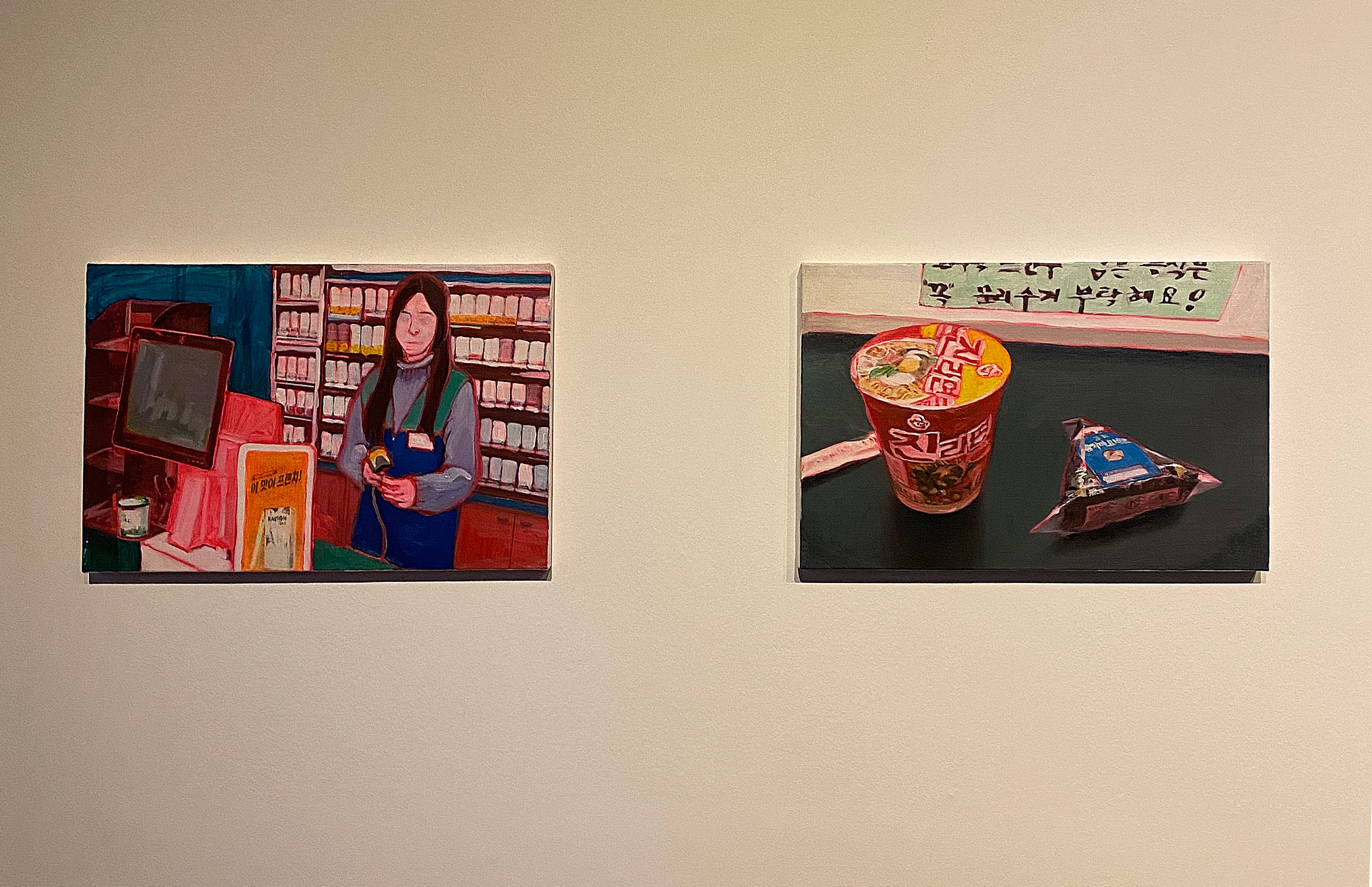 편의점 아르바이트를 하며 삼각김밥과 라면으로 끼니를 때우는 청춘들, 텅 빈 농구장의 햇볕이 시간을 따라 점차 사라지는 동안 누군가를 기다리는 듯 쓸쓸해 보이기도 하죠. 나수민 작가는 많은 인파 속에서 상대적으로 대비되는 외로움이 아이러니한 도시의 특성이라고 생각했습니다. 어떻게 보면 작품 속에서 색감과 대비되게 현실을 적나라하게 표현했다고 느낄 수 있지만, 반대로 차가운 청춘들의 현실에 따뜻한 핑크빛으로 조용한 위로를 전하고 싶었을지도 모르겠어요.