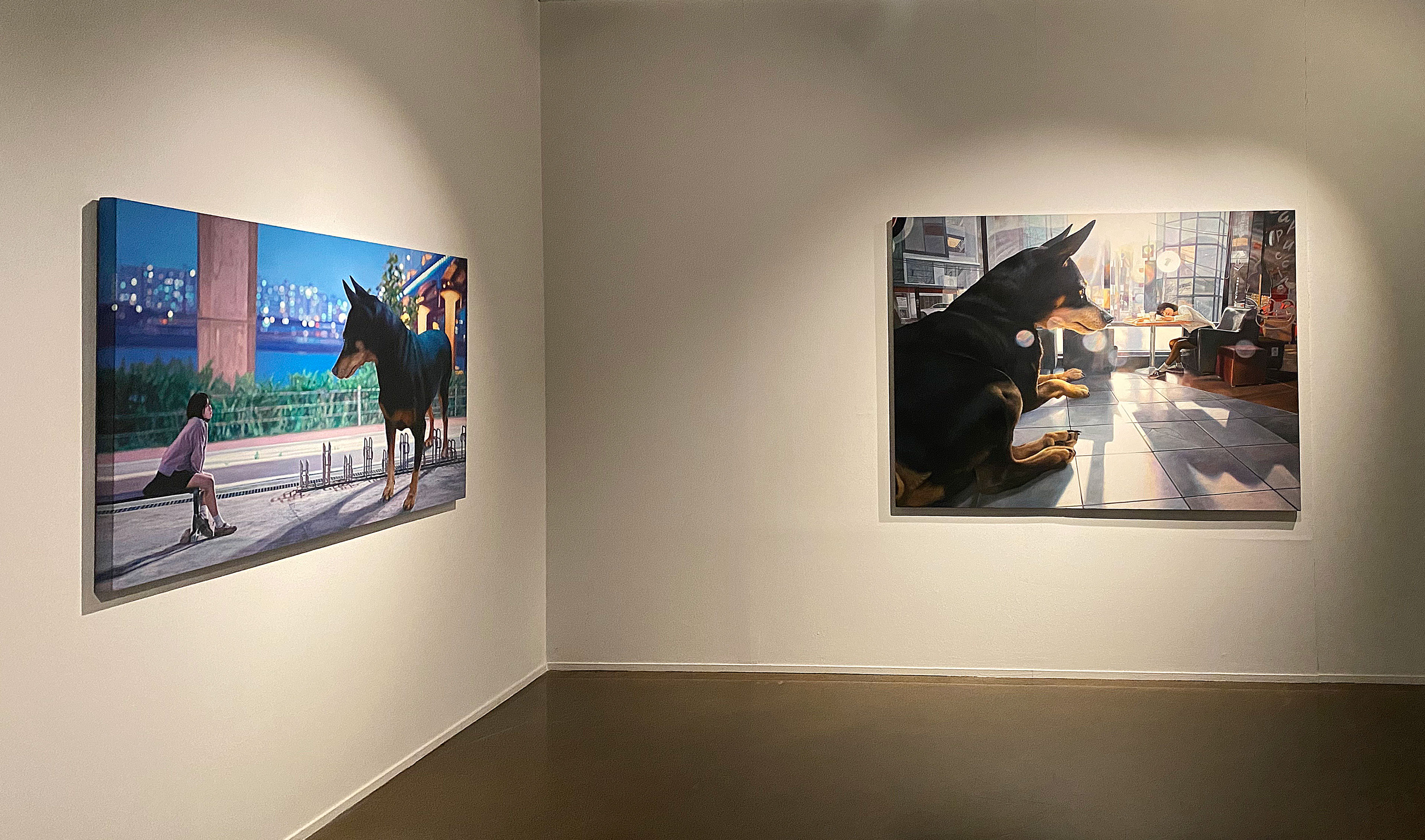 혼자 사는 사람들, 또는 아이를 키우지 않는 소가족이 늘어나면서 반려동물은 인간에게 다양한 행복감을 주는 존재들이죠. 인간의 손에 보살펴지지만, 그들이 주는 따스한 위로는 그 이상이 아닐까 싶어요. 정우재 작가의 작품은 반려동물들과 관련된 ‘판타지’를 보여주고 있습니다. 현실 세계에서는 존재할 수 없는 거대한 크기의 반려견들은 거대하고 무서운 느낌이 아니라, 신뢰하고 싶고 의지하고 싶은 존재로 표현됩니다. 신뢰의 관계가 바탕이 된 ‘정서적인 안정감’을 표현한 반려견들은 바쁜 도시 생활 속 지친 현대인의 삶을 위로하고, 편안함을 느끼게 해줍니다.