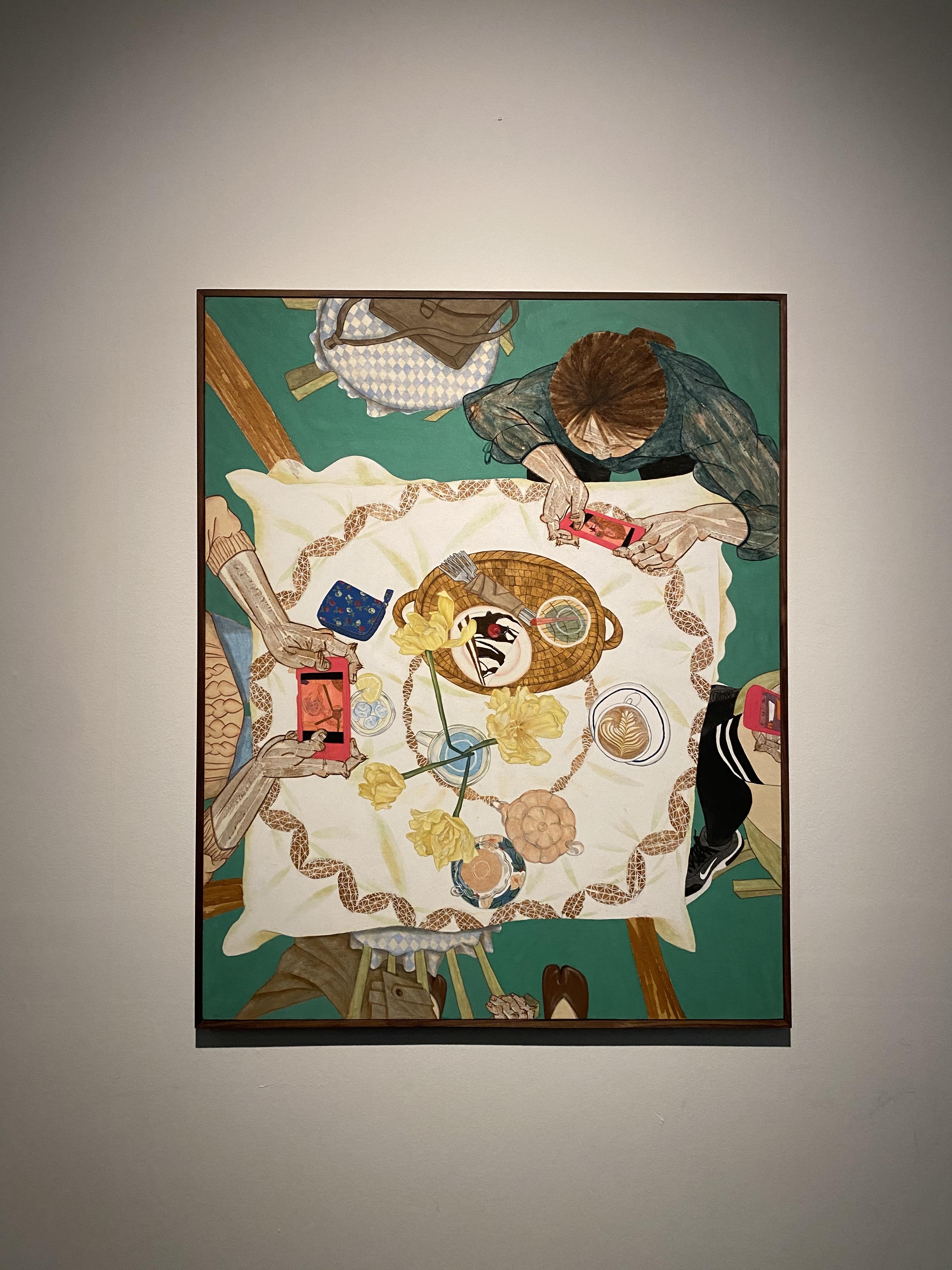 이채원 작가는 따뜻하고 왁자지껄한 정겨운 식사 시간을 모티브로 작품들을 그려냈어요. 단순히 배를 채우는 시간이 아닌, 다양한 관계 속에서 대화를 나누고 사회 구성원으로서의 ‘나’를 다시 한번 확인하는 시간을 그려낸 것이죠. 특히, 각 작품의 제목이 직관적으로 그림을 나타내고 있어 그림을 먼저 보고 어떤 상황인지 생각하며 제목을 비교해보는 것도 재미있더라구요. “마음은 급하지만 포기할 수 없어” 맛있는 음식들을 당장 맛보고 싶지만, 인증샷을 남기기 위해 카메라를 먼저 꺼내는 요즘의 우리들을 위트 있게 표현한 제목인 것 같죠?