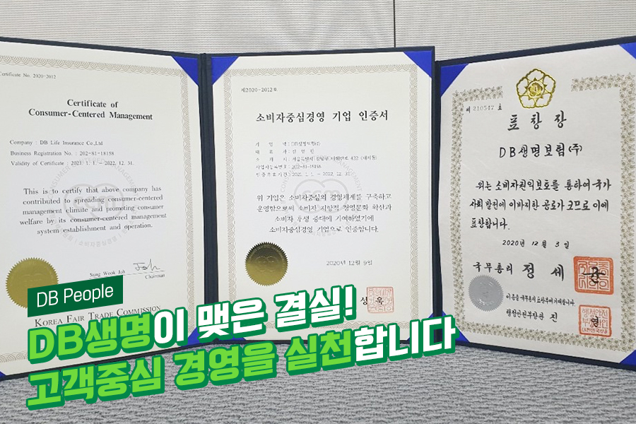 DB생명은 지난 12월 3일 ‘제25회 소비자의 날’ 기념식에서 소비자 지향적 경영 문화의 확산과 소비자 권익 증진에 기여한 기업에게 수여하는 ‘2020년 올해의 소비자중심경영(CCM) 우수 인증 기업’ 최우수상인 국무총리표창을 수상했다. 2015년 ‘소비자중심경영’을 선포한 이래 고객만족 경영을 위해서 꾸준히 실천해온 결과로 받아들여진다. 소비자정책팀을 찾아 소비자를 최우선에 둔 DB생명의 고객중심 경영 노력과 성과를 알아봤다.