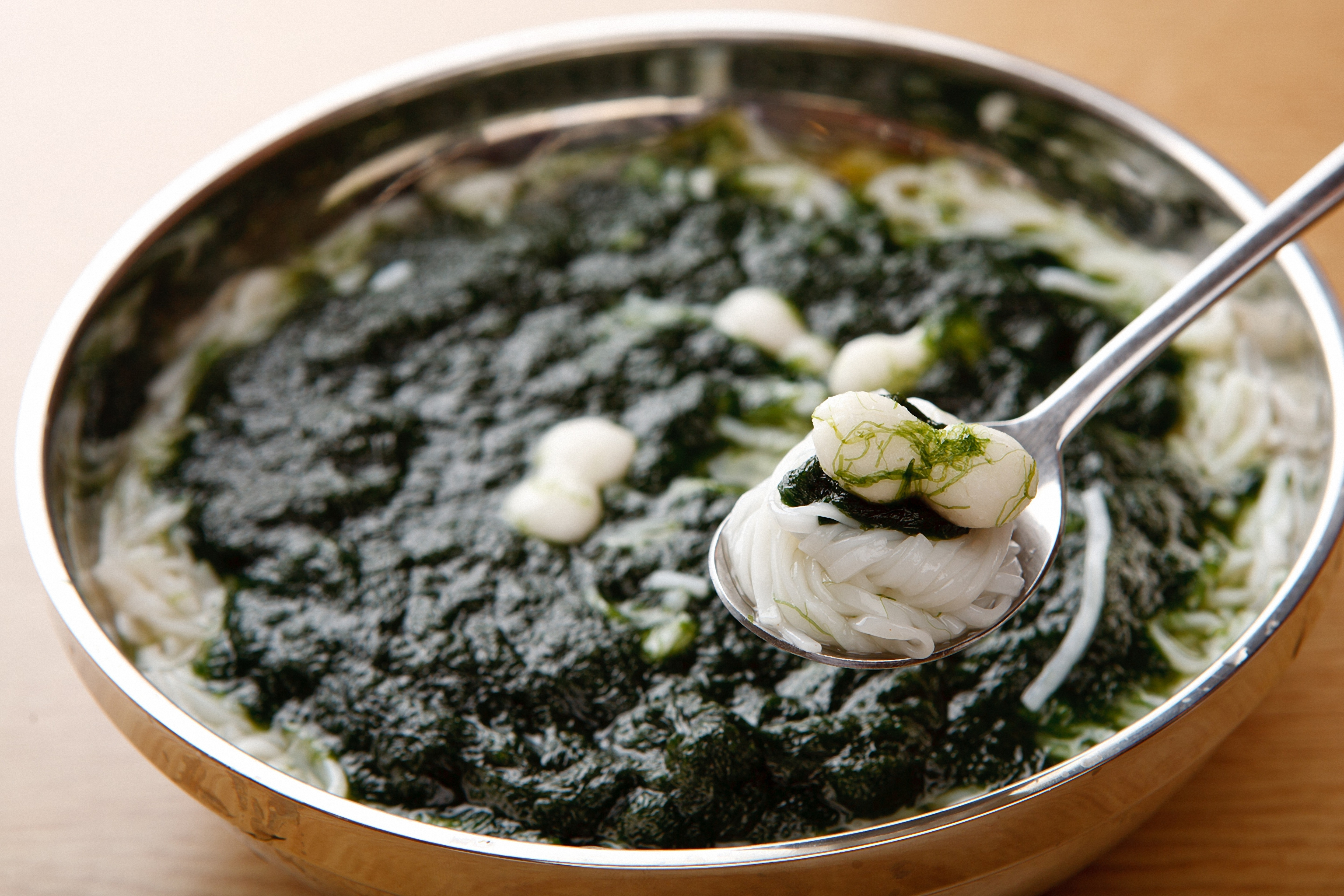 매생이를 모르는 사람은 거의 없지만, 생생한 매생이는 여전히 우리에게 다소 낯선 것 같아요. 초록의 실오라기 같은 것이 덩어리져 있는 모습은 겨울철이면 시장에서 종종 보니 익숙하다 쳐도, 막상 매생이를 만져보면 그 기묘한 촉감에 당황스럽기 일쑤예요. 흐물흐물하고 진득한데 물처럼 흘러버리는 이것은 도대체 무엇일까, 어떻게 하면 좋을까 싶죠.