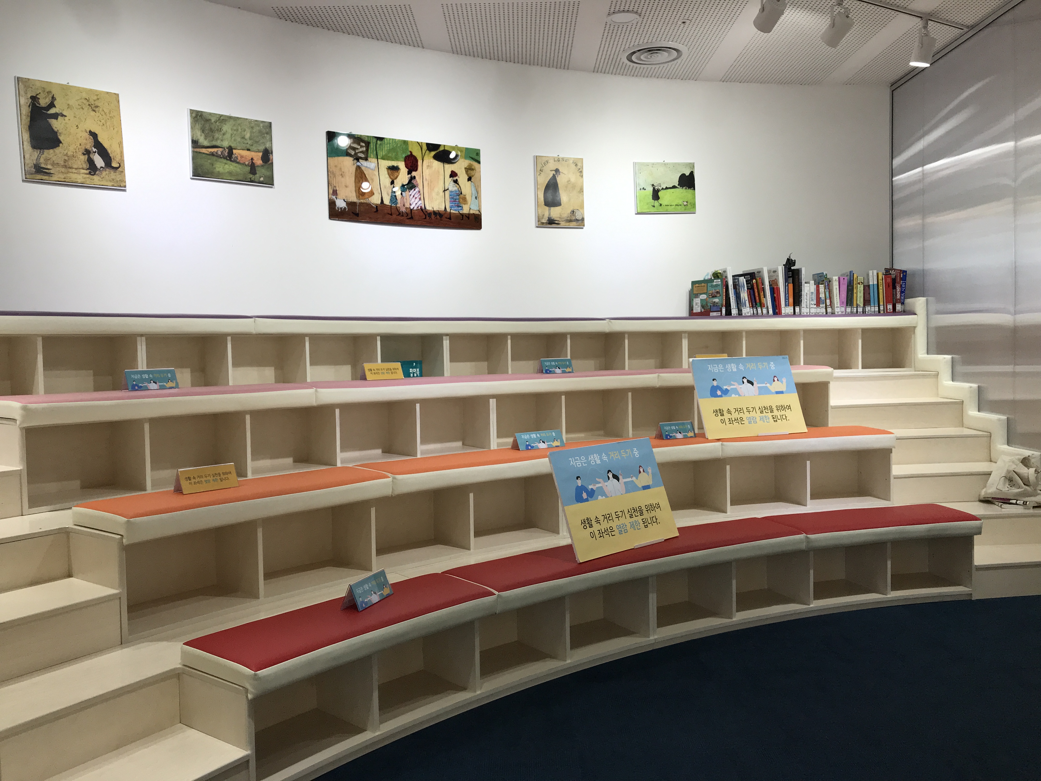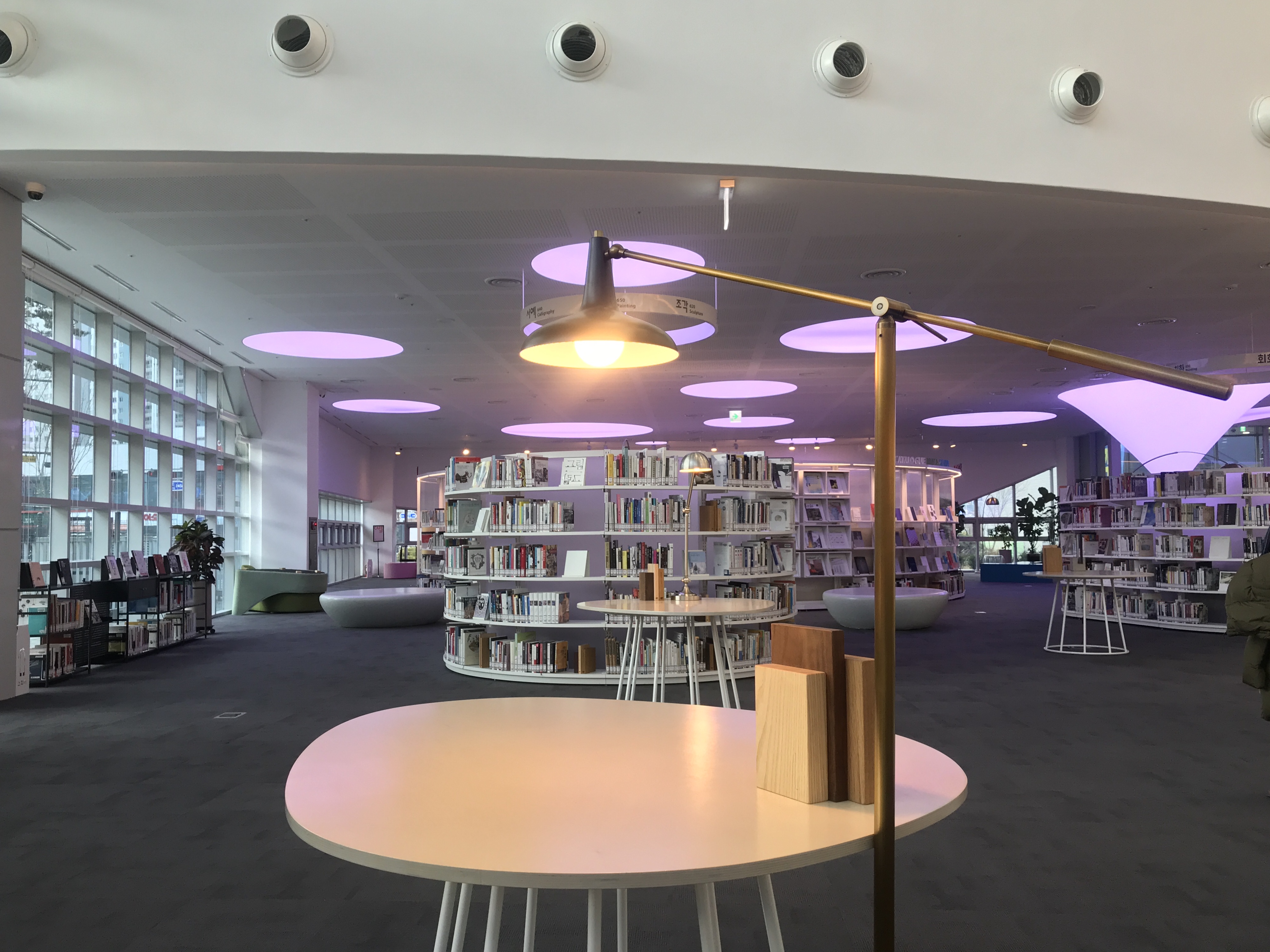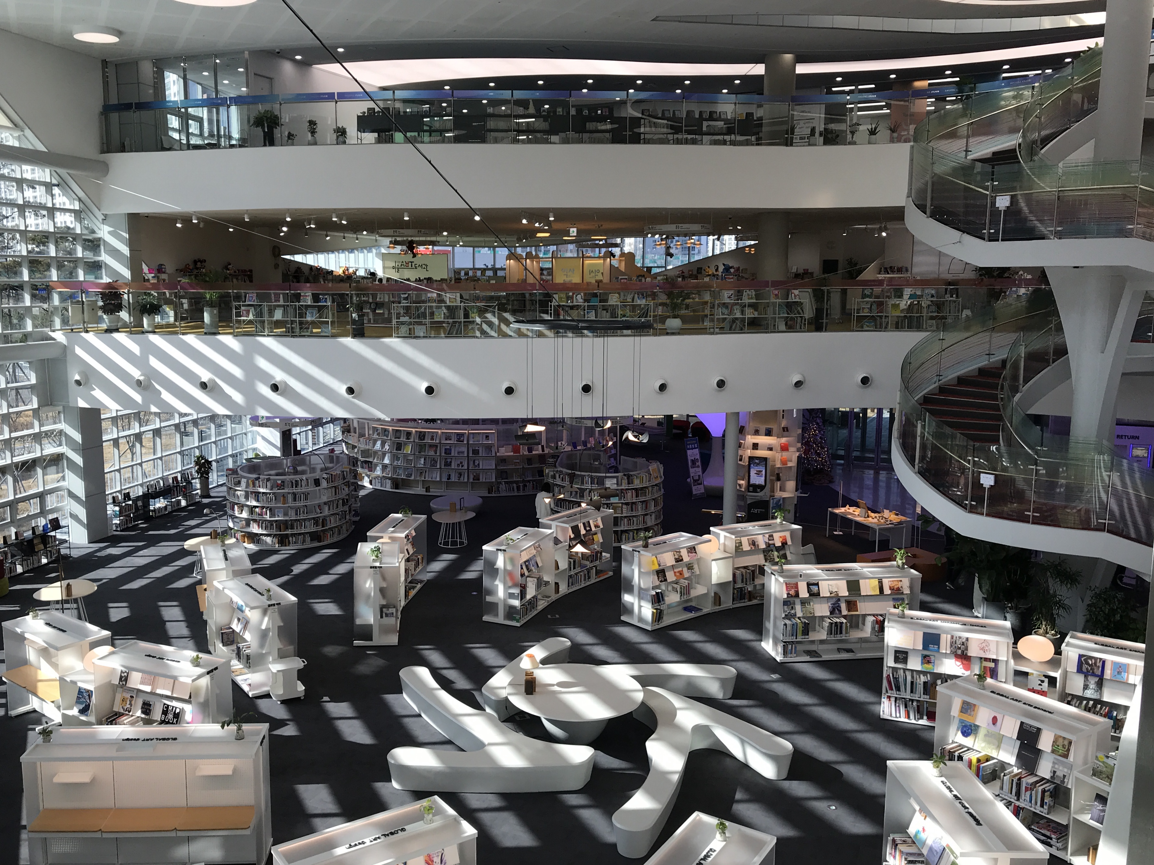 하얀 책장은 일반적인 도서관처럼 높고 다닥다닥 붙어있는 형태가 아니어서 갤러리를 둘러보듯 편안한 느낌이 들어요. 벽면 서가를 제외하고 높지 않은 반투명 아크릴 소재로 제작하여 책 속에서 답답한 느낌이 들지 않도록 배치되어 있답니다.