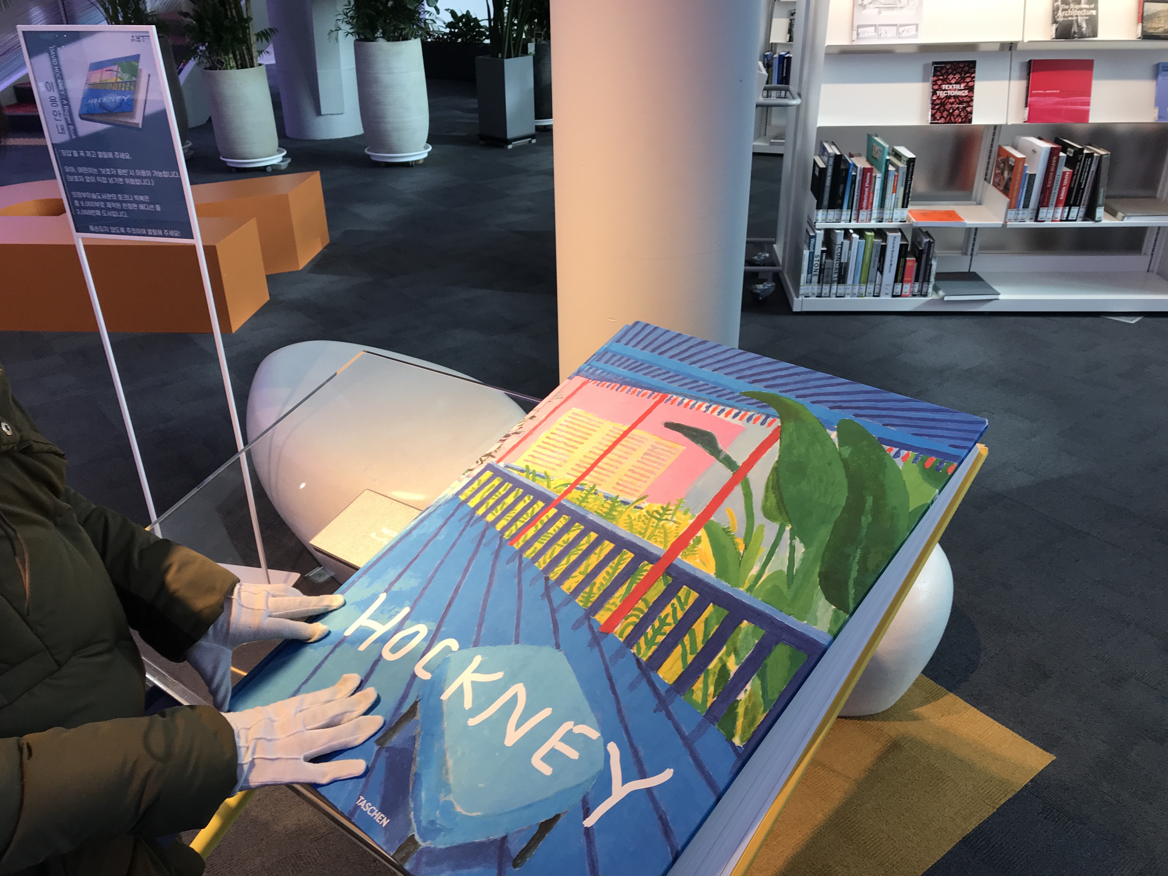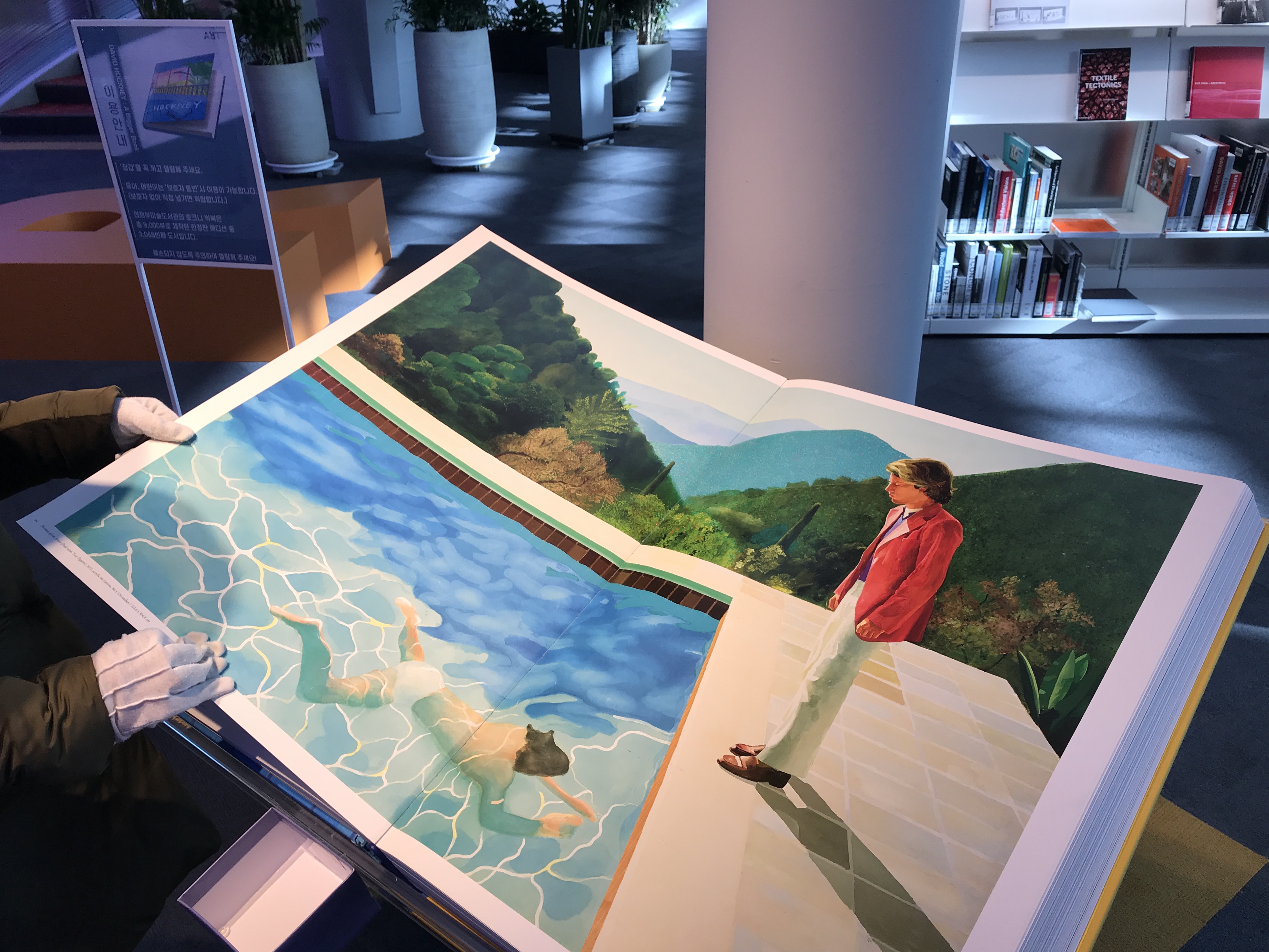 또 하나 지나칠 수 없는 책이 ‘호크니 빅북 (DAVID HOCKNEY : A Bigger Book)’이에요. 의정부 미술도서관의 ‘호크니 빅북’은 총 9,000부로 제작된 한정판 에디션 중 3,068번째 도서입니다. 구비되어 있는 장갑을 꼭 끼고 훼손되지 않도록 주의해서 열람해 주세요.