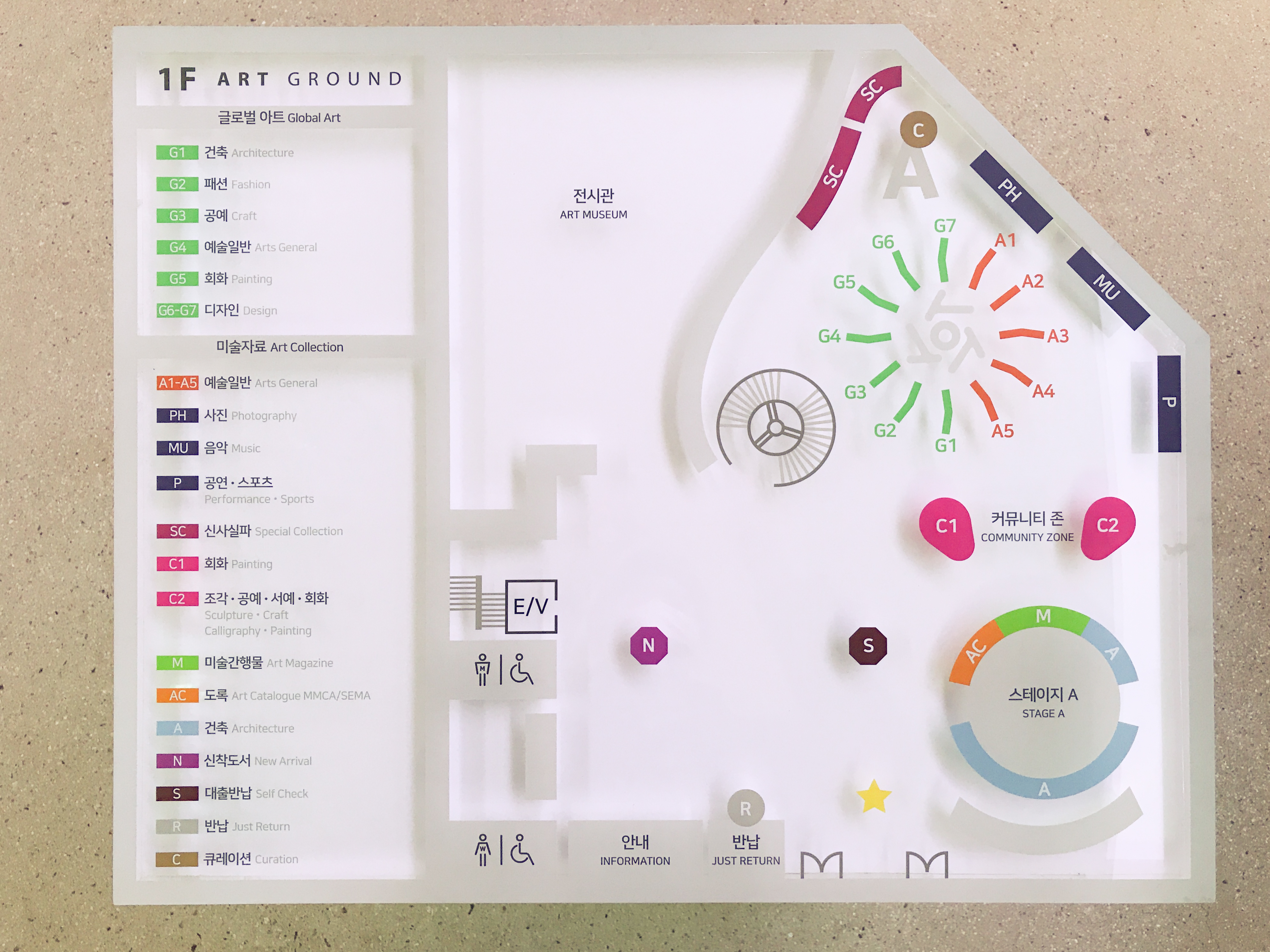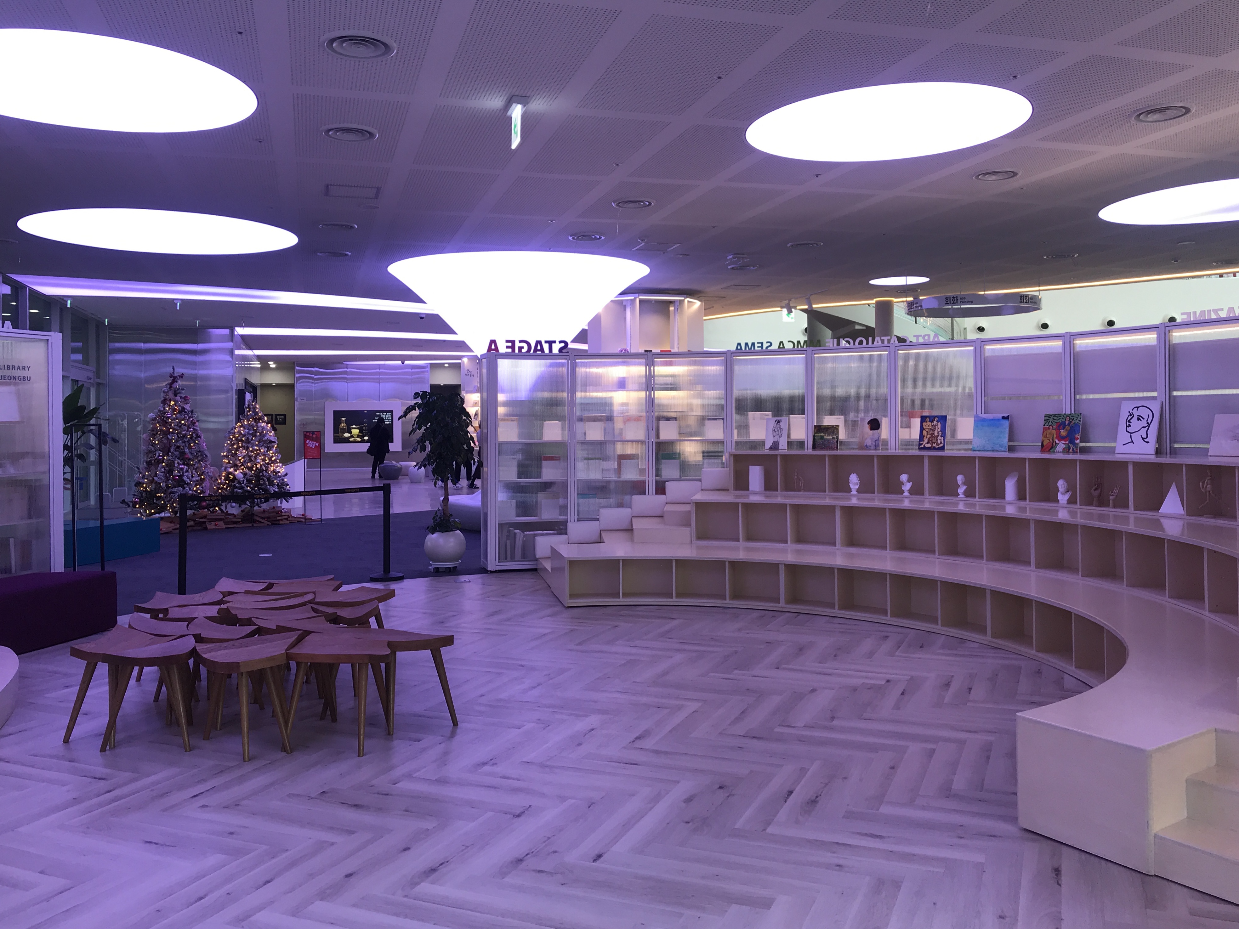 1층은 미술 전문영역으로 미술자료와, 신사실파 자료, 미술간행물, 국립현대미술관 도록 등의 미술 관련 자료와 스테이지A, 전시관이 있어요.