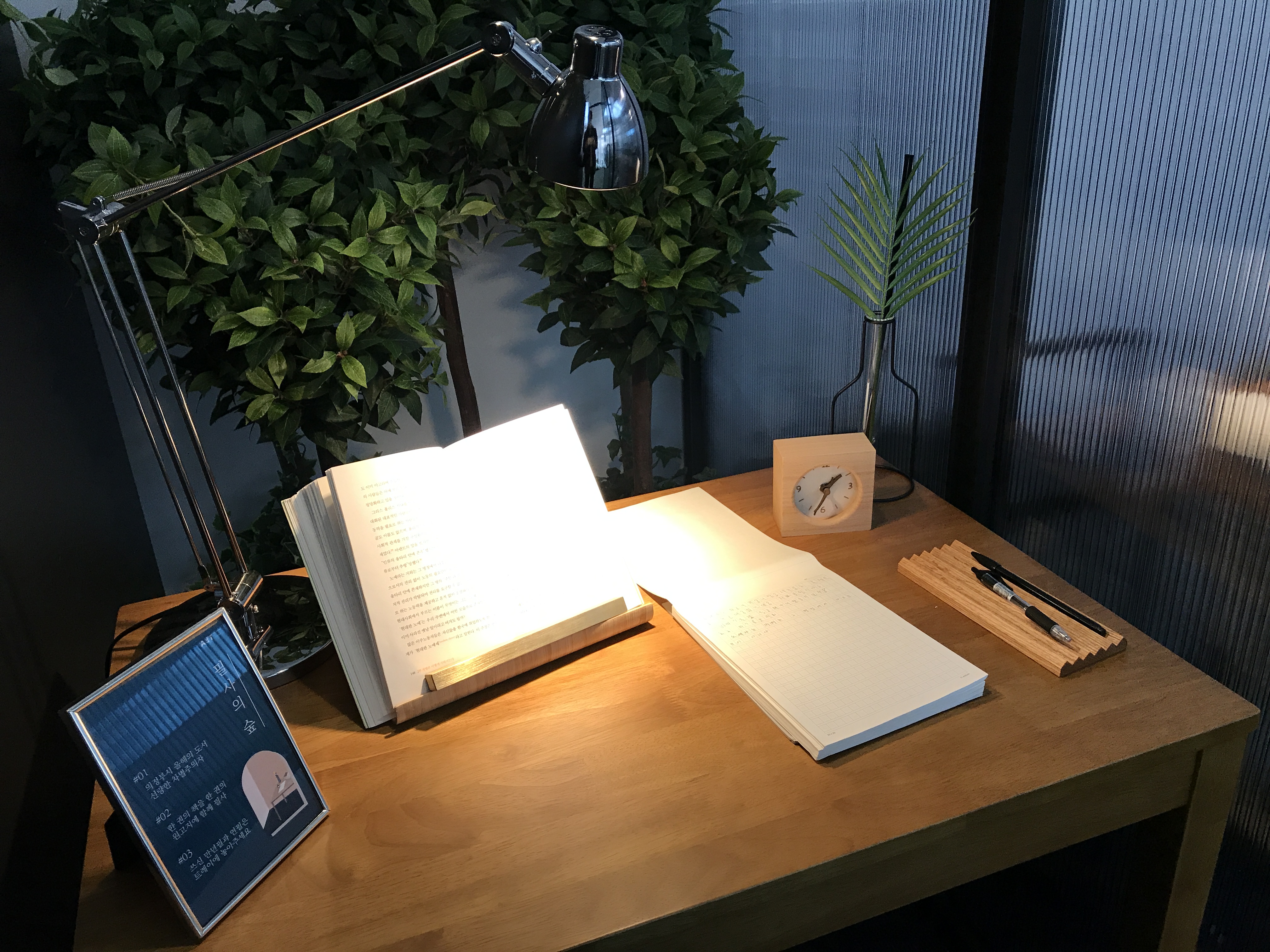 2층 일반자료 열람공간 쪽에 카피 존이 있는데, ‘필사의 숲’으로 꾸며져 있어요. 의정부시가 선정한 ‘올해의 도서’를 시민들이 함께 한 권의 원고지에 만년필로 필사해서 한 권의 책으로 만들어가고 있답니다. 지금은 김지혜 작가의 『선량한 차별주의자』를 함께 적어 나가고 있어요.