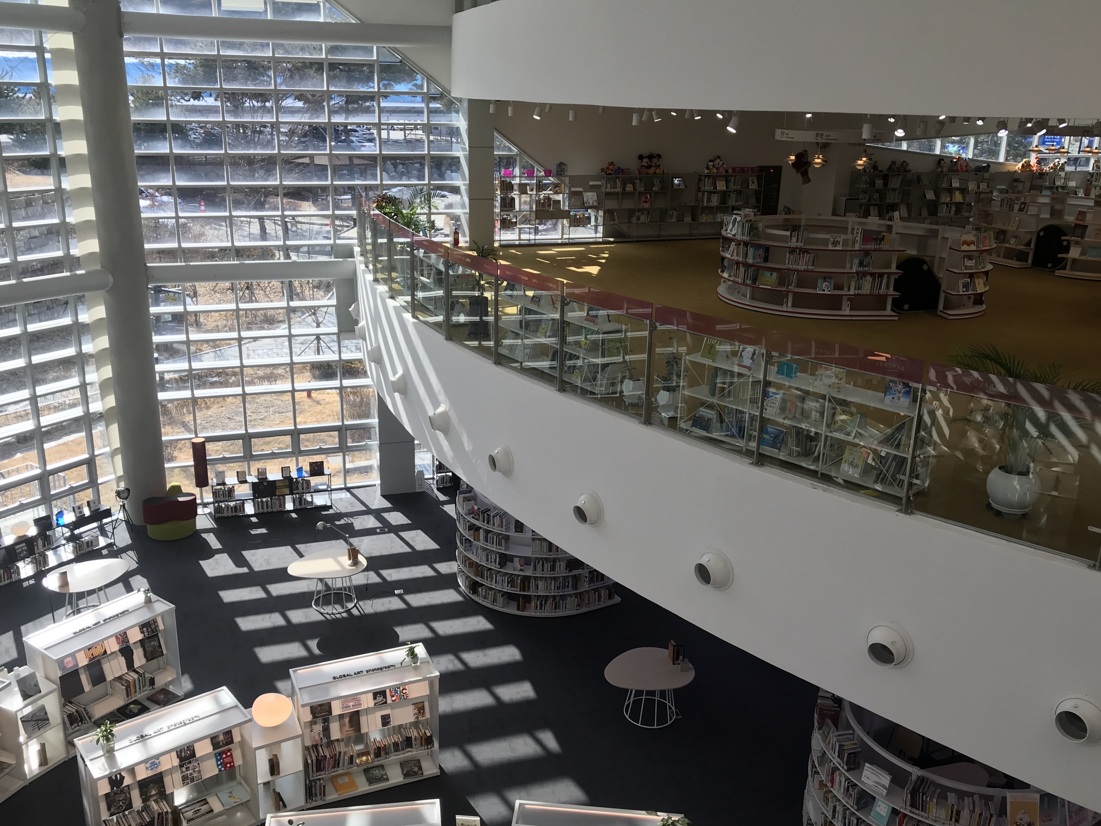 하얀 책장은 일반적인 도서관처럼 높고 다닥다닥 붙어있는 형태가 아니어서 갤러리를 둘러보듯 편안한 느낌이 들어요. 벽면 서가를 제외하고 높지 않은 반투명 아크릴 소재로 제작하여 책 속에서 답답한 느낌이 들지 않도록 배치되어 있답니다.