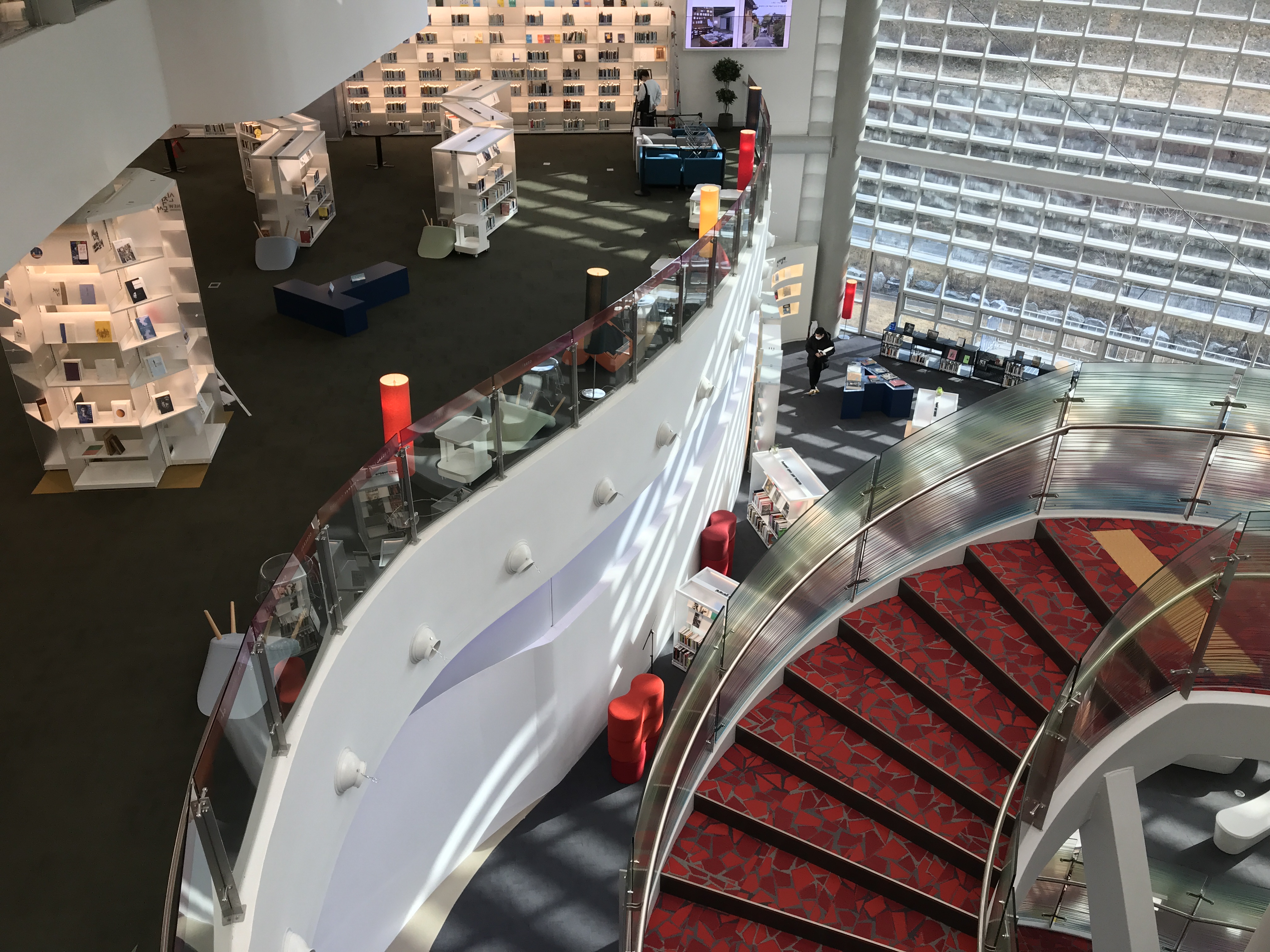 의정부 미술도서관의 외관부터 내부까지 쉽게 찾아볼 수 있는 일관된 특징은 바로 수많은 곡선이에요. 이러한 곡선미가 응축된 곳은 로비로 들어서자마자 만나게 되는 중앙 원형 계단입니다. 도서관 내 모든 공간과 연결한 이 계단은 회오리치듯 나선형의 모습을 하고 있어요. 계단은 건물 내부의 다양한 곡선들과 만나 물결이 흐르는 듯한 느낌을 내고 있답니다.
