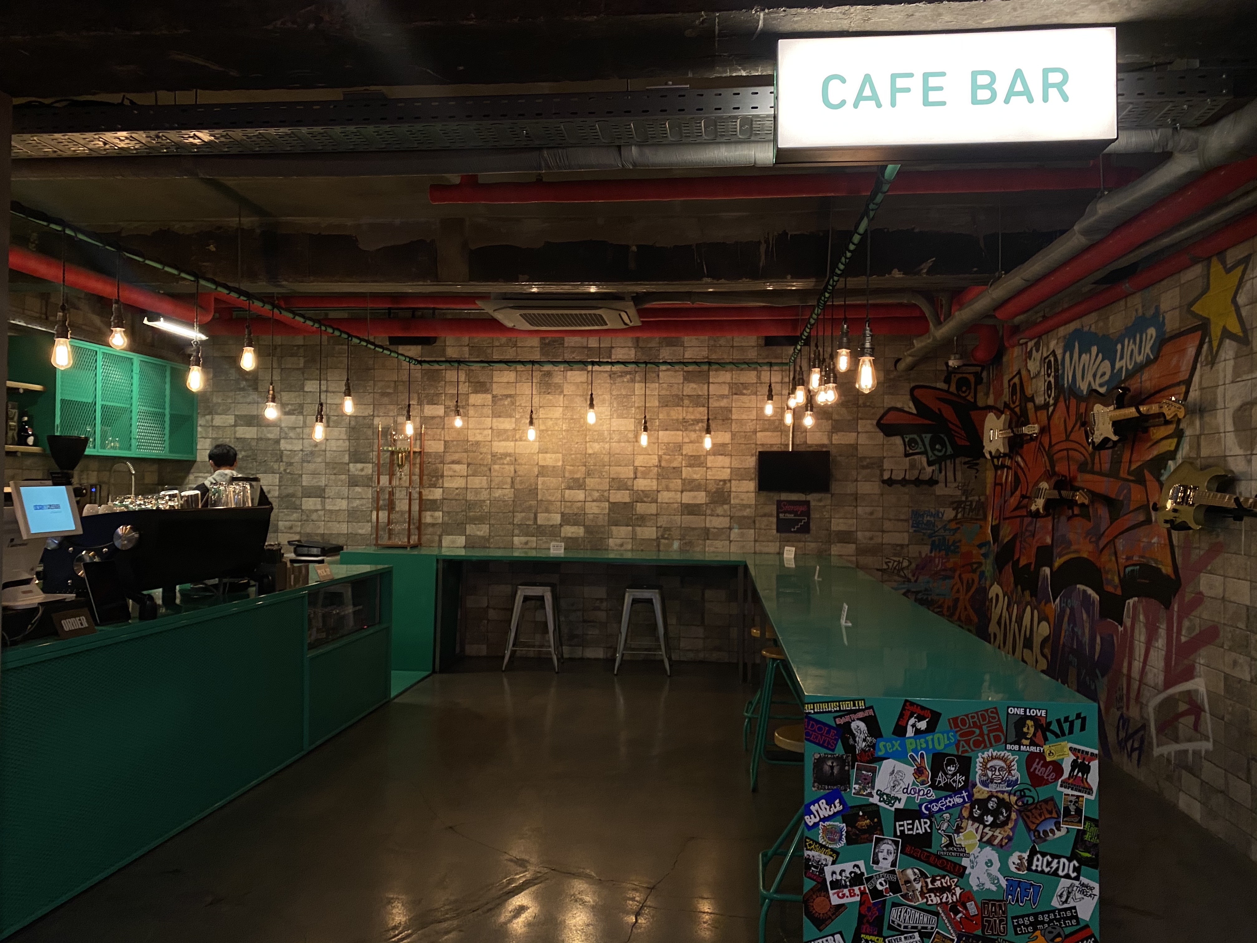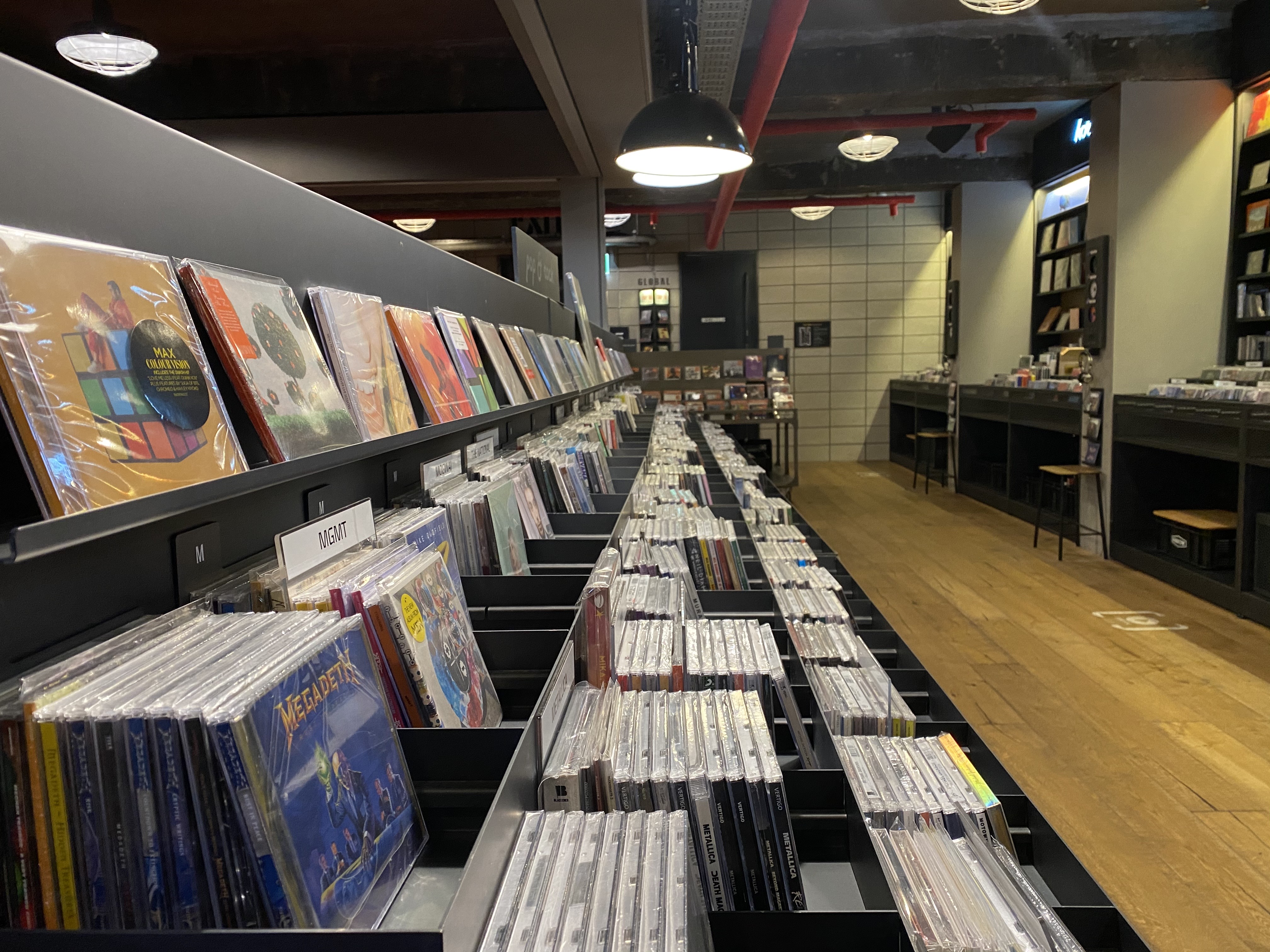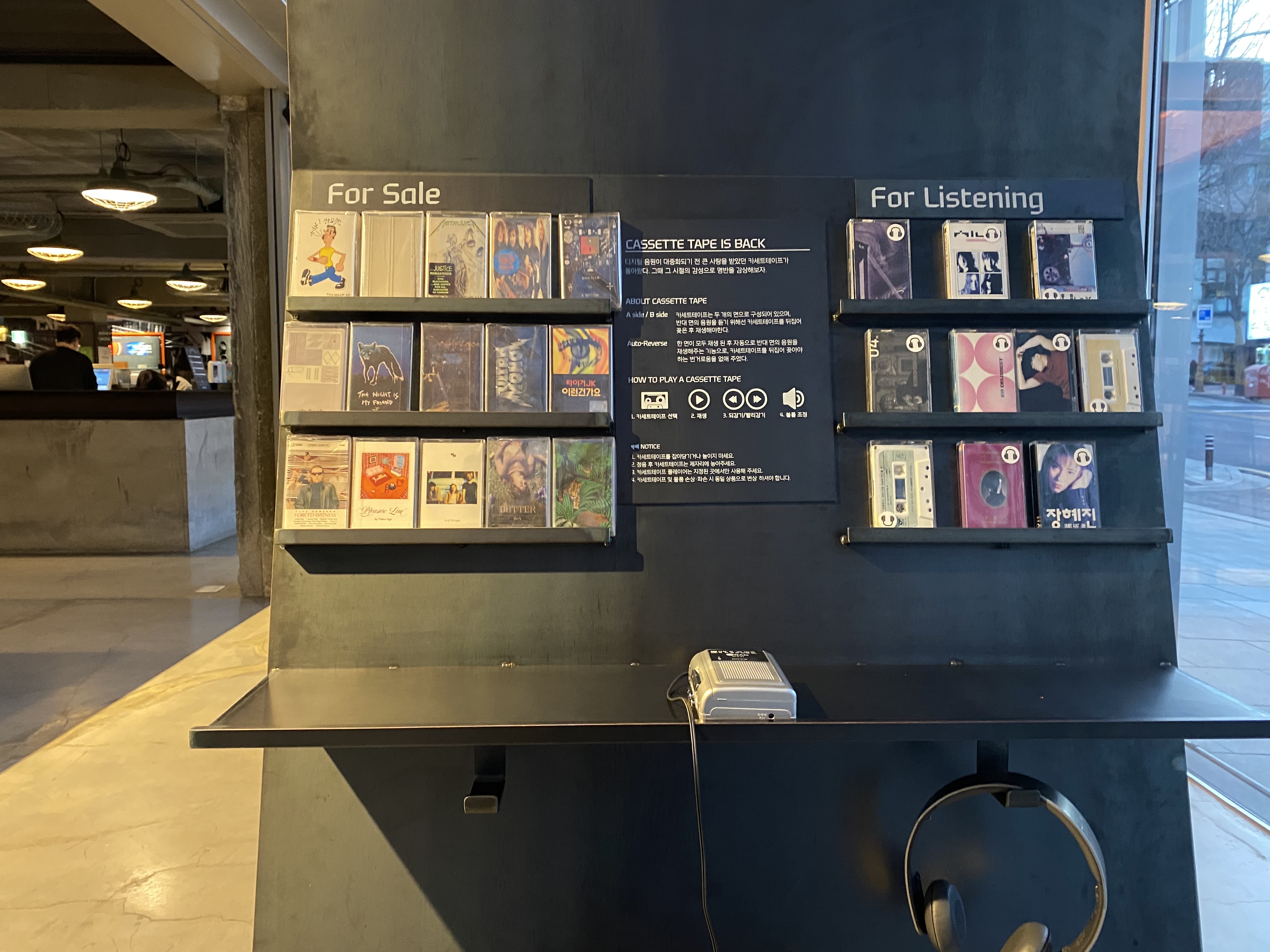 1층이 바이닐 중심이었다면, 2층은 더 많은 CD가 진열되어 있고 벽면 또는 별도로 마련된 테이블에 앉아 청음이 가능해요. 역시나 한 칸씩 떨어져서 앉아야 하지만, 사람이 많지 않은 덕분에 한산하게 음악을 즐길 수 있었어요.